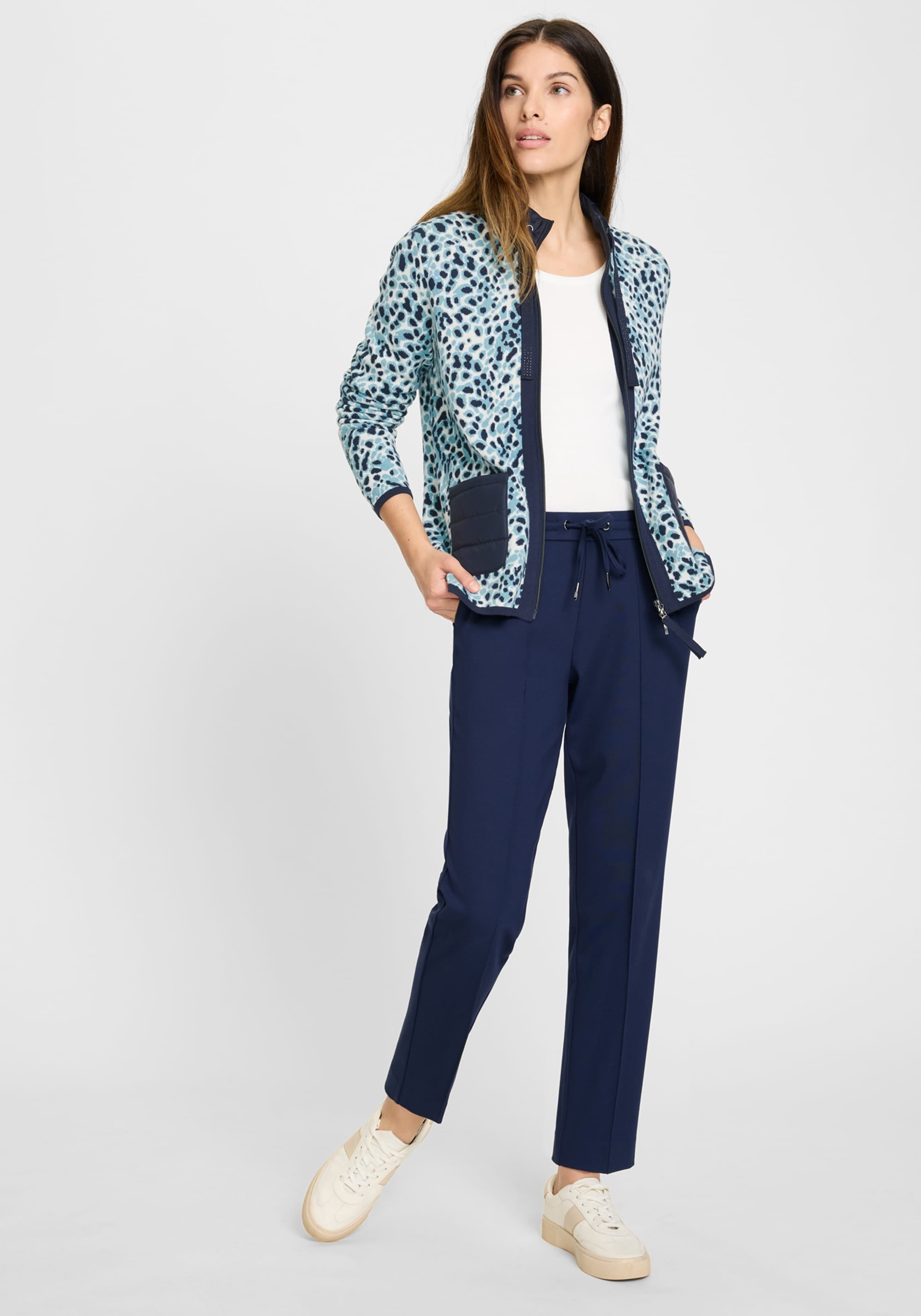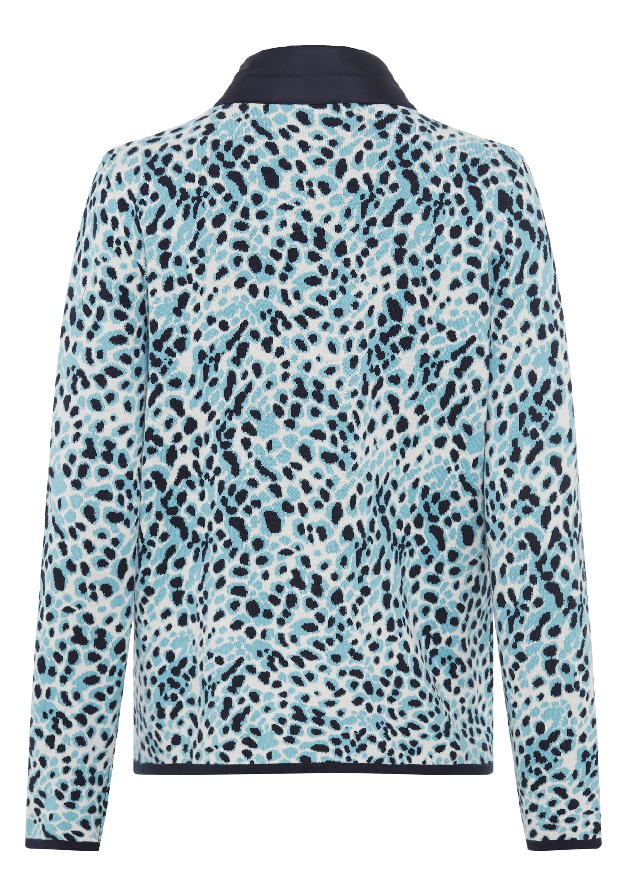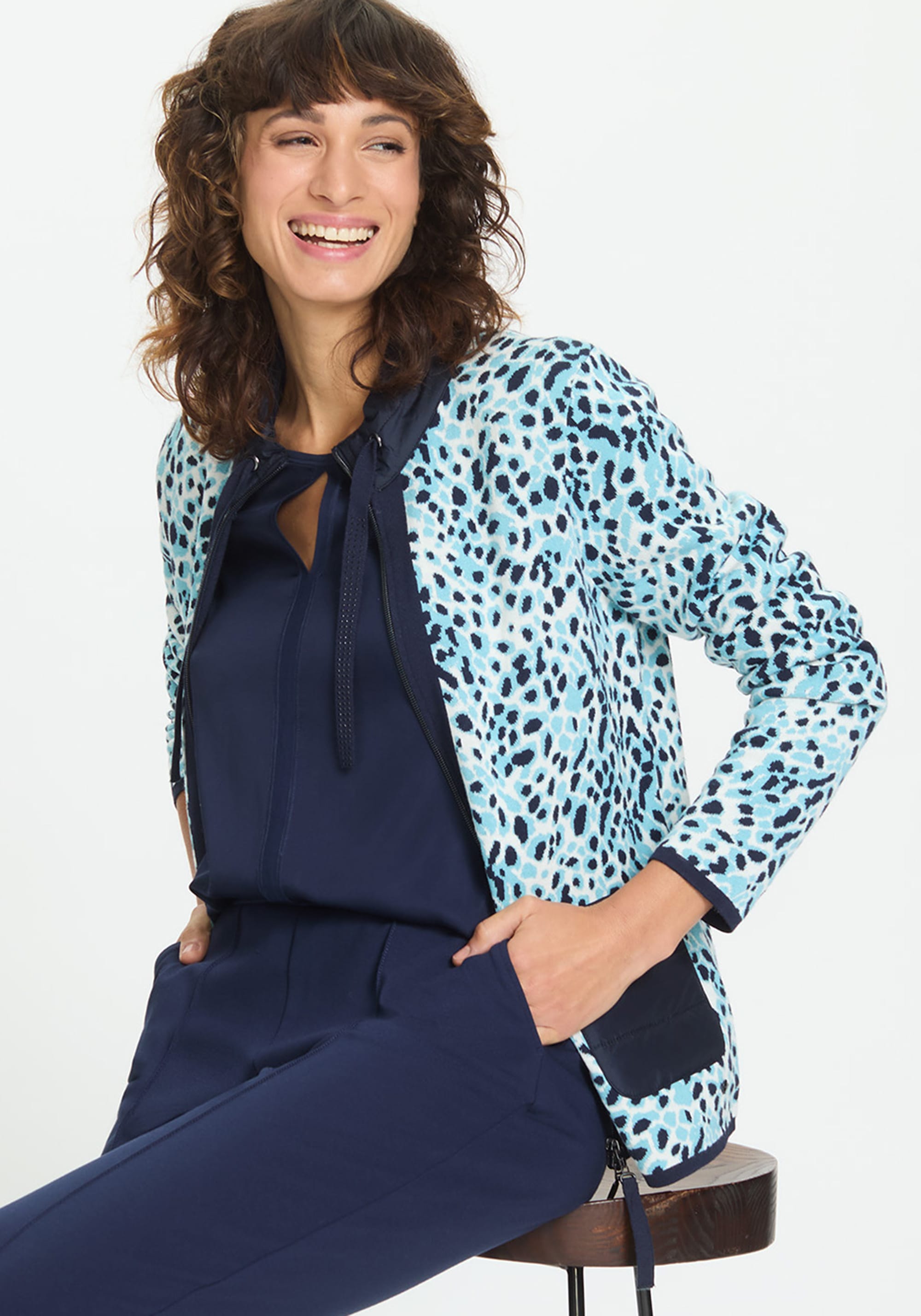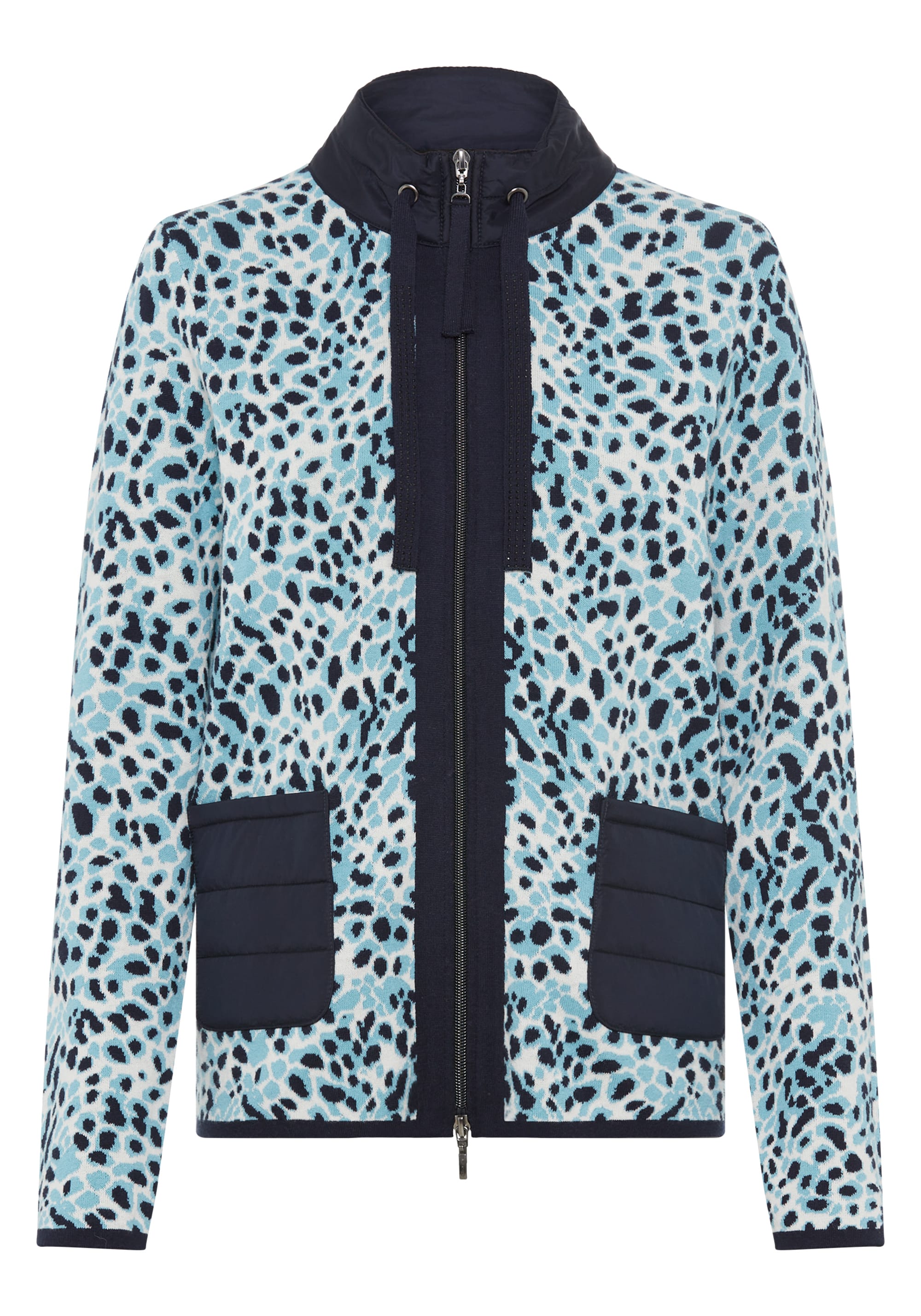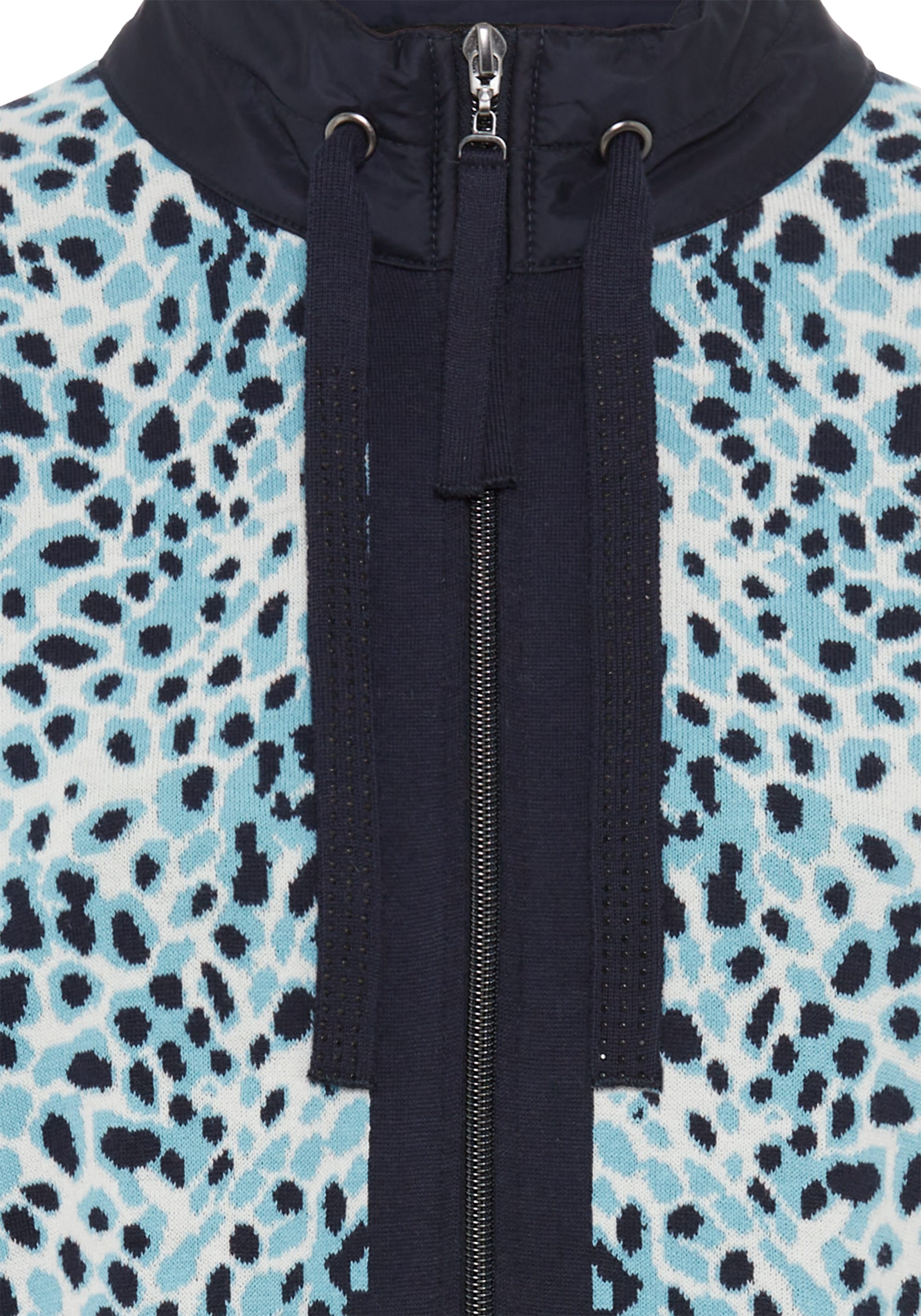 The modern animal pattern makes this stylish sweater jacket a standout piece, elevated by its mixed-media details like front pockets and a nylon collar with a functional drawstring.