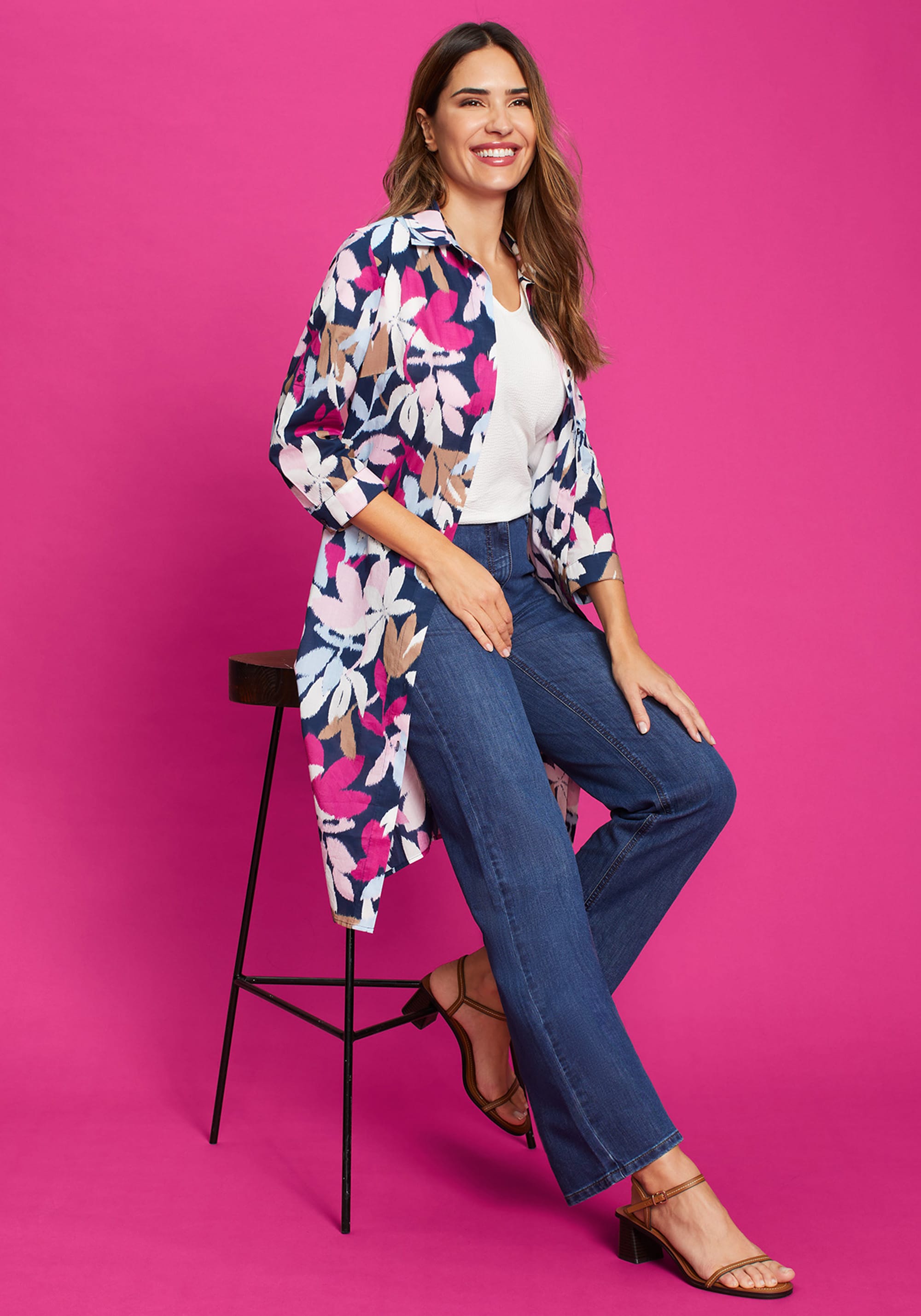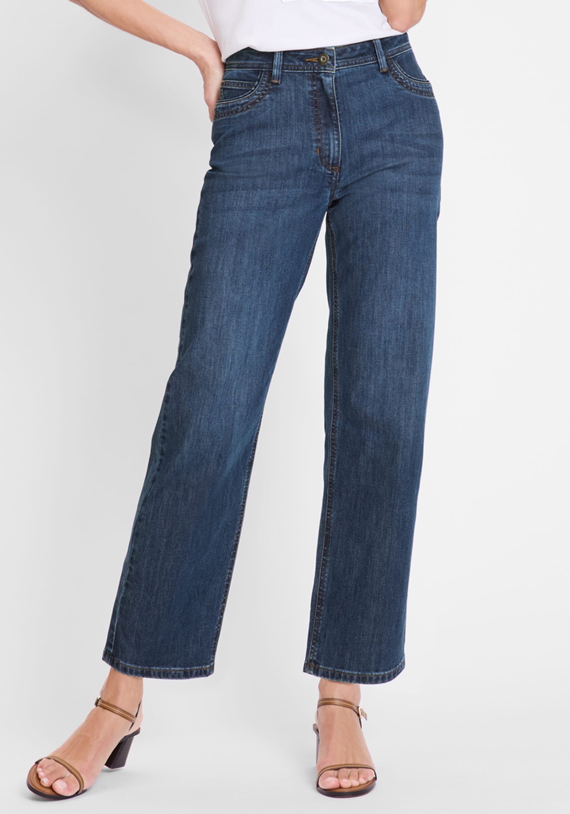 These jeans offer classic 5-pocket styling with allover stretch for all-day comfort and a trendy wide leg in a cropped length.