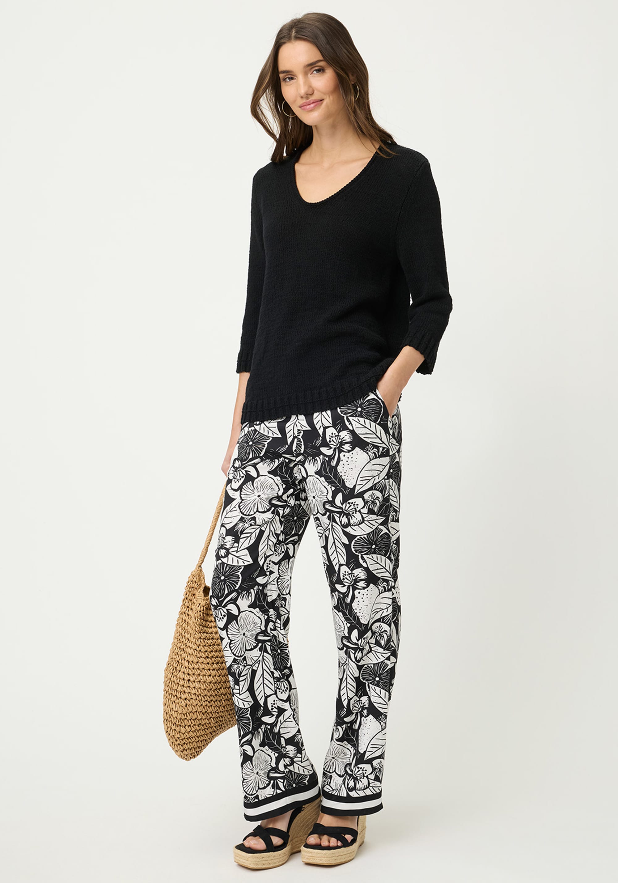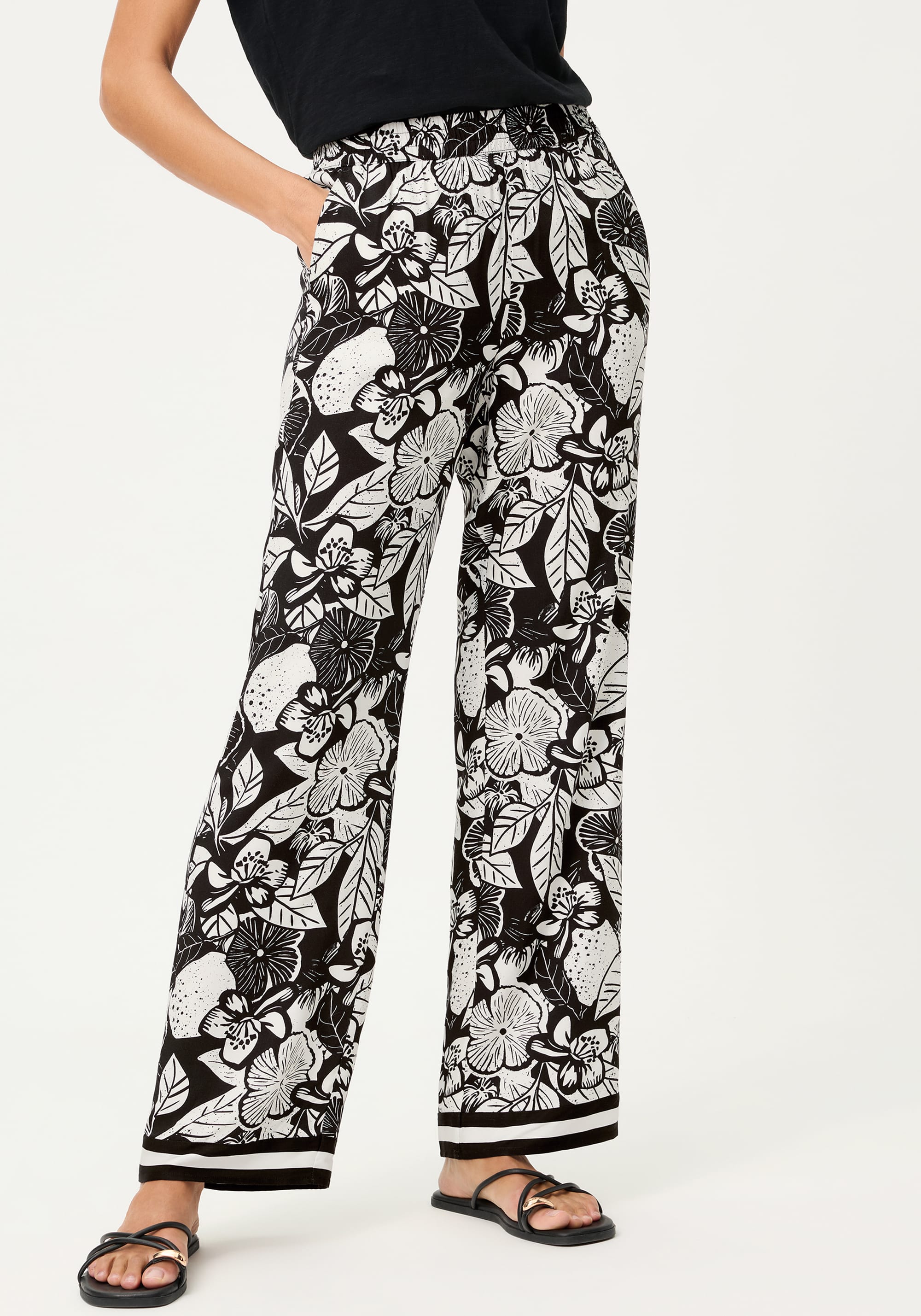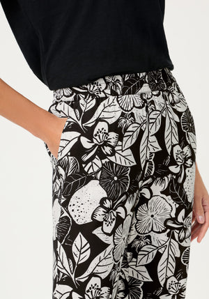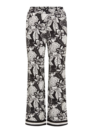 A statement wide-leg trouser designed to turn heads, featuring a bold black-and-off-white floral print with an airy, elegant drape.