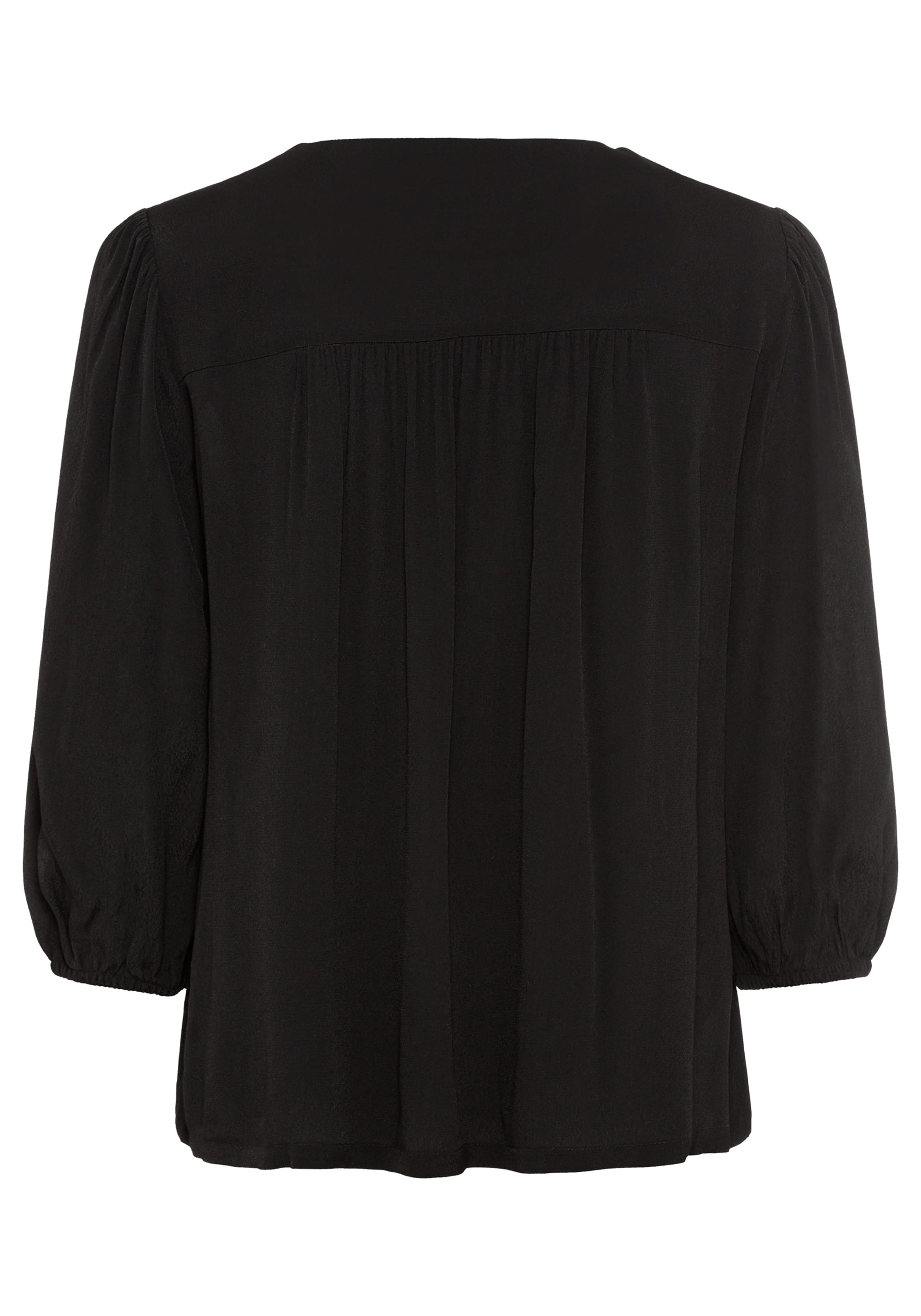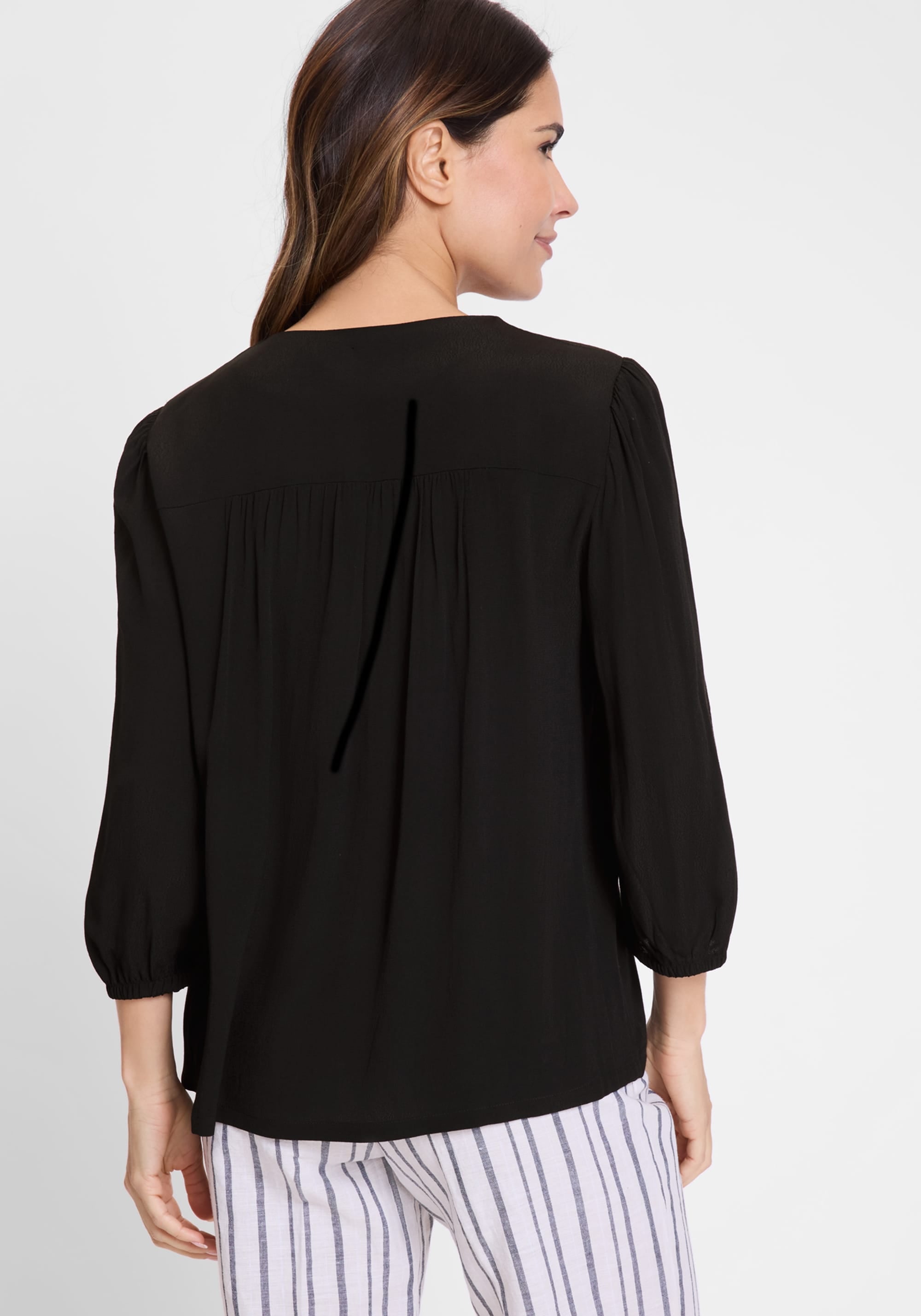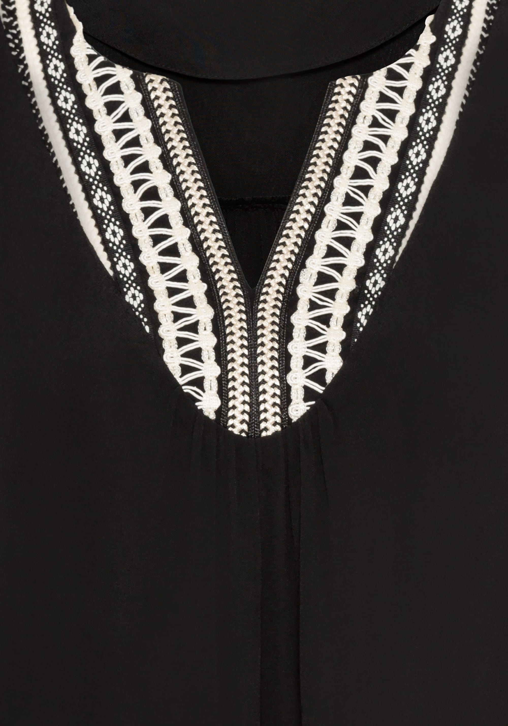 Timeless tunic details take center stage in this blouse, featuring an embroidered bib neckline and a cropped length.