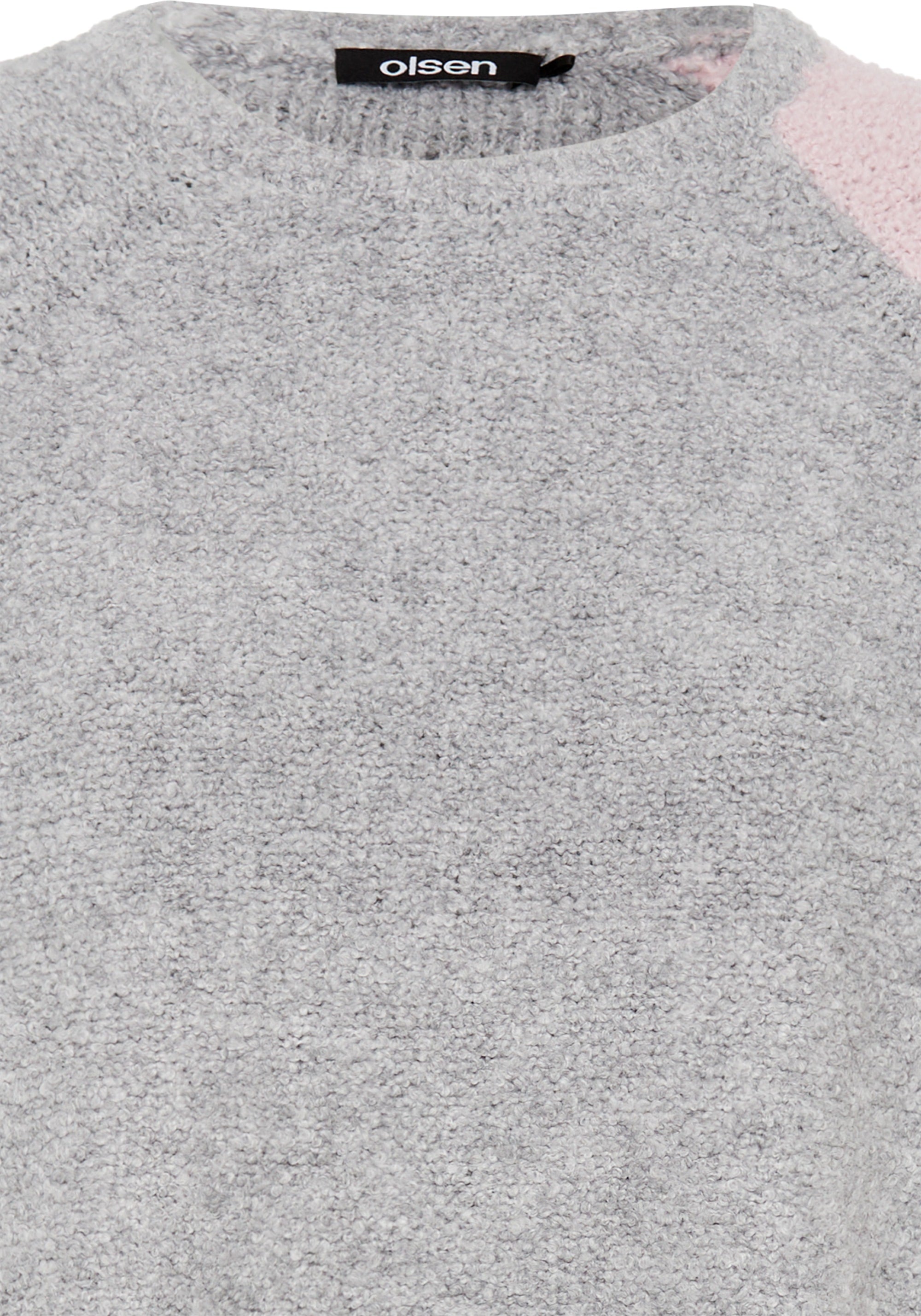Discover the cozy texture of boucle yarn in this modern sweater, which combines color blocking with subtle foil embellishments.