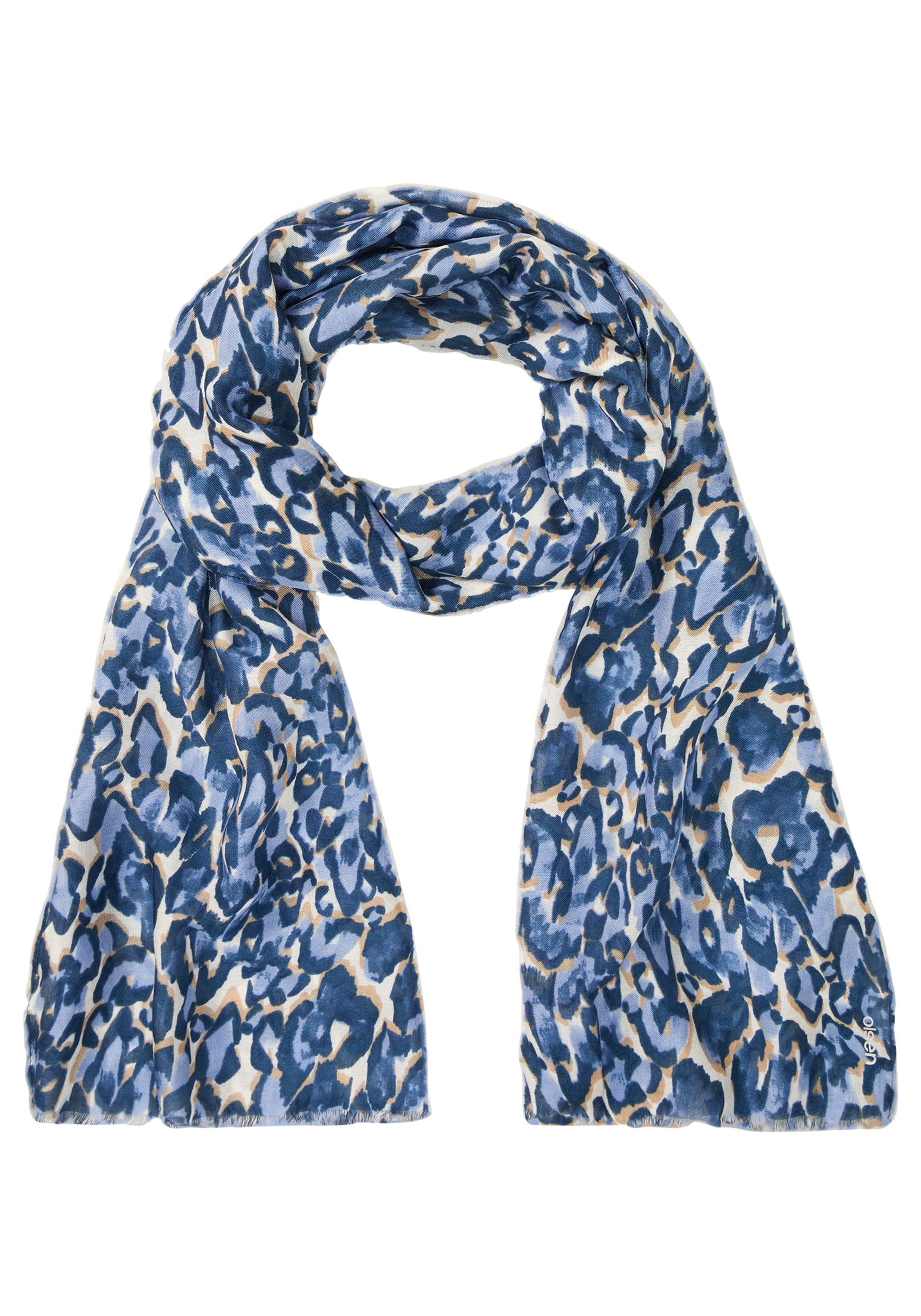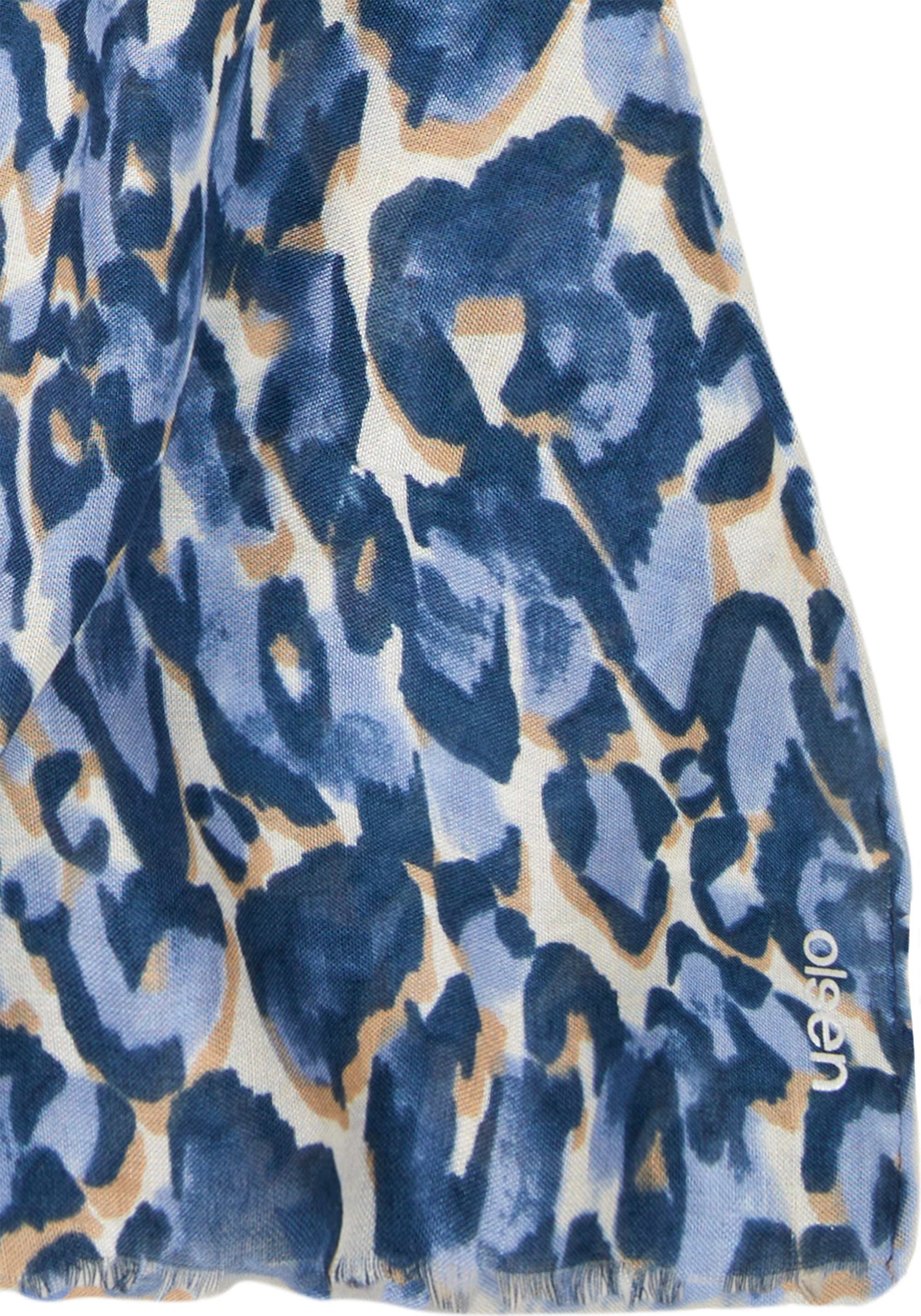 The striking abstract blue leopard print with gold accents completes this mid-size scarf with standout style.