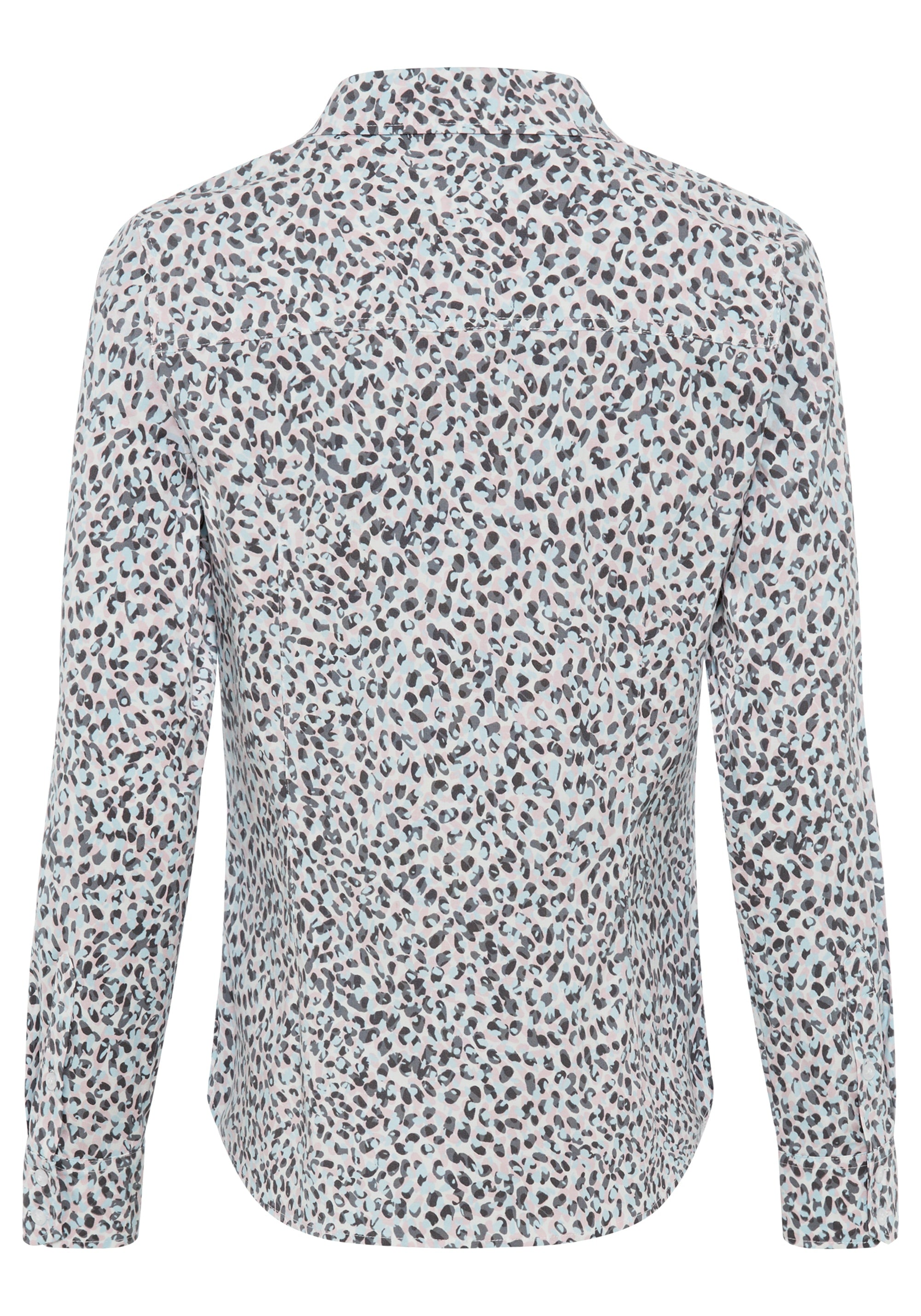 Classic shirt styling meets a funky leopard print in an unexpected color combination of pink and blue.