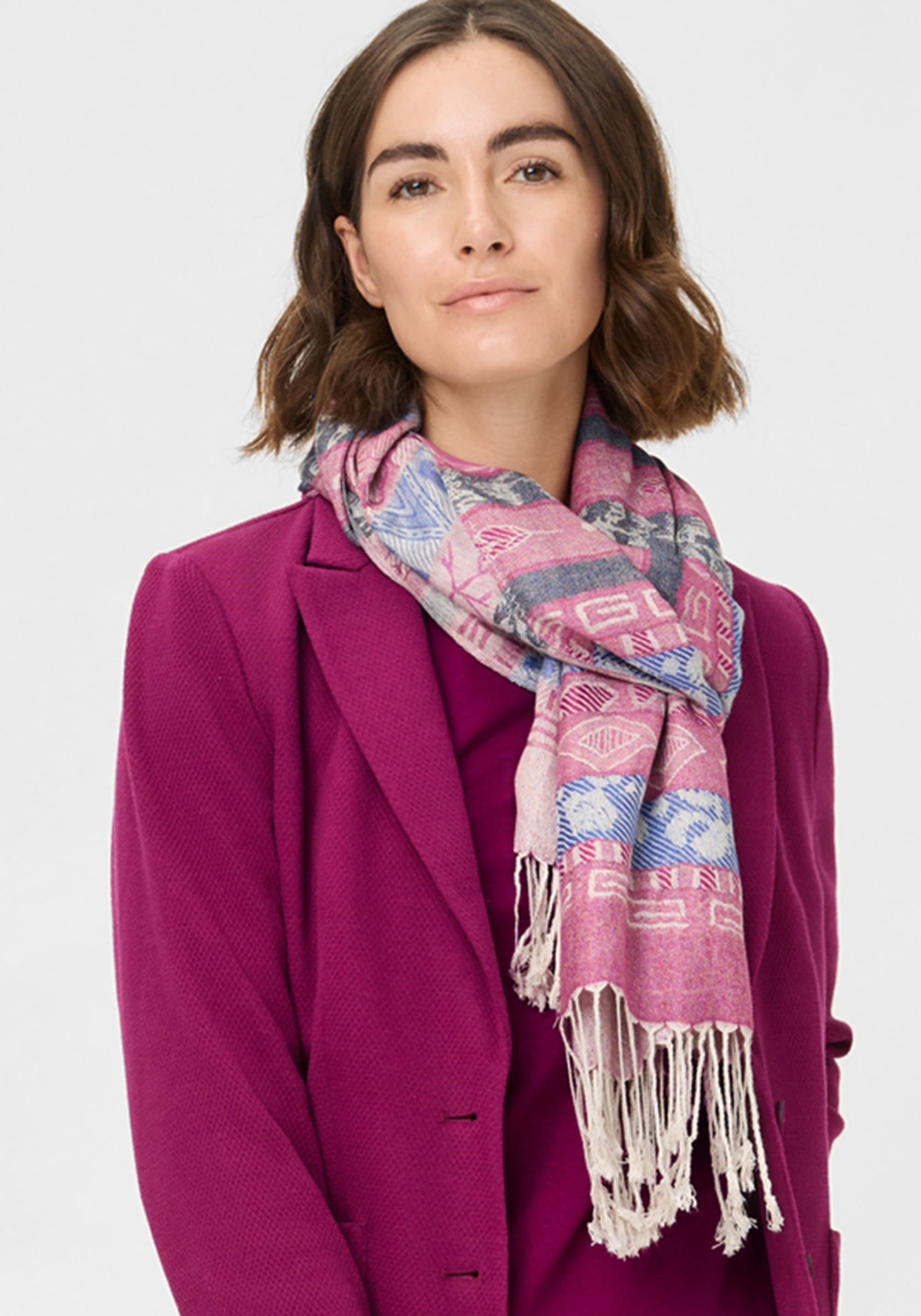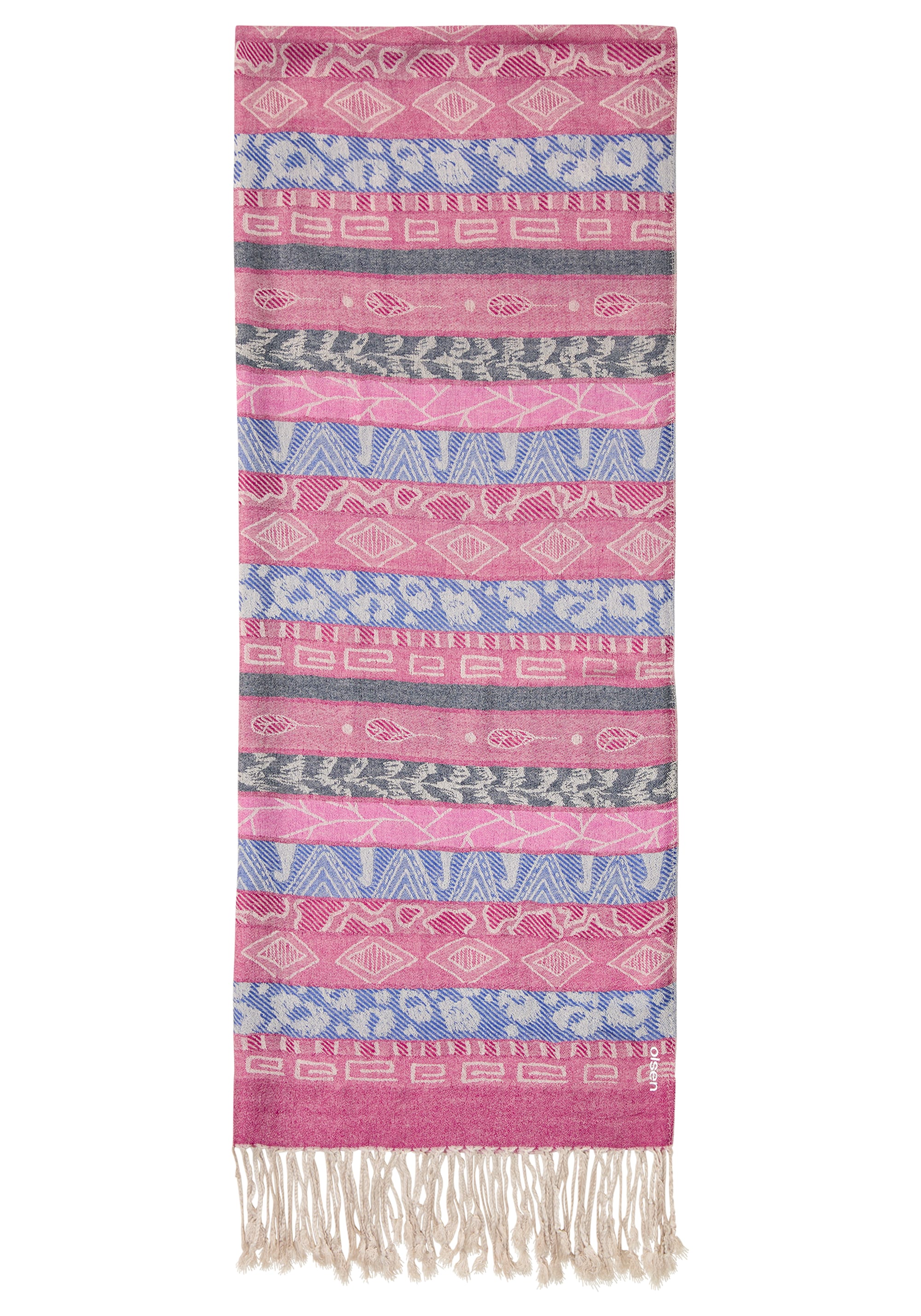 This midsize scarf features a variety of print motifs arranged in banded stripes.