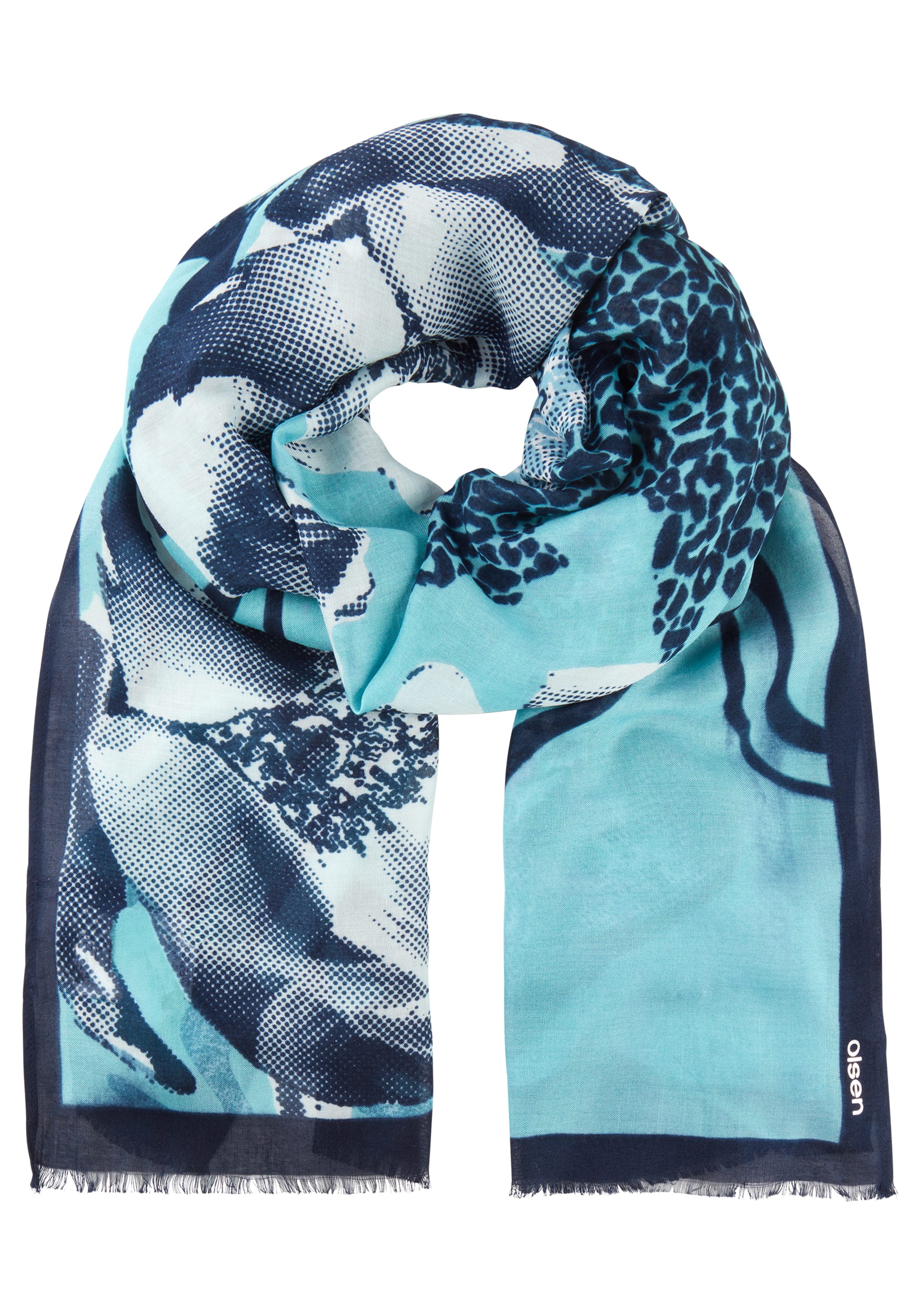 An abstract mix of prints creates a striking allover design on this lightweight, airy scarf.