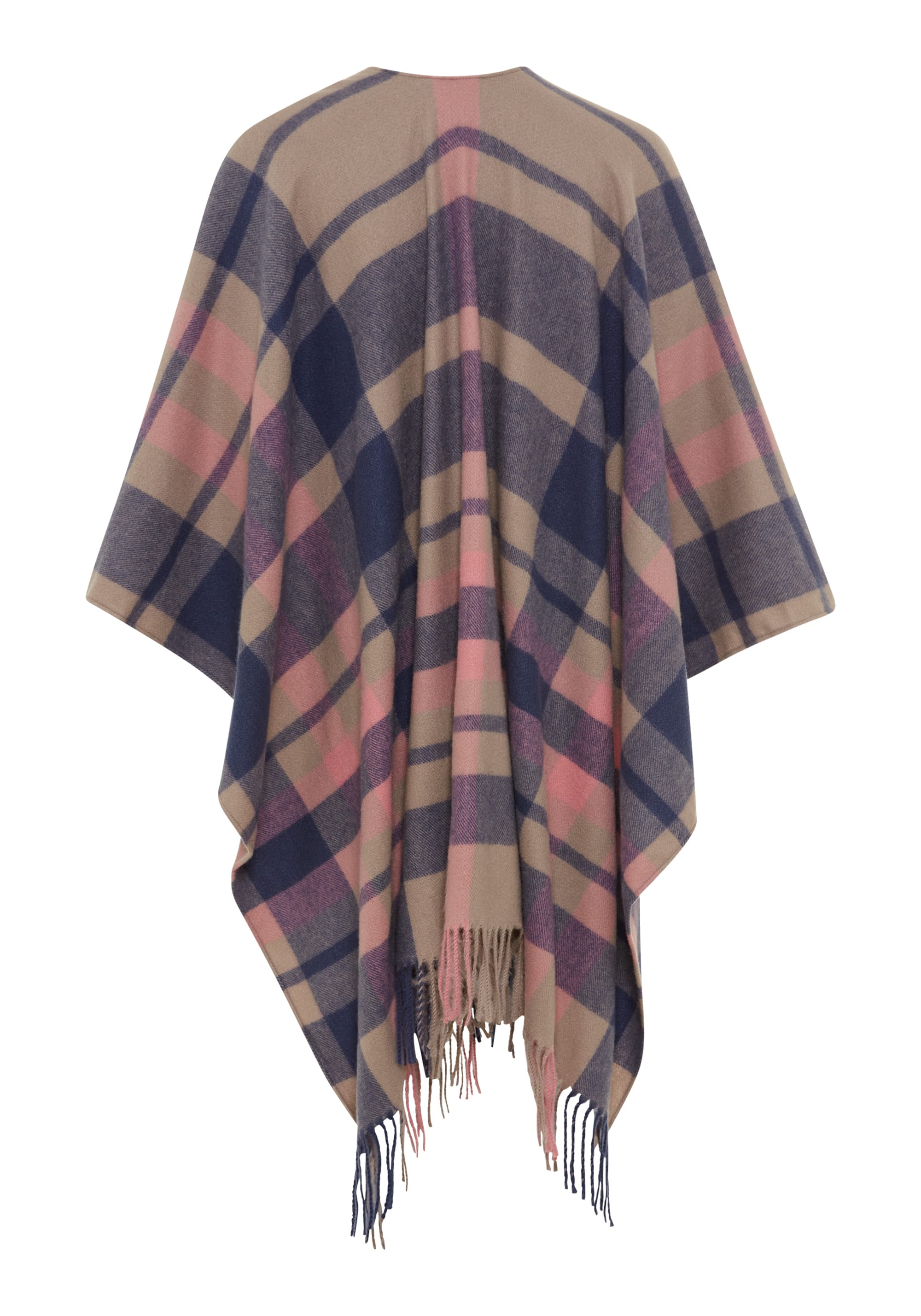 This cape features a large-scale plaid in harmonious shades of pink, blue, and taupe.