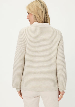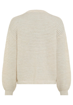 A modern cardigan with timeless appeal, defined by broad horizontal rib knitwork and a relaxed V-neck silhouette.