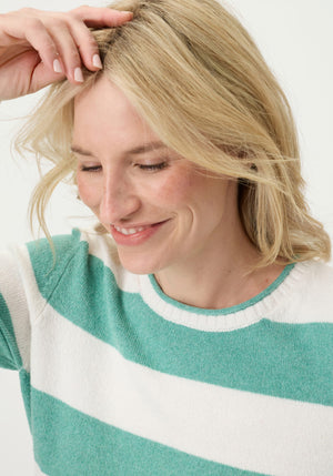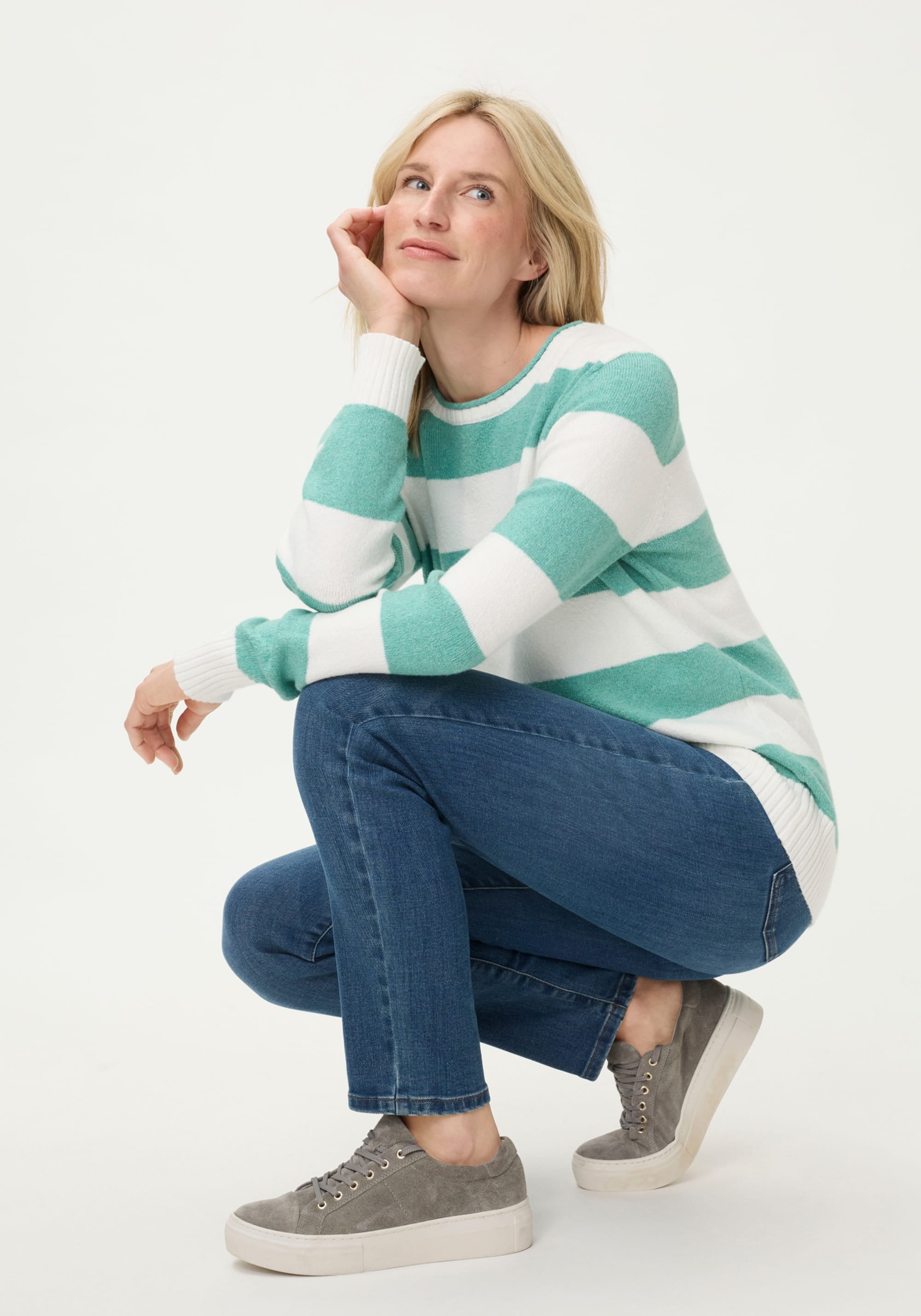 This sweater refreshes your wardrobe with bold stripes and a modern, sporty look.