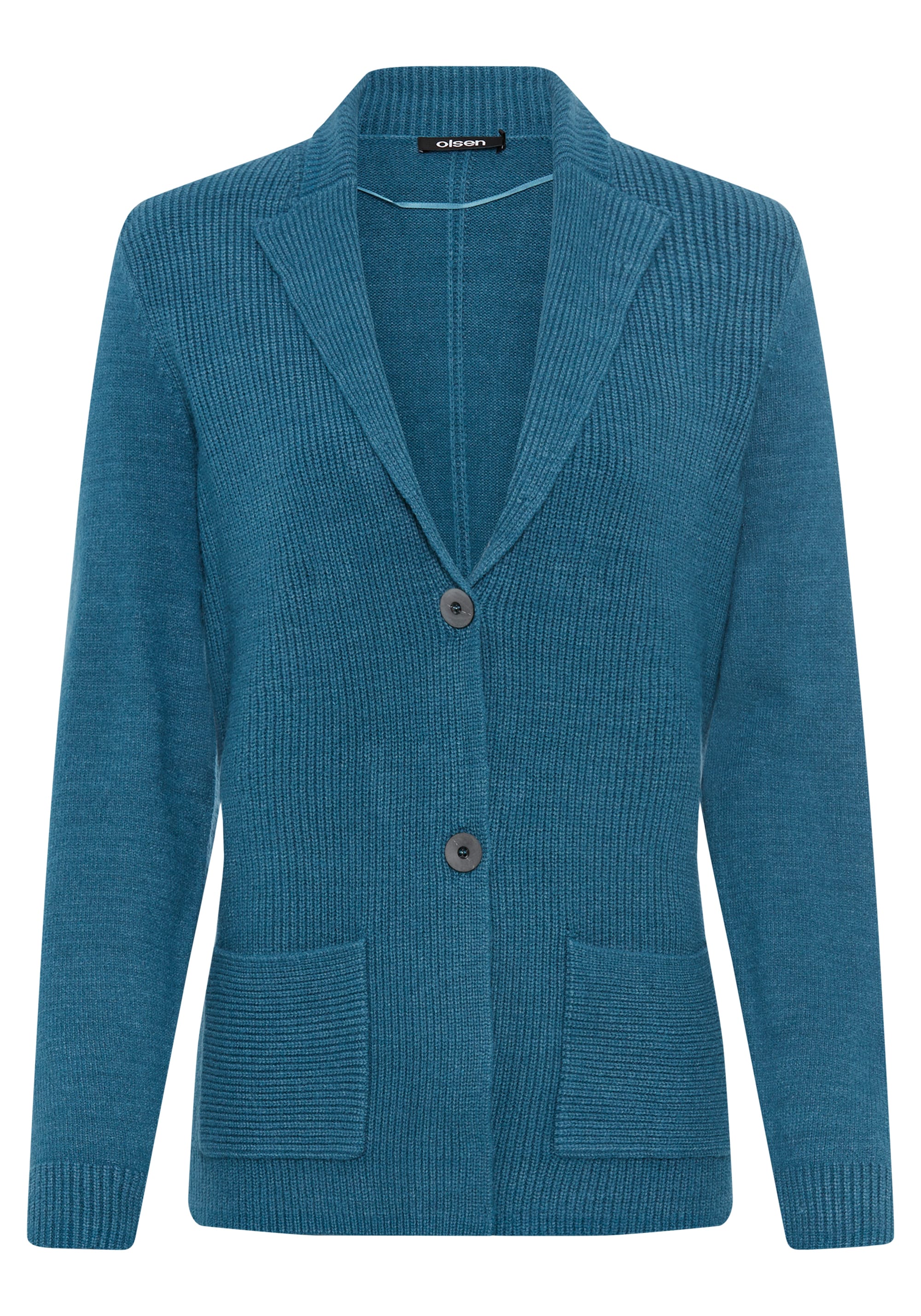 This piece blends the polished look of a blazer with the comfort of a sweater, crafted from a soft viscose yarn blend.