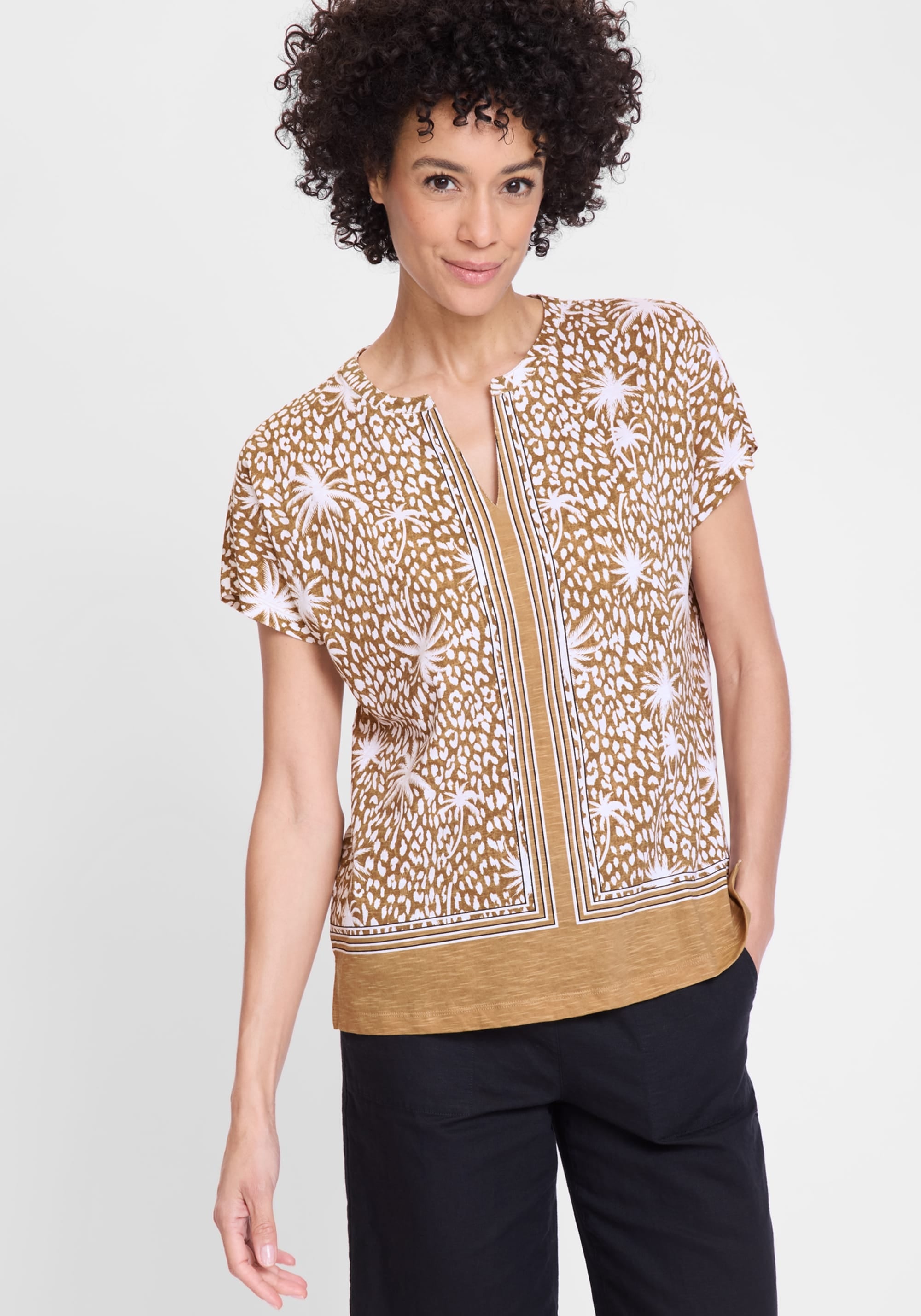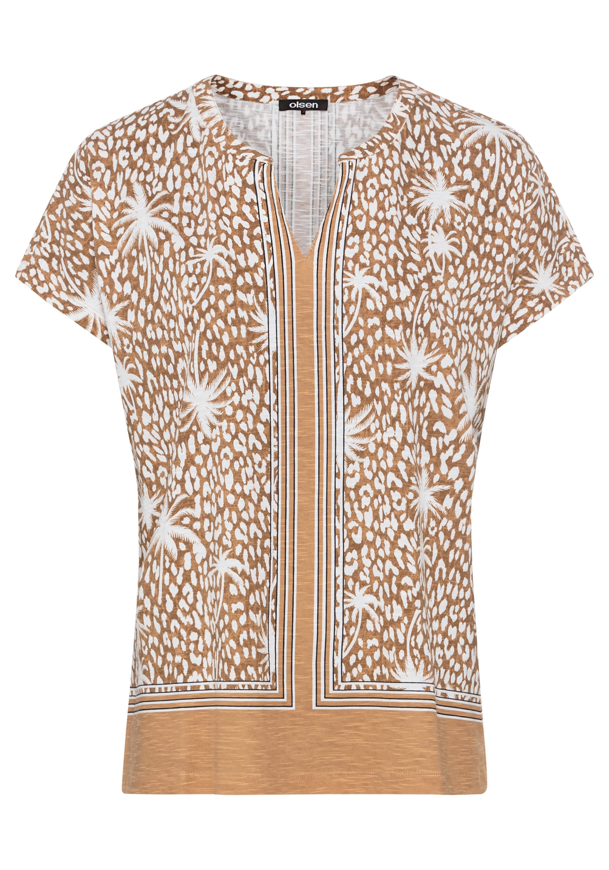 This shirt makes a bold fashion statement with its striking mix of modern animal and palm tree motifs, framed by a stylish border print.
