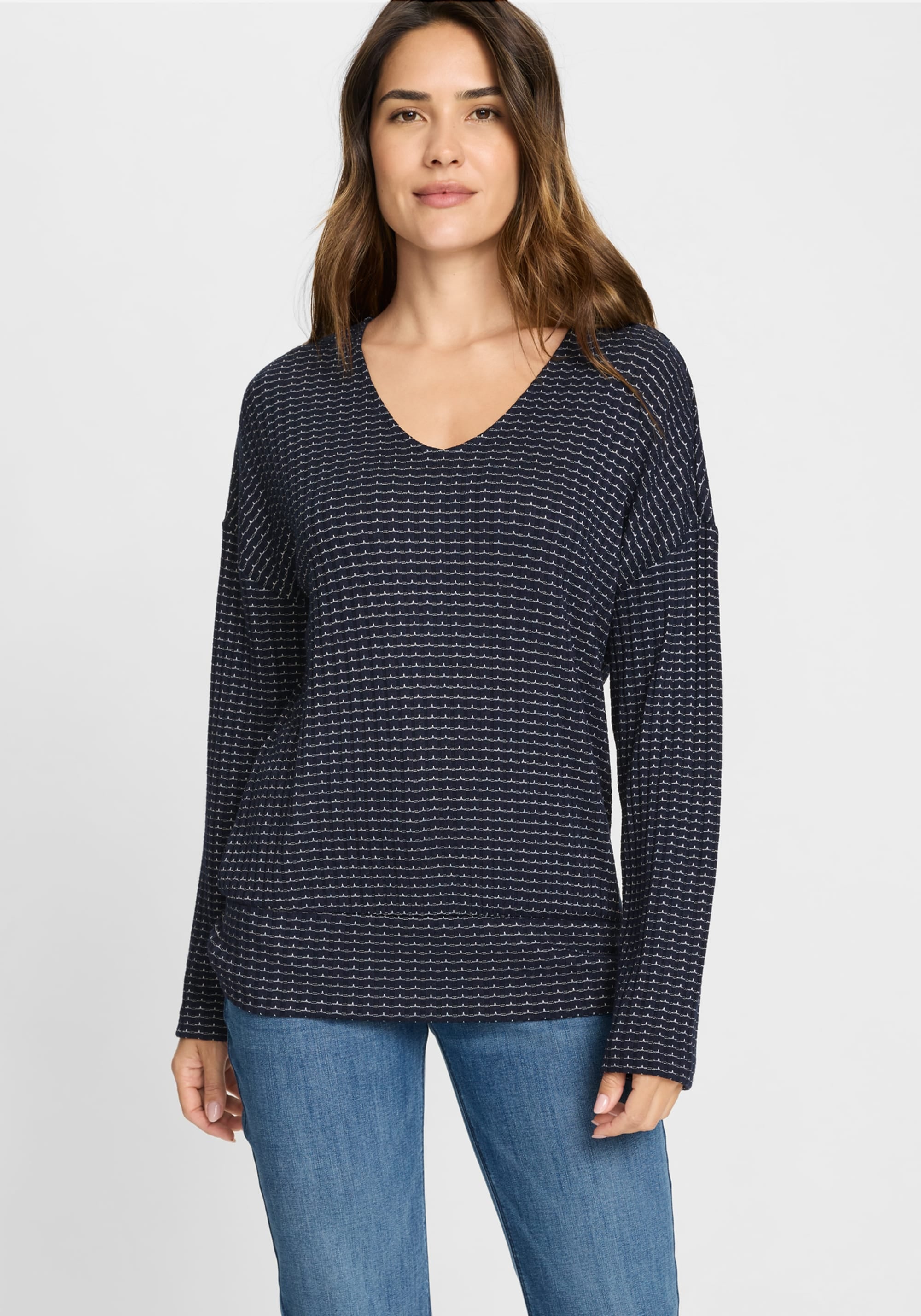 With an allover rib knit structure and a smooth, cool hand, this t-shirt wears like a blouse with medium weight and a touch of stretch for added comfort.