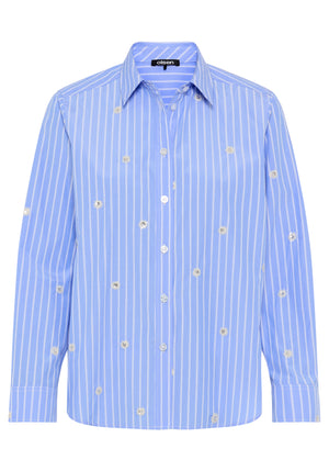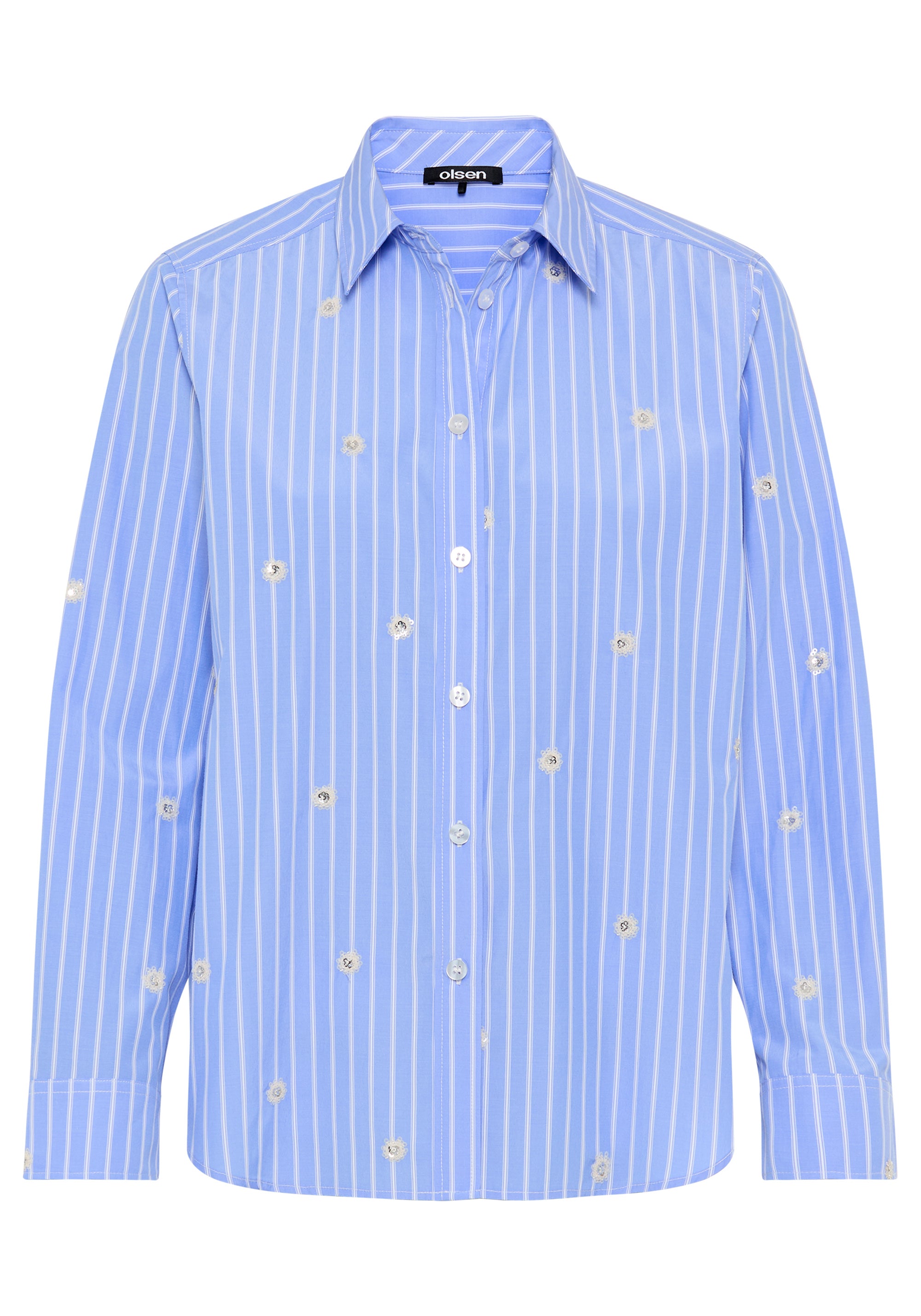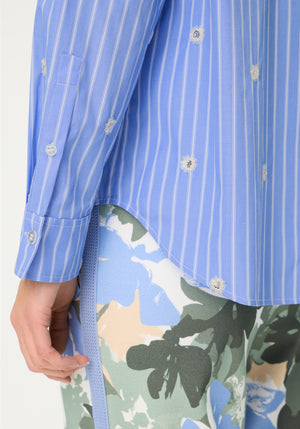 A classic striped shirt, elevated with feminine sparkle, this stylish blouse blends timeless tailoring with delicate sequin flower embellishment from front to back for effortless day-to-night appeal.
