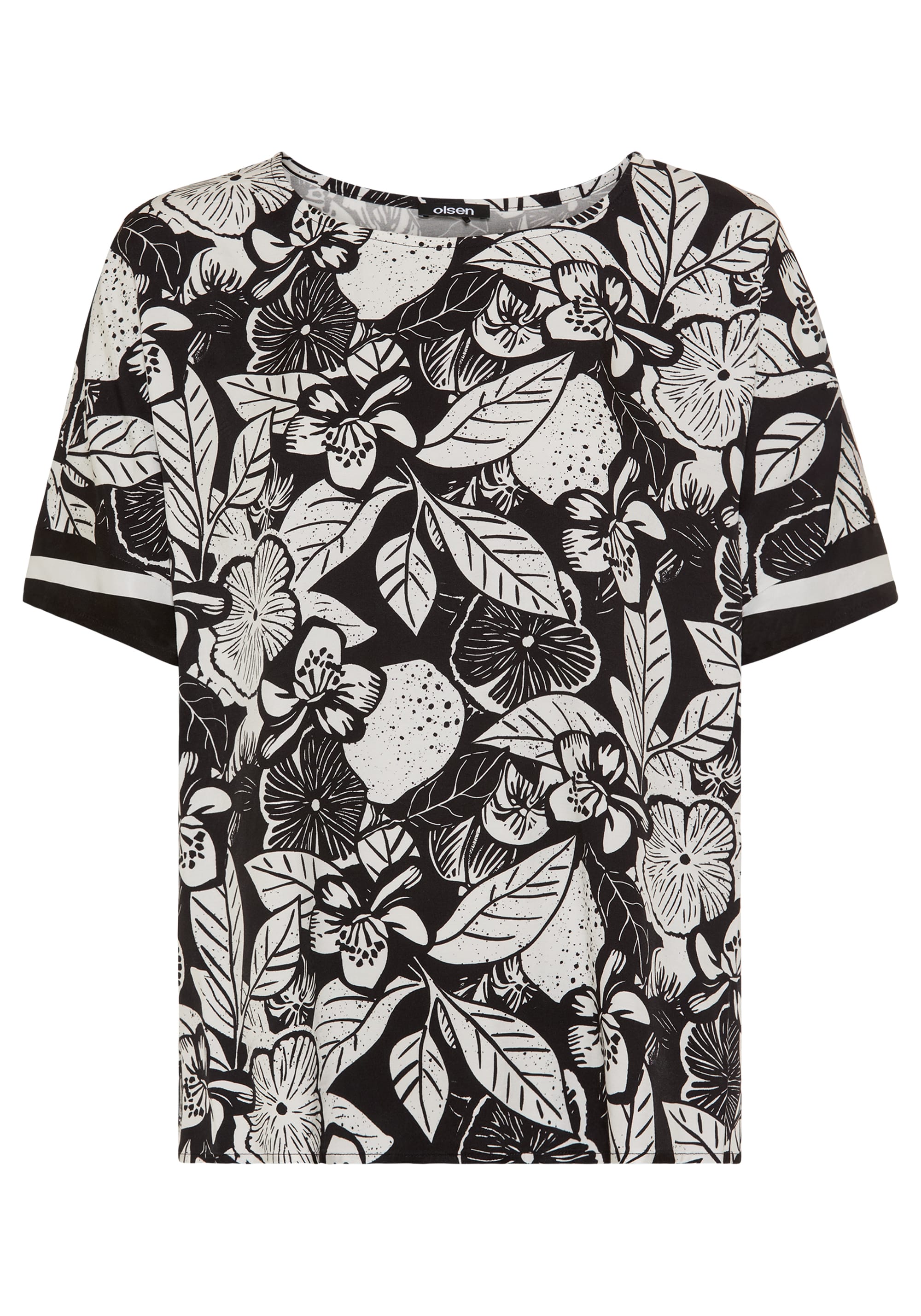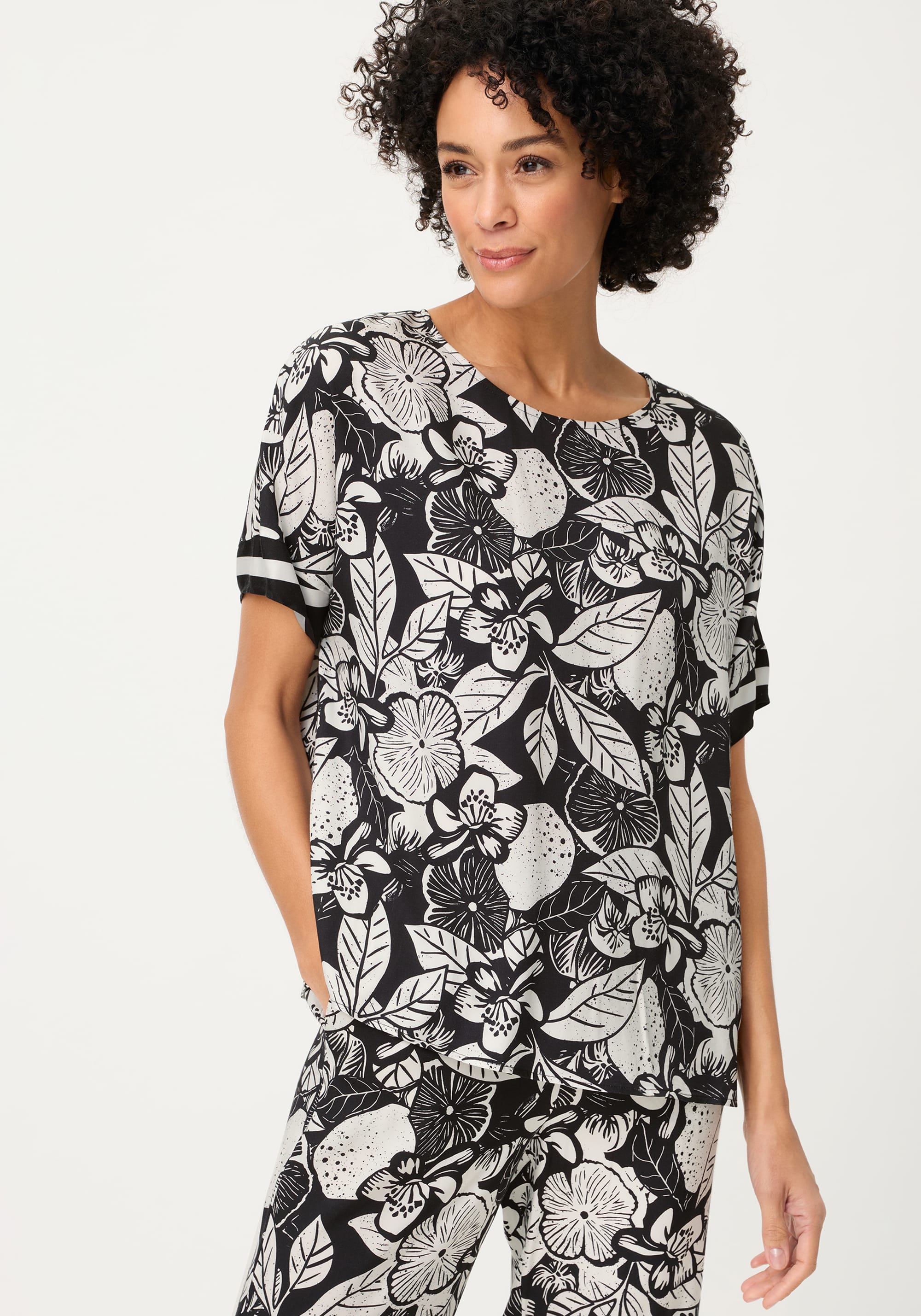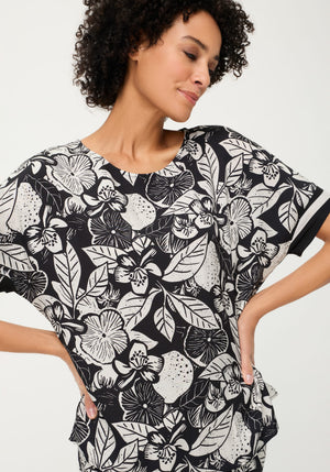 A lightweight, statement-making blouse defined by a bold black-and-off-white floral print, delivering a modern, feminine look with effortless impact.
