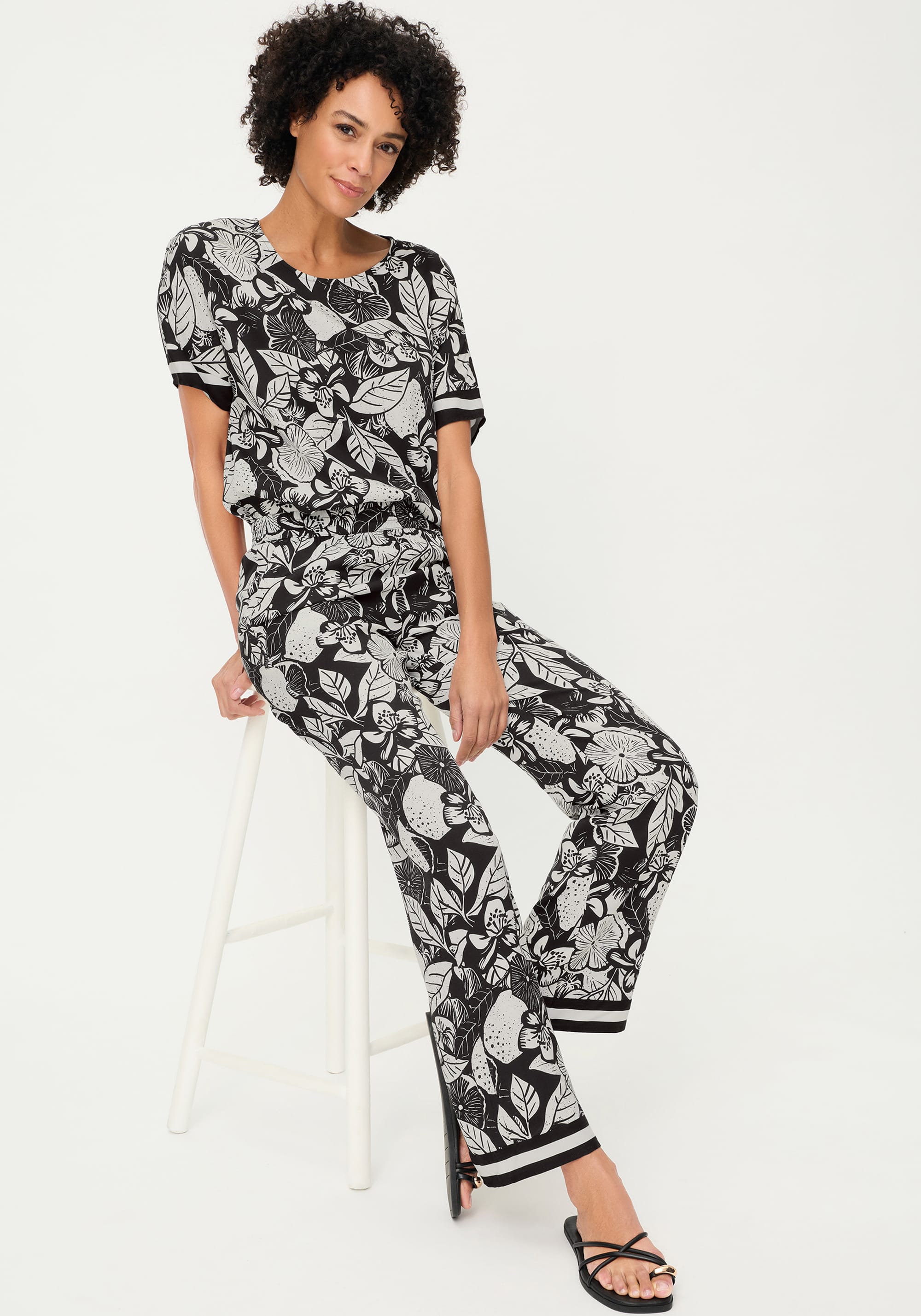 Une blouse légère et expressive, mise en valeur par un imprimé floral audacieux noir et écru, pour une allure moderne et féminine sans effort.