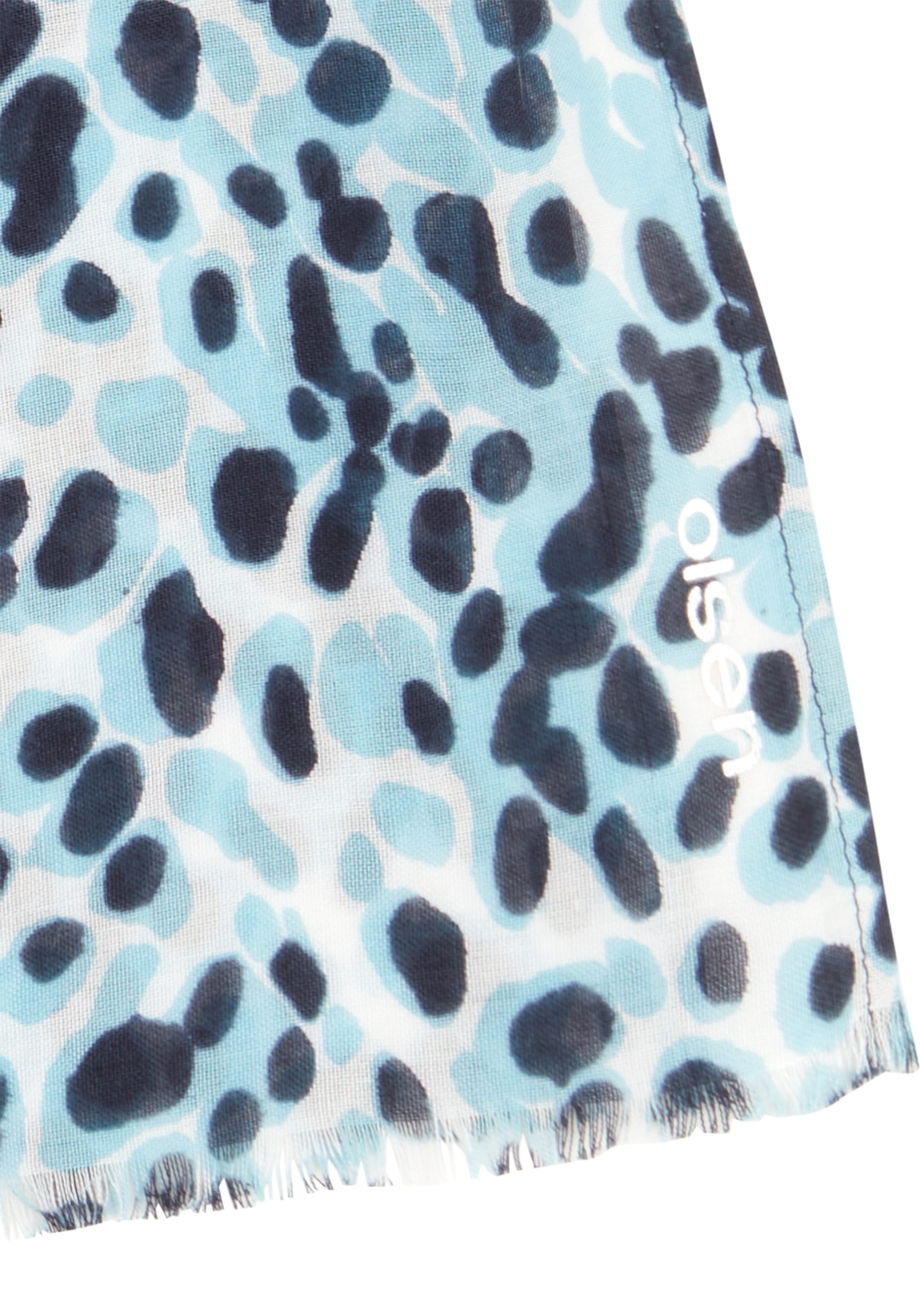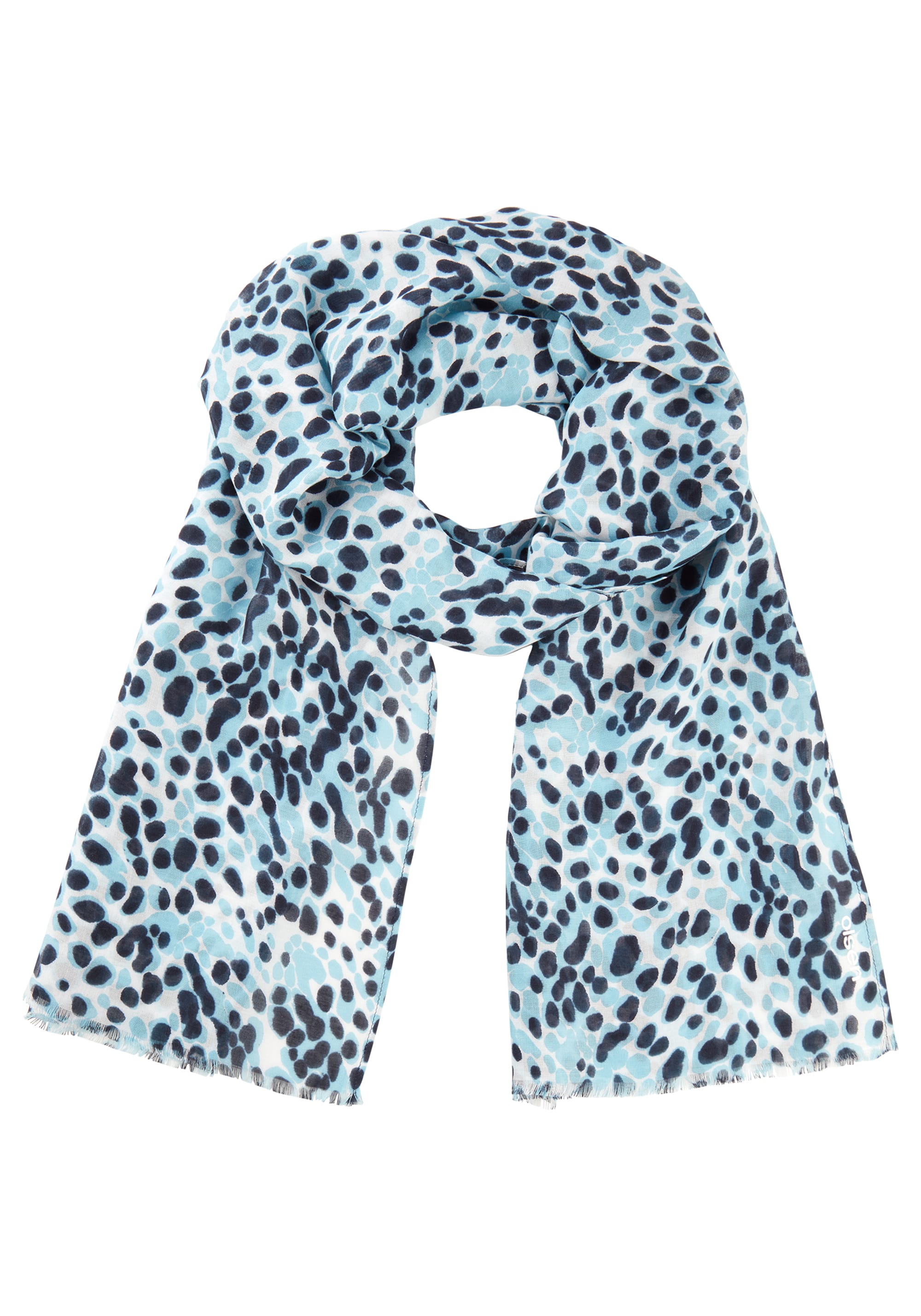 This scarf makes a bold statement with its allover modern animal print in striking shades of blue.