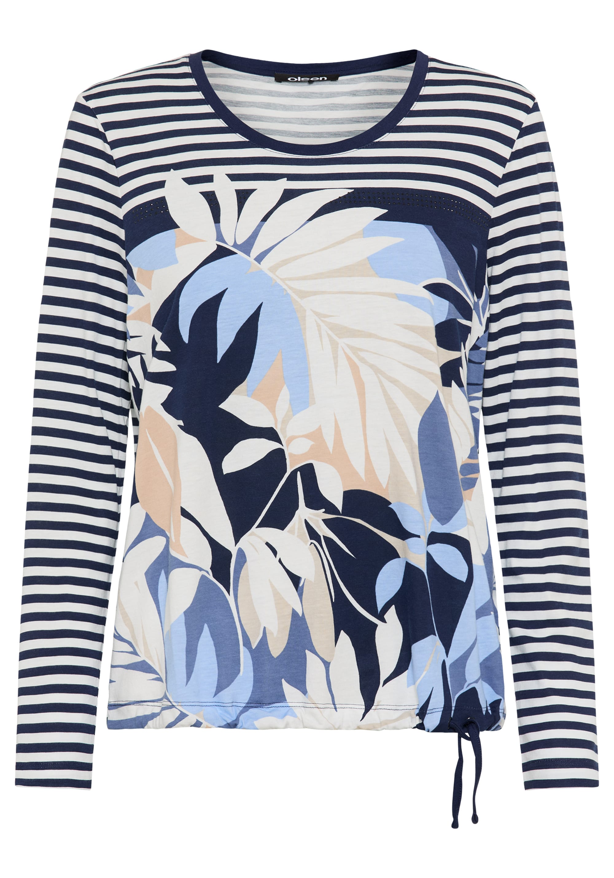 A modern, feminine standout, this long-sleeved shirt features a sophisticated panel design, tonal rhinestone accents, and a bold mix of stripes and palm print for effortless style.