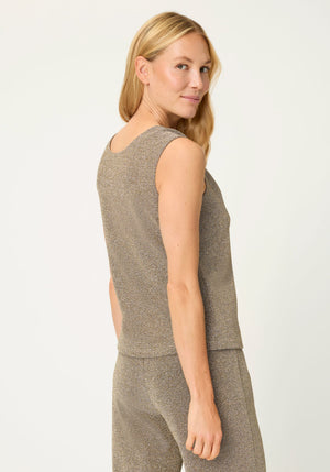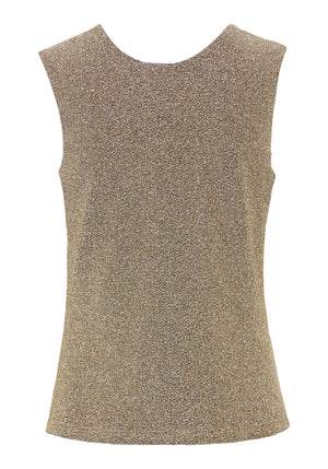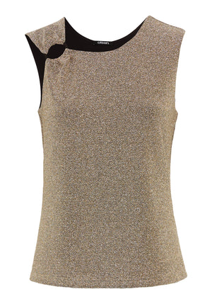 Crafted in a stretch-friendly fabric with shimmering metallic shades, this sleeveless shell is designed to make a statement.