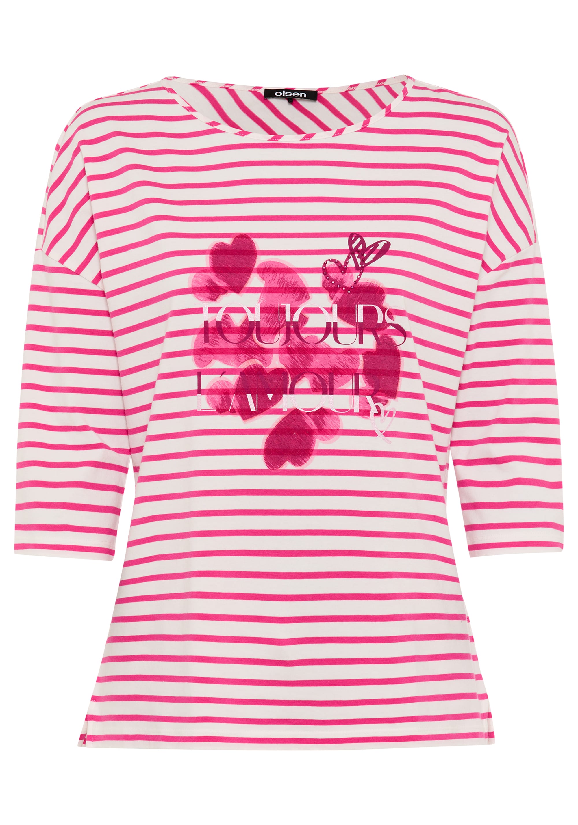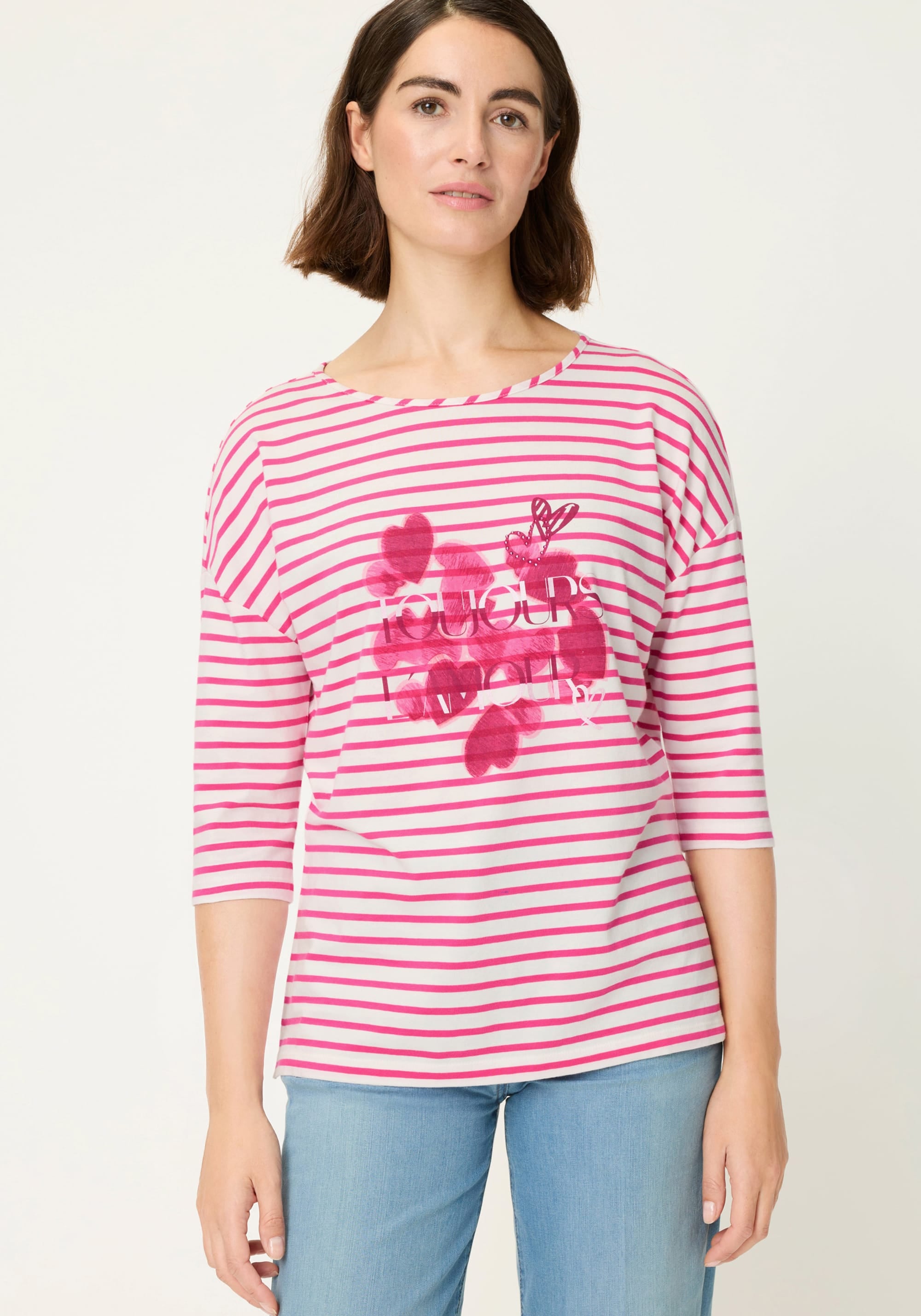 A stylish everyday statement, this striped T-shirt features a heart placement print at the centre, finished with subtle sheen, sparkling rhinestone trim, and Toujours L’Amour lettering for a glamorous touch.