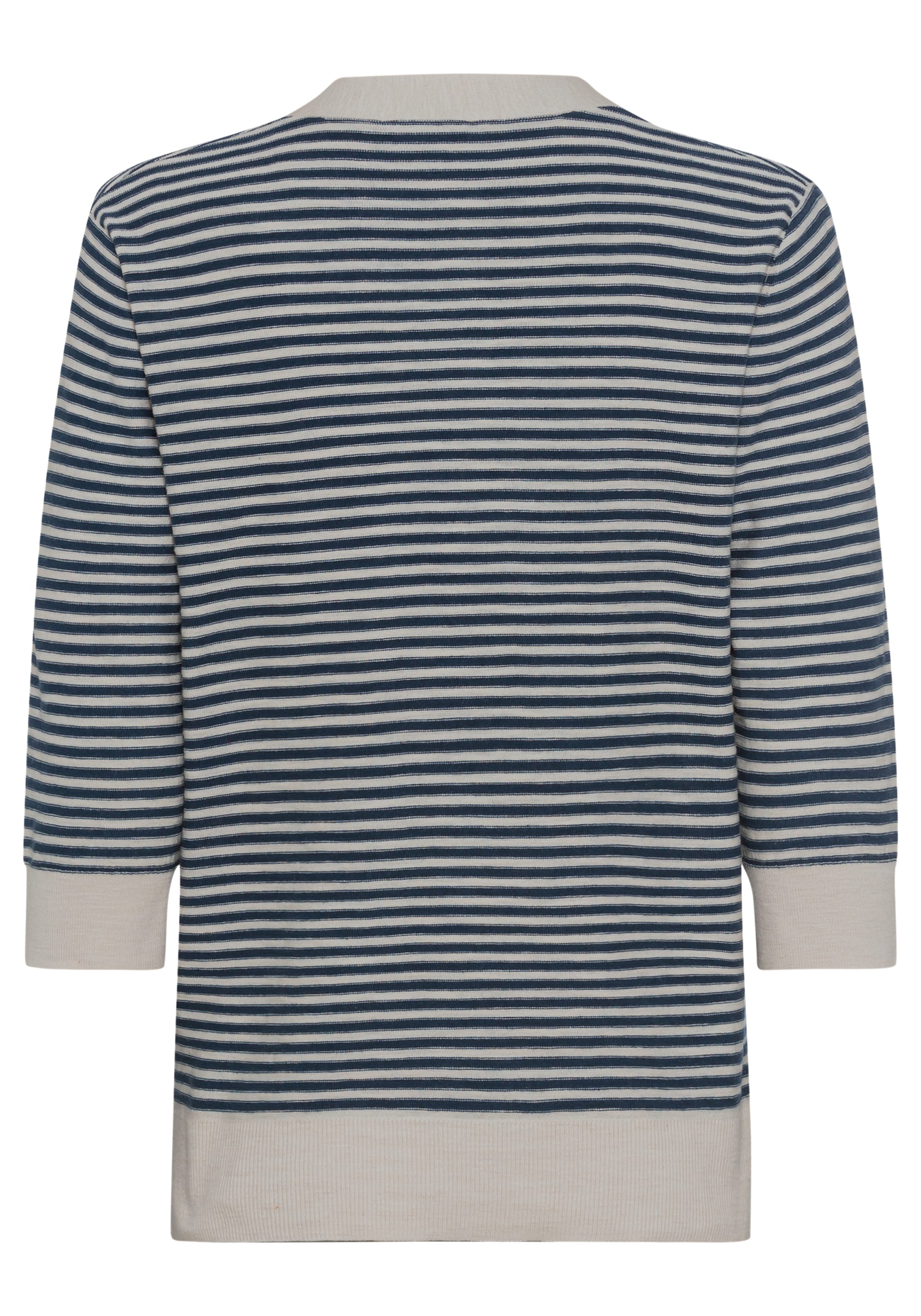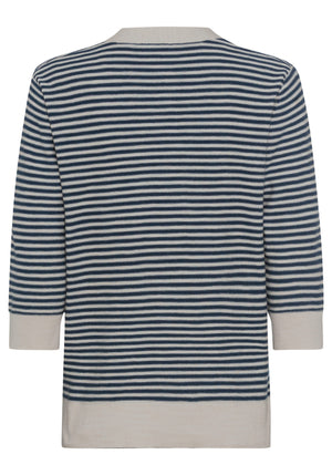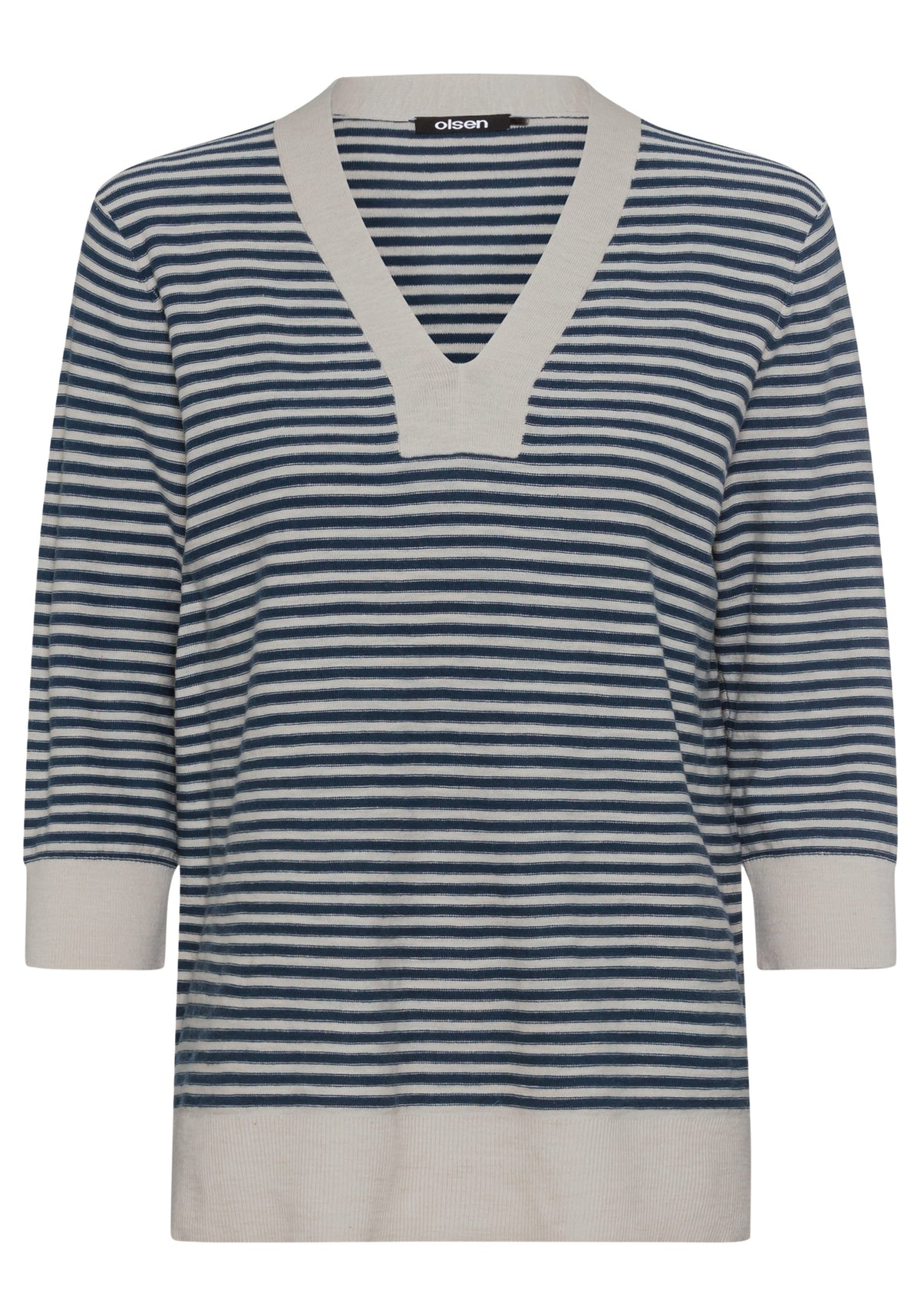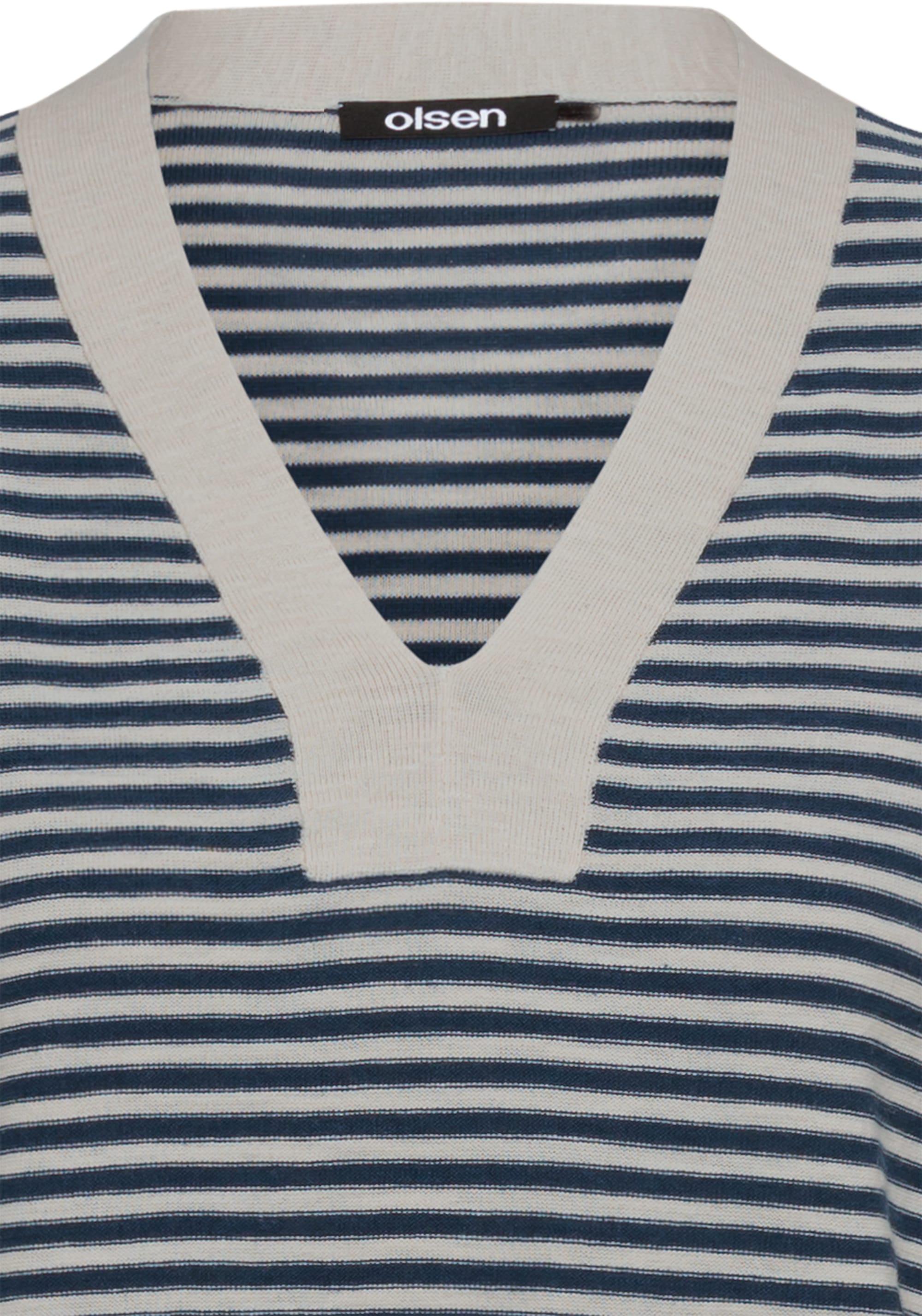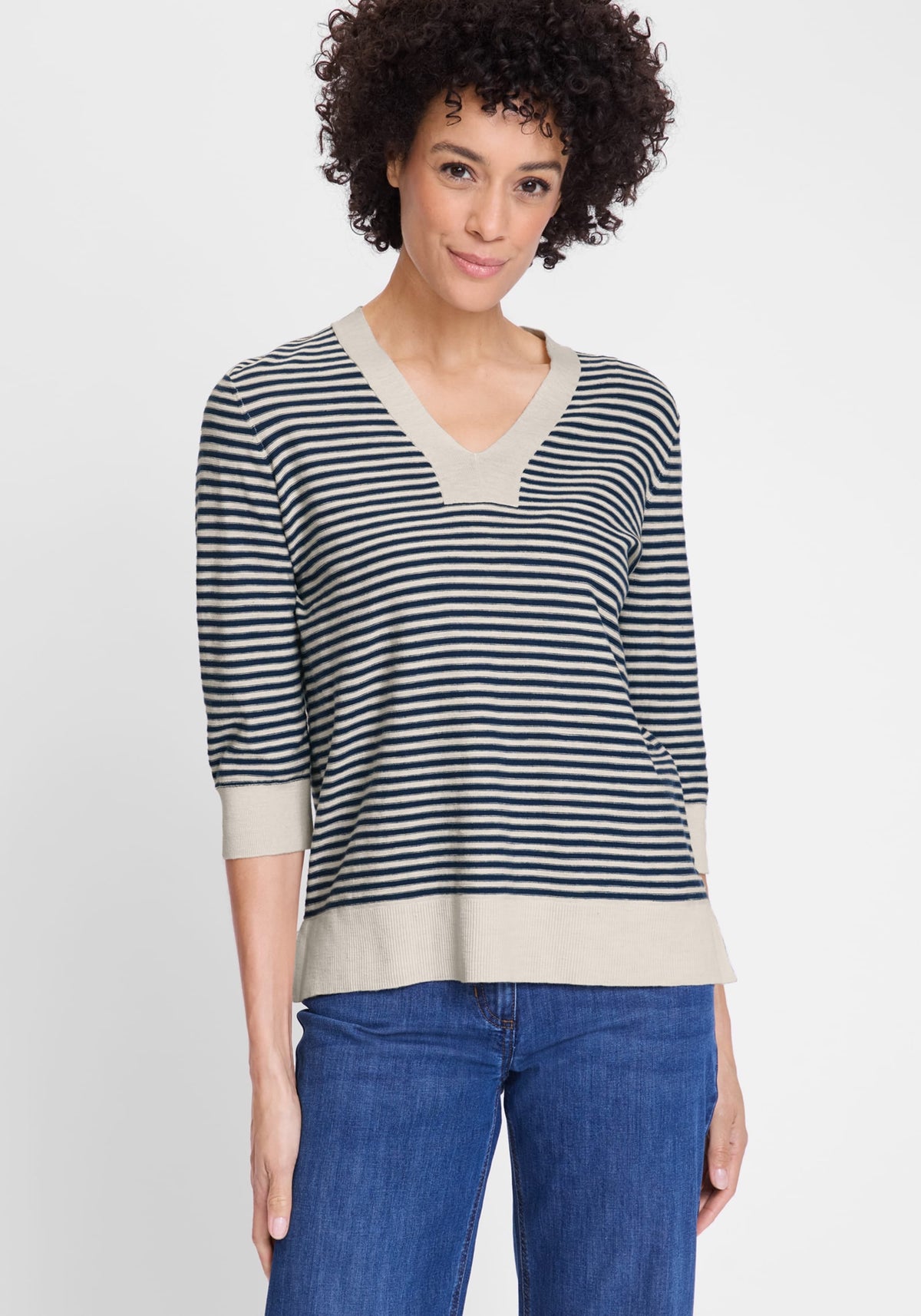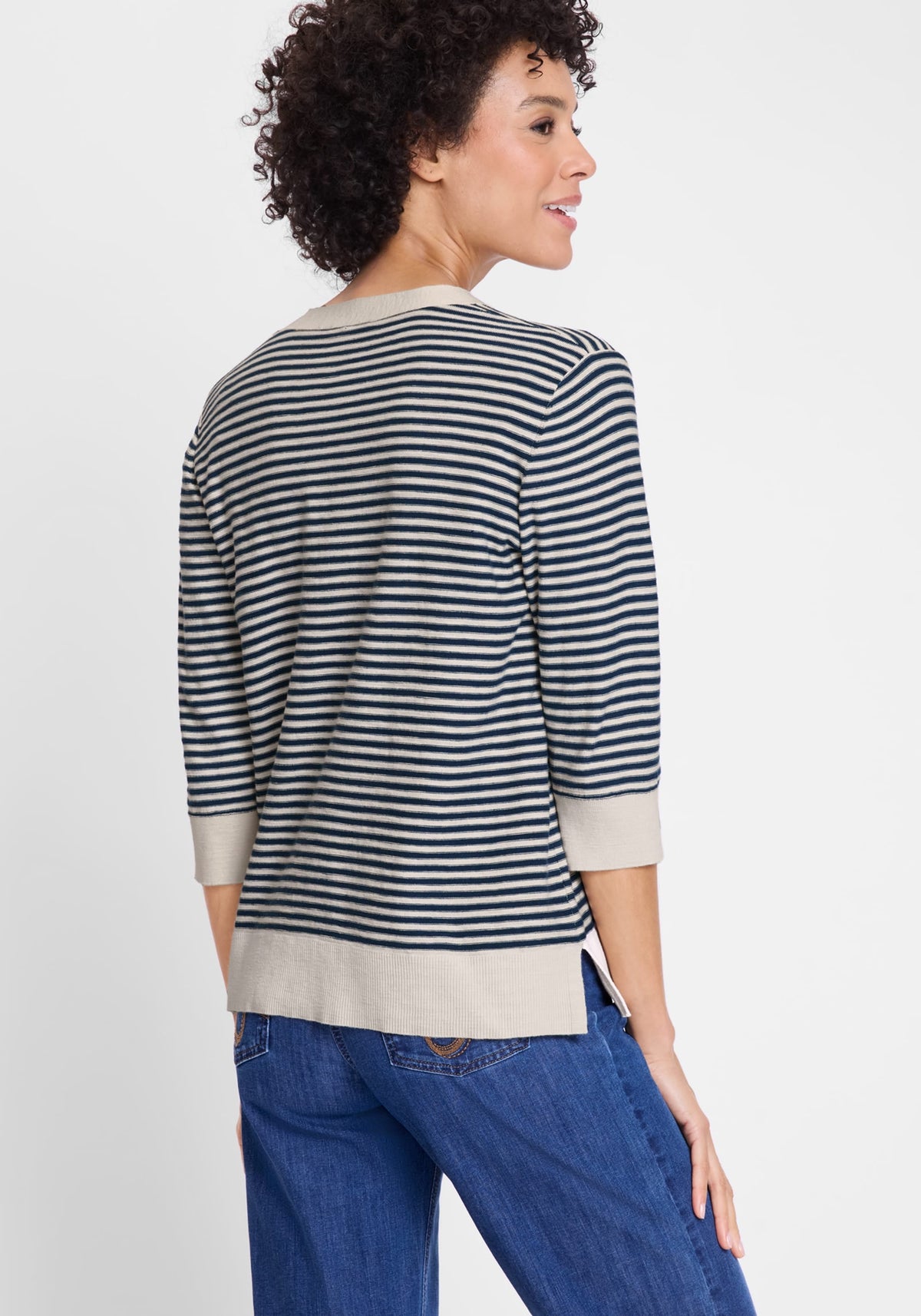 A timeless addition to your wardrobe, this lightweight tunic sweater features a rounded V-neckline, balanced Breton stripes, and solid bordered trimming.
