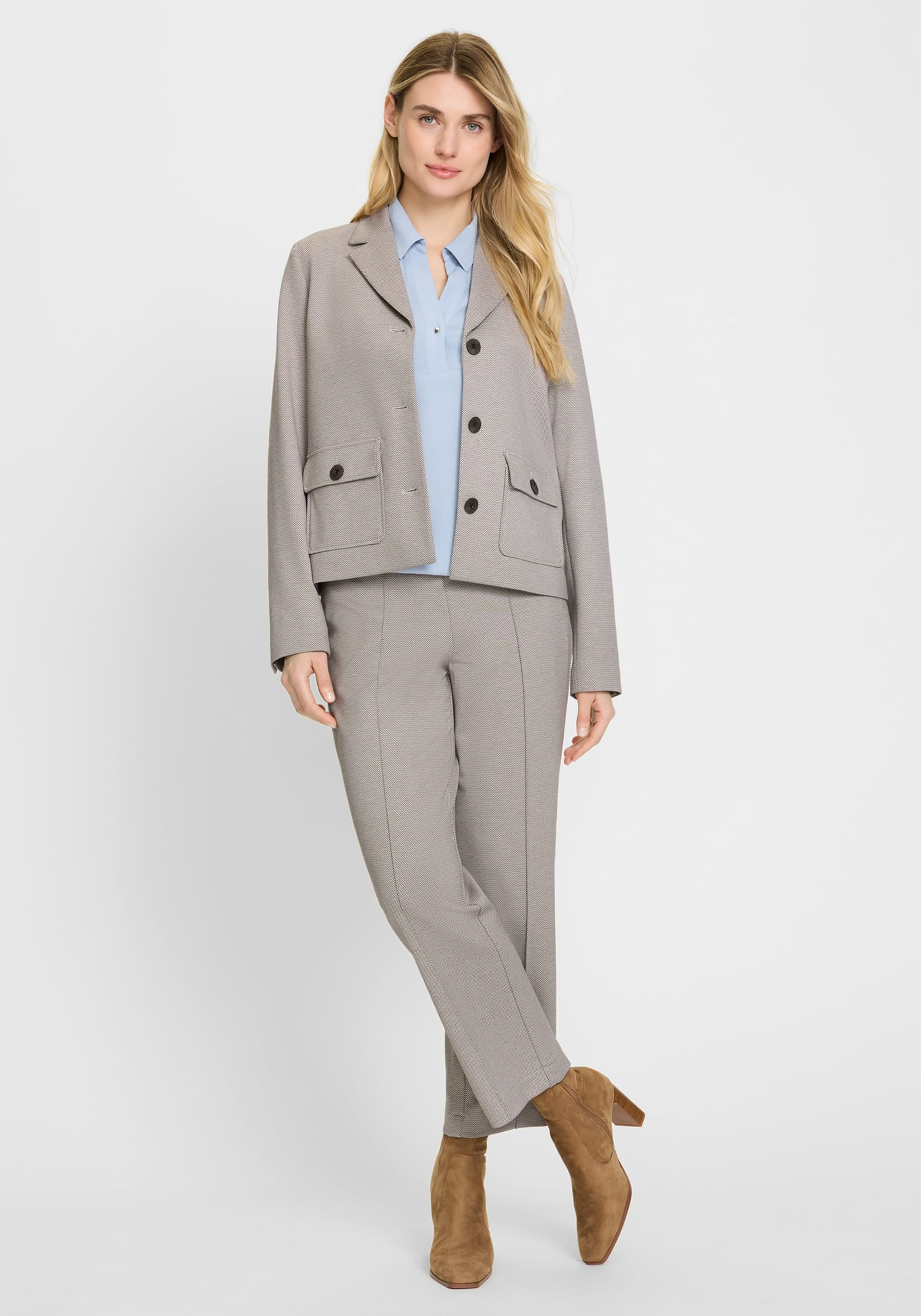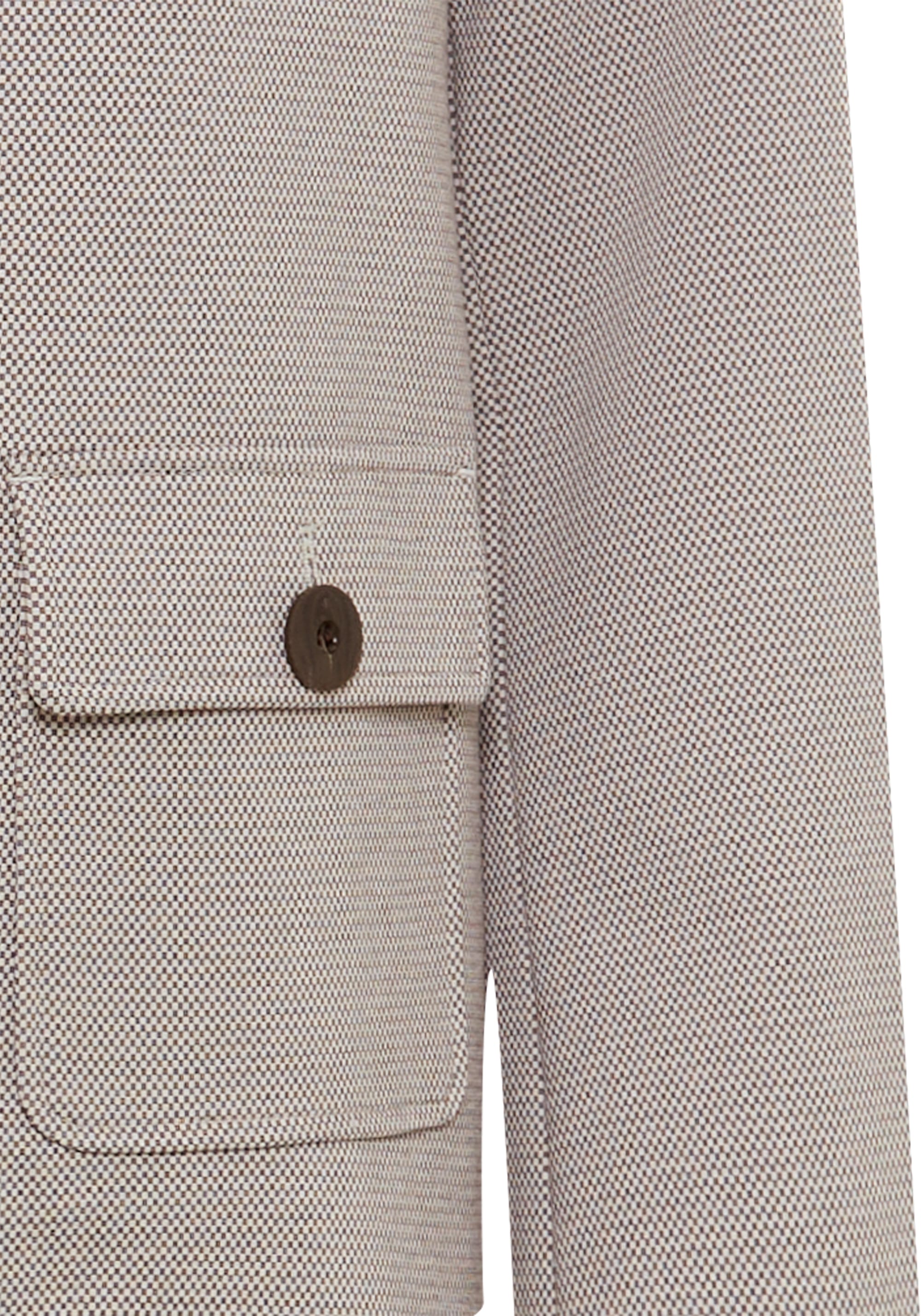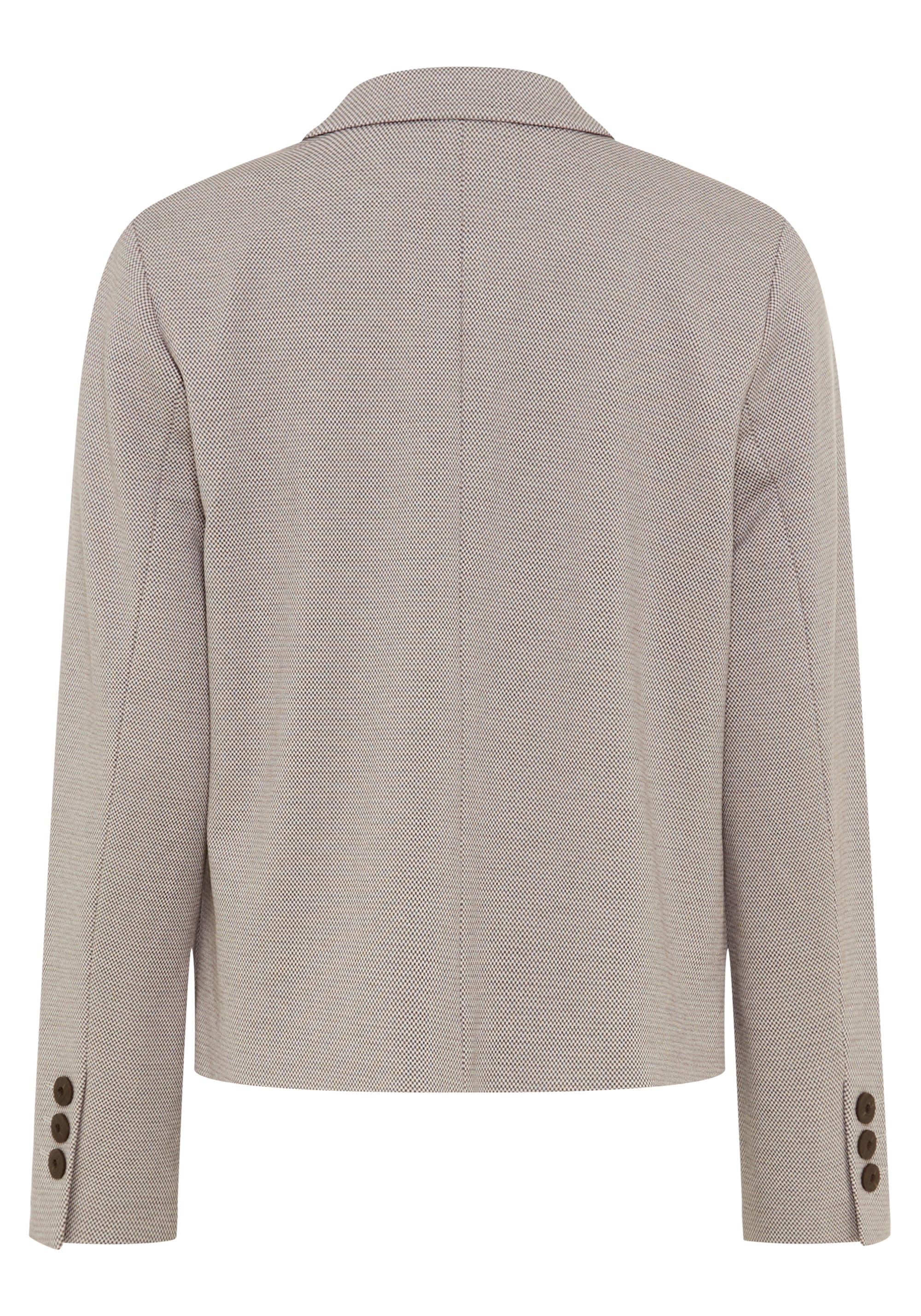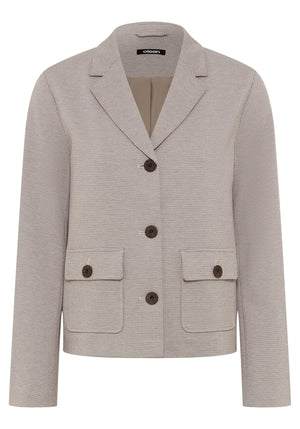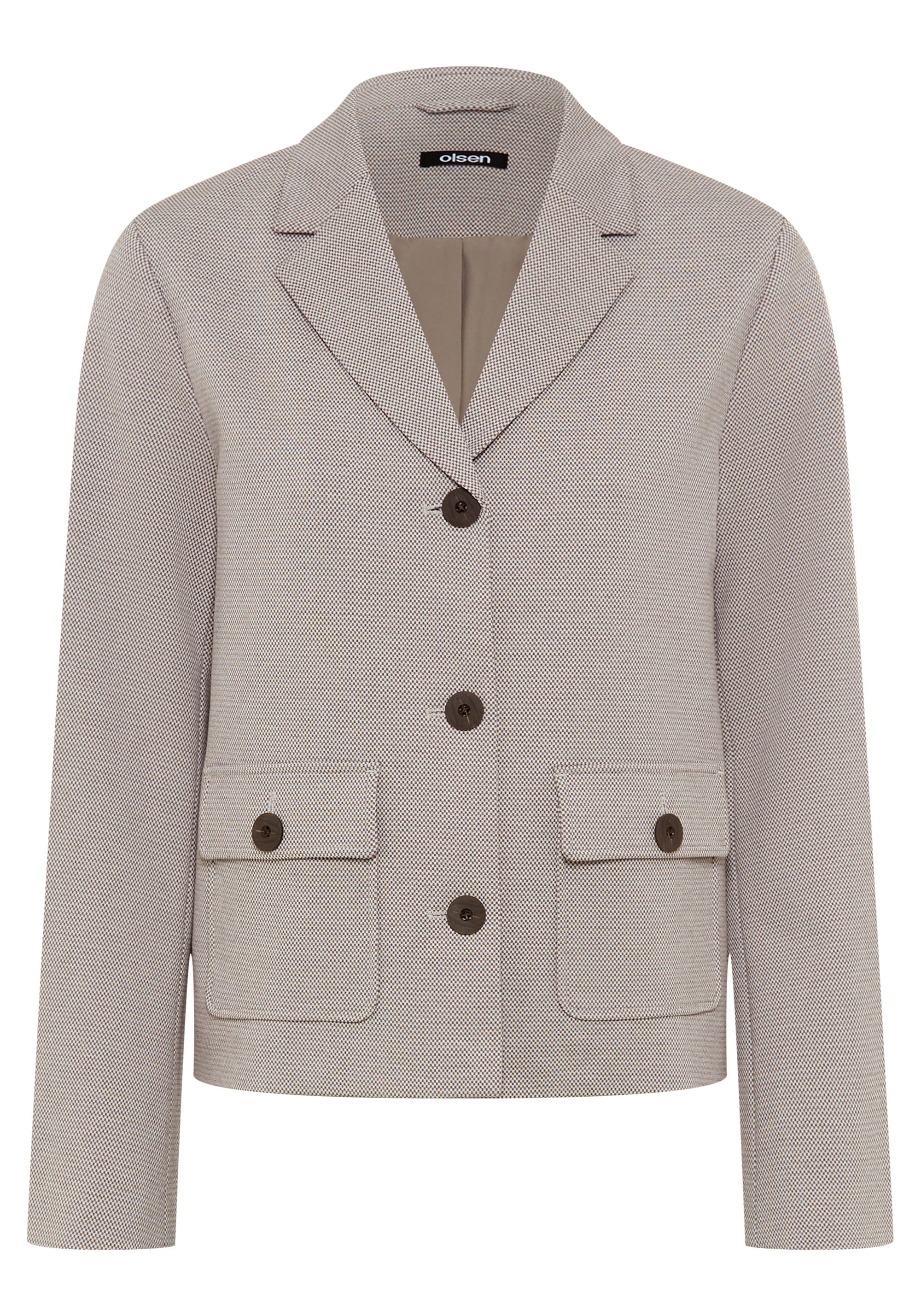 This jacket features a cropped length and straight cut with a classic notch collar and front flap pockets, showcasing an allover checked pattern.
