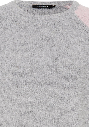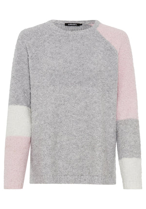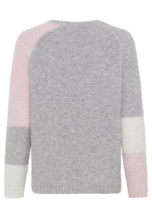 Discover the cozy texture of boucle yarn in this modern sweater, which combines color blocking with subtle foil embellishments.