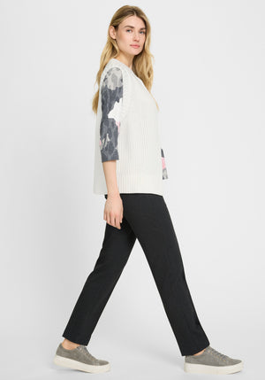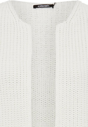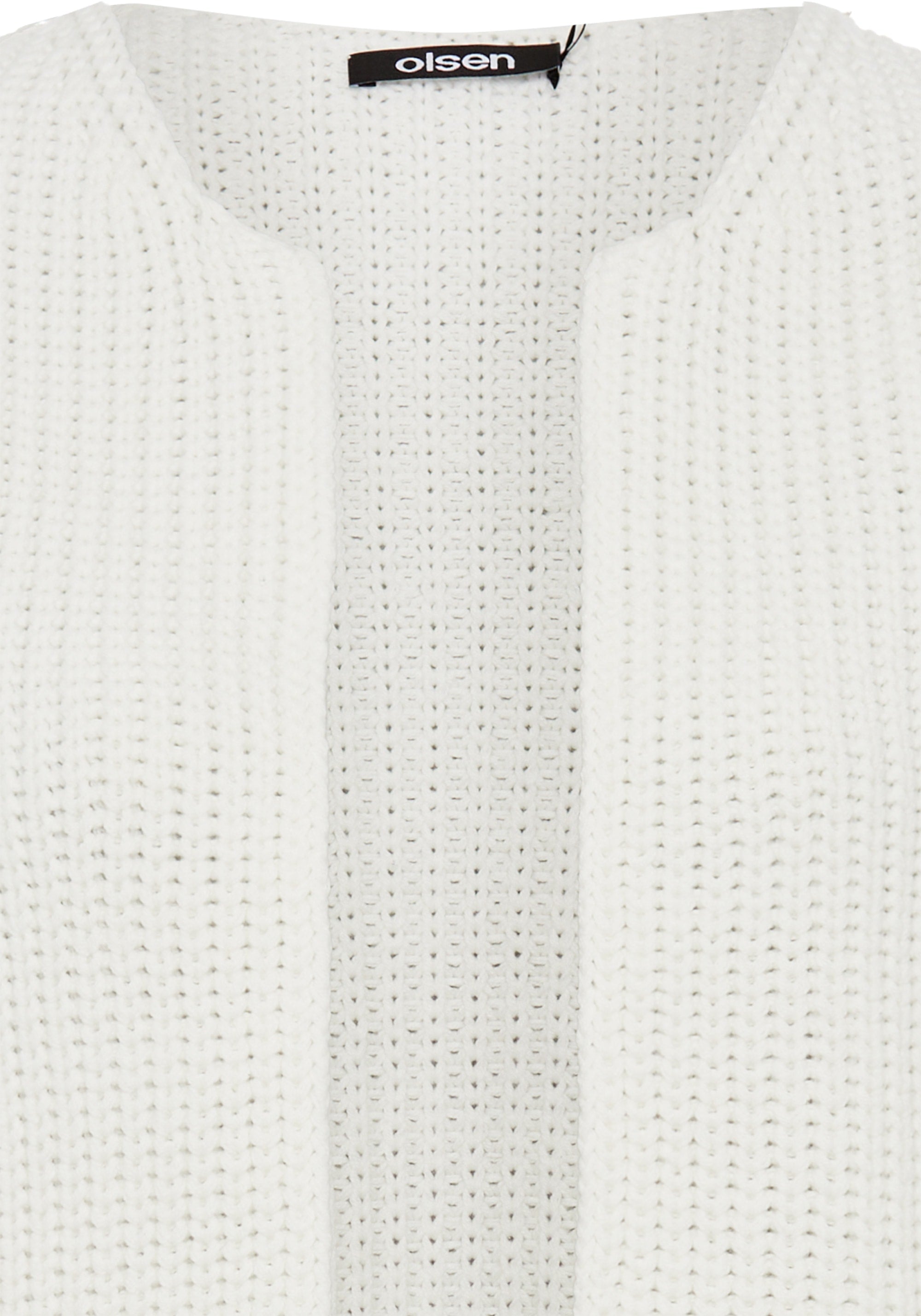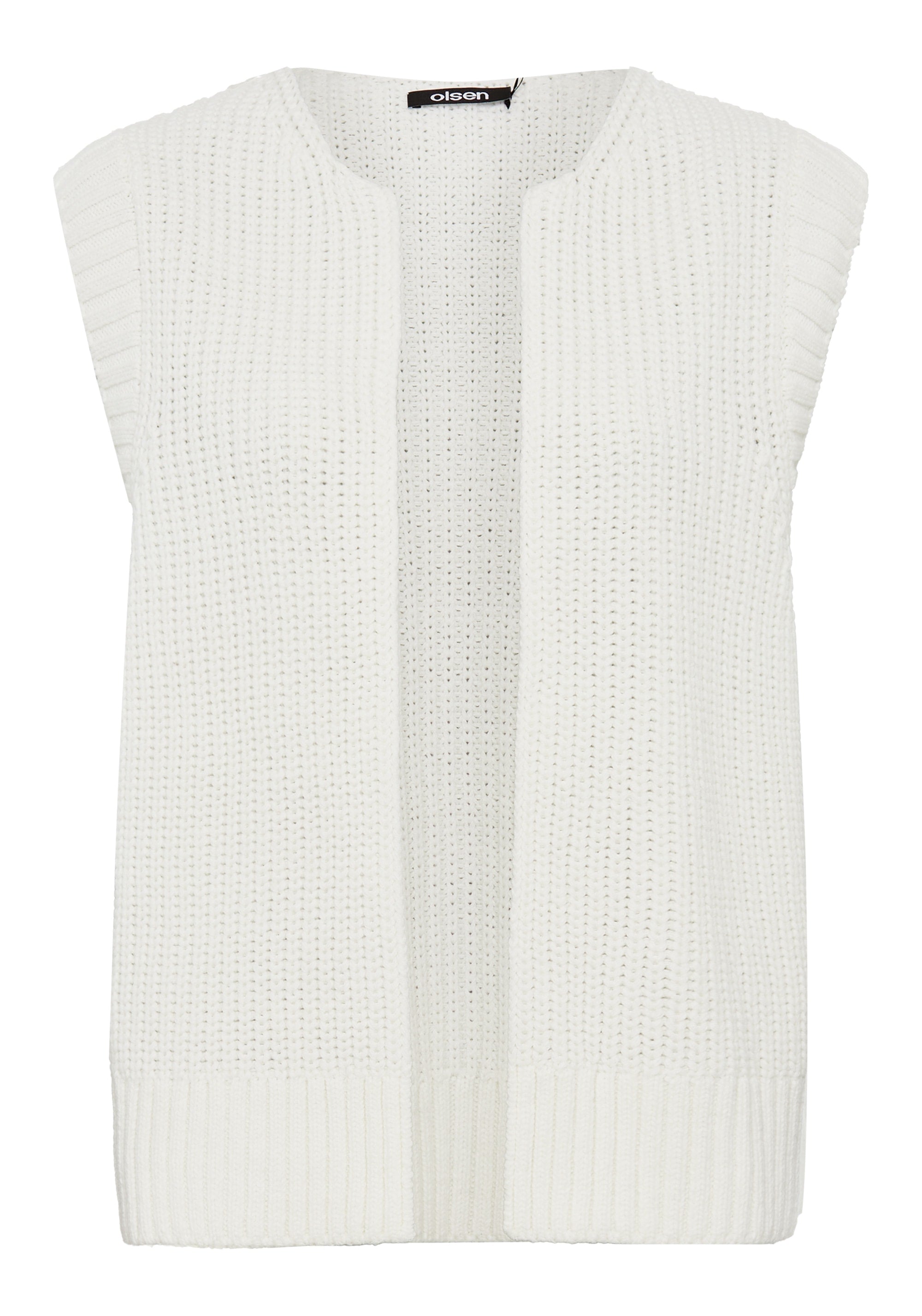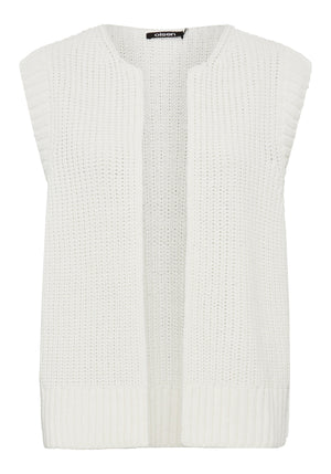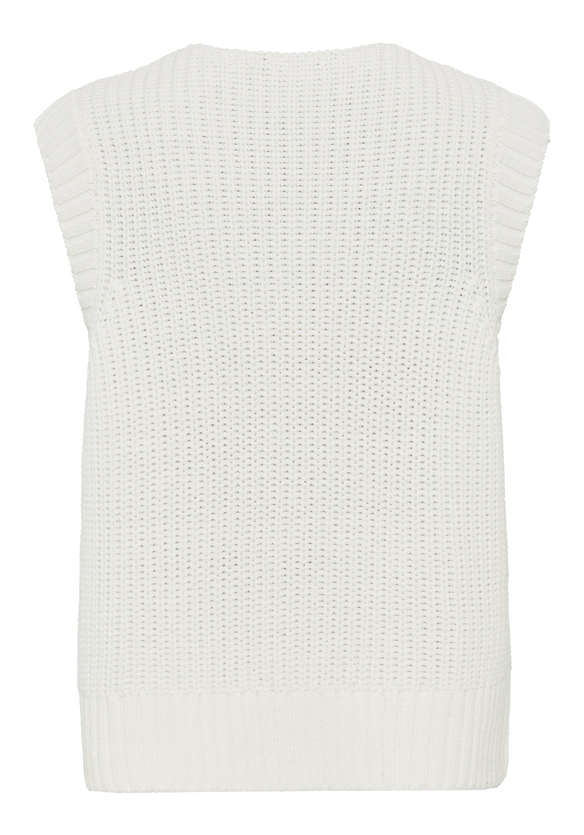 A sleeveless, collarless sweater vest featuring a heavy knit structure.