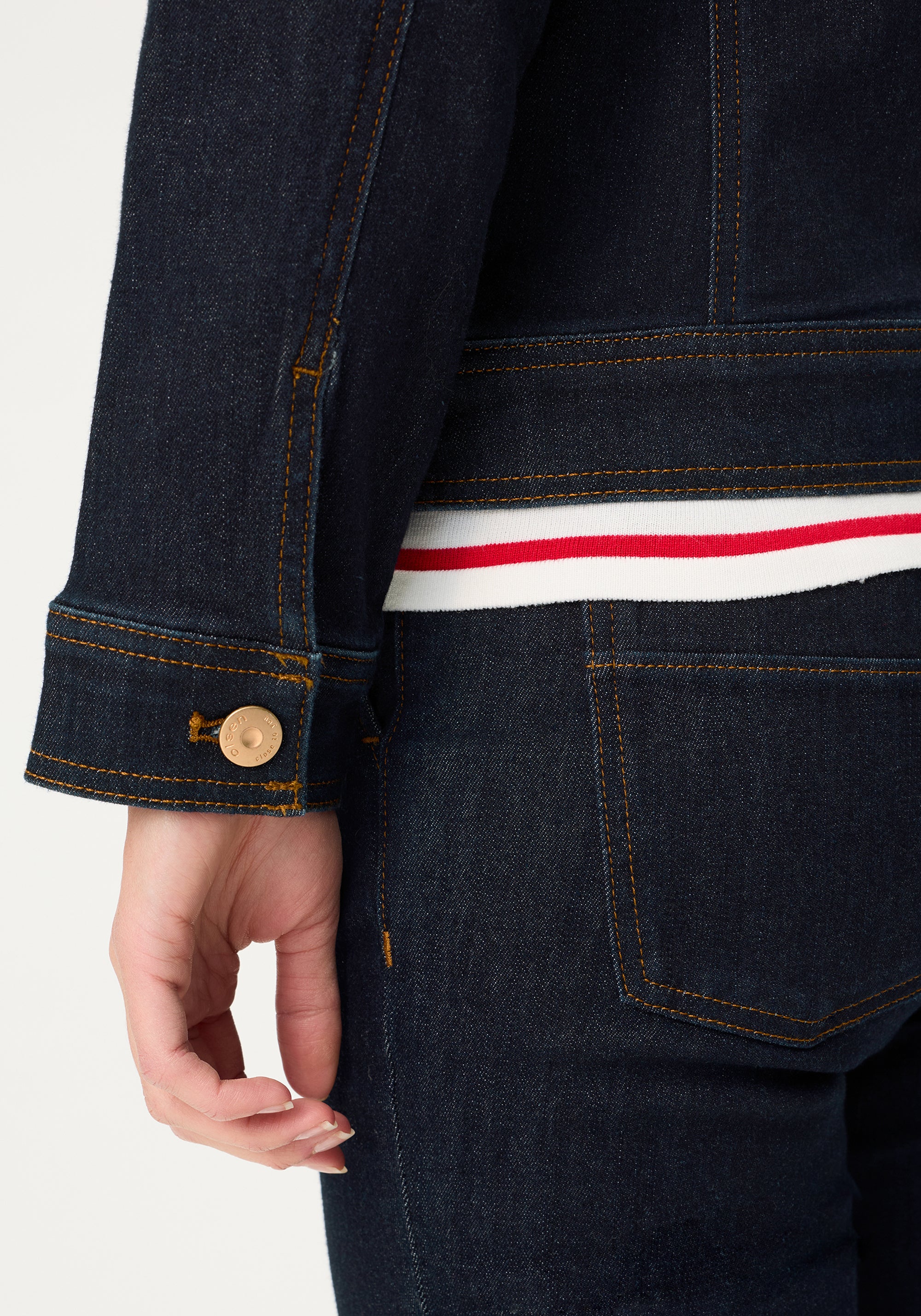 • Confectionnée dans un mélange de coton extensible pour un confort optimal et une belle tenue, cette veste en denim indigo foncé est complétée par des boutons doré mat, des surpiqûres contrastantes, des poches latérales fendues et une longueur d’environ 56 cm.