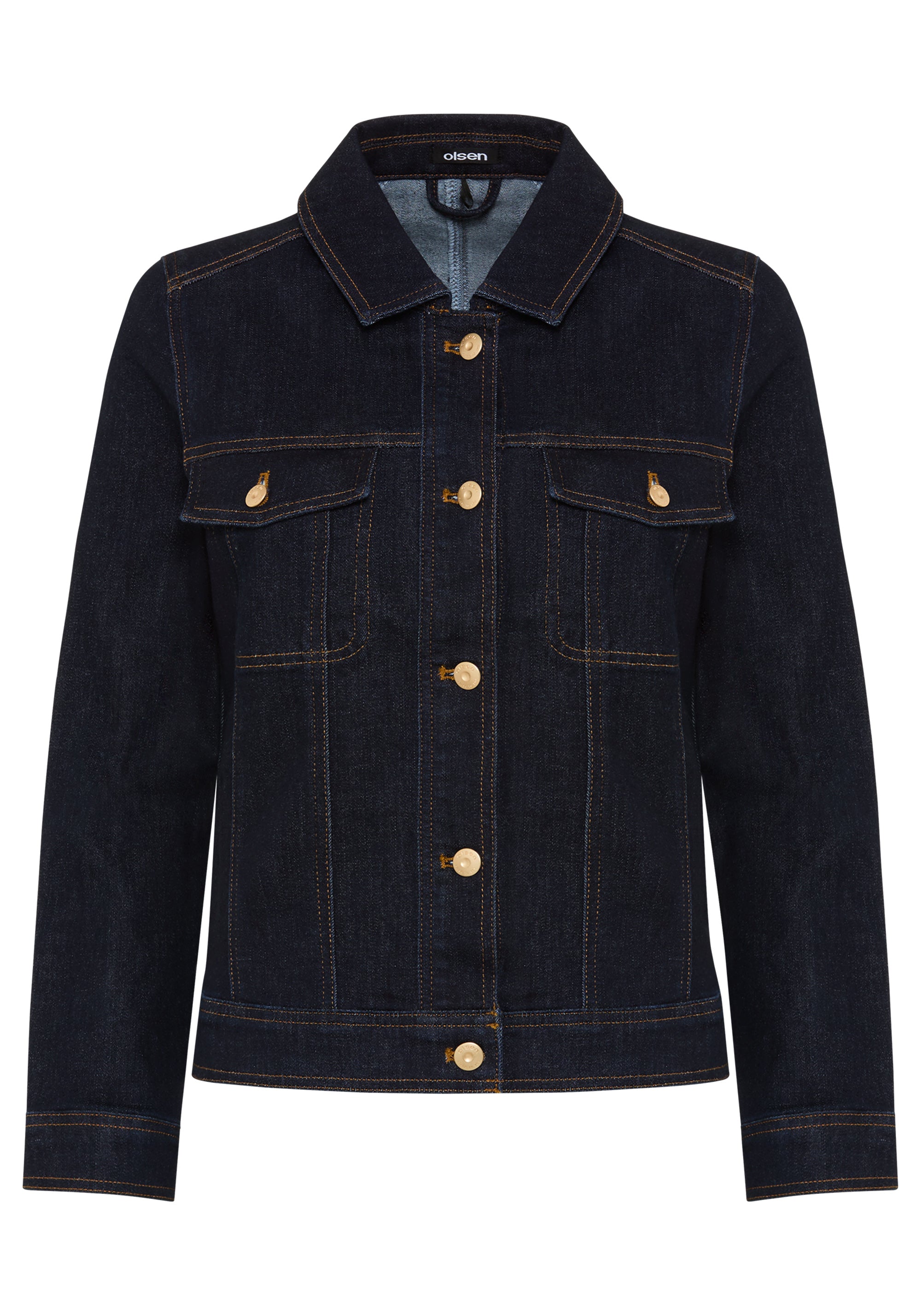• Crafted from a stretch cotton blend for comfort and shape retention, this dark indigo denim jacket is finished with matte gold buttons, contrast topstitching, side slash pockets, and a length of approx. 56 cm.