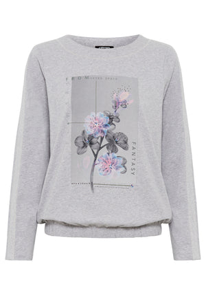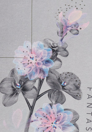 Classic heather grey is elevated with an artsy centre front placement print adorned with silver rhinestones for a subtle sparkle.