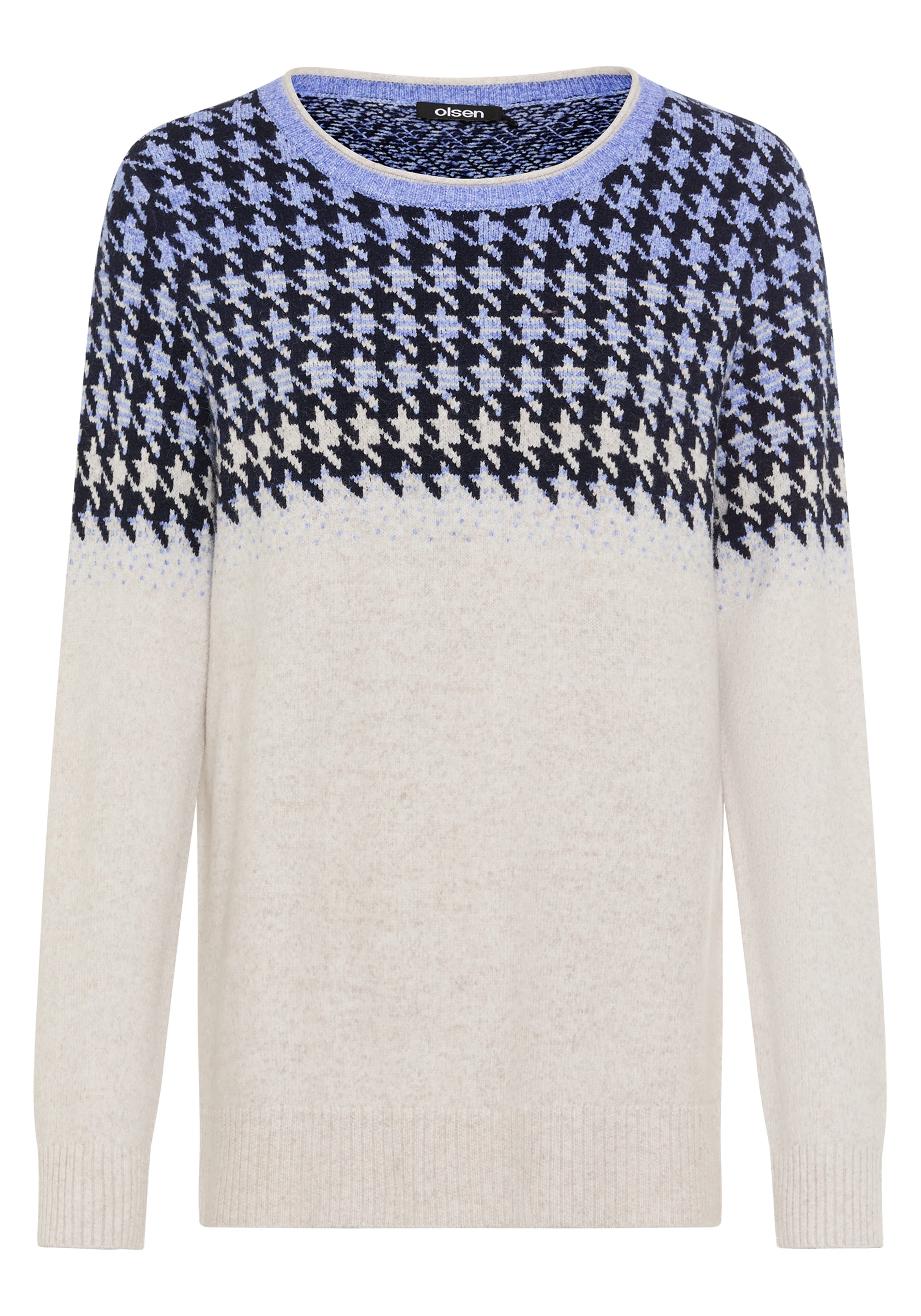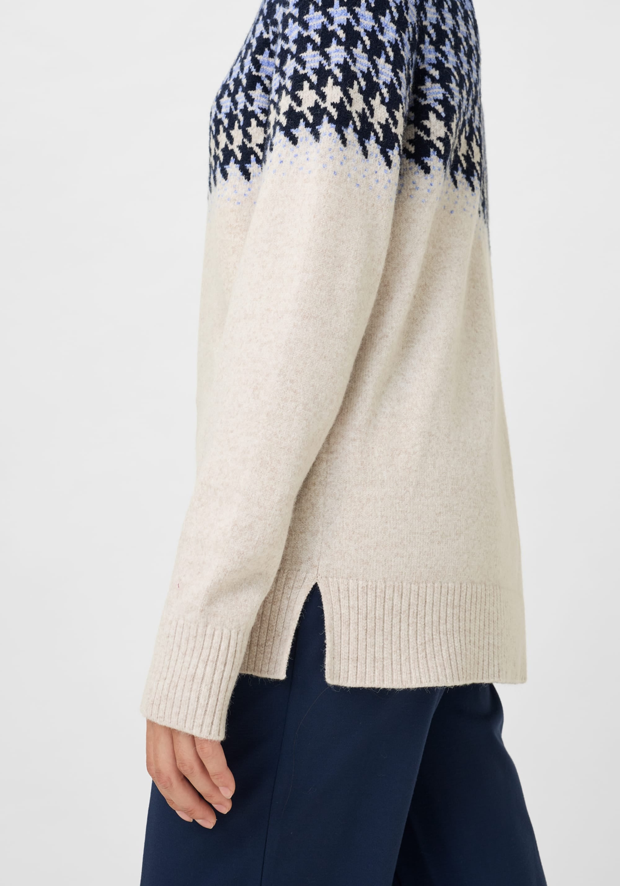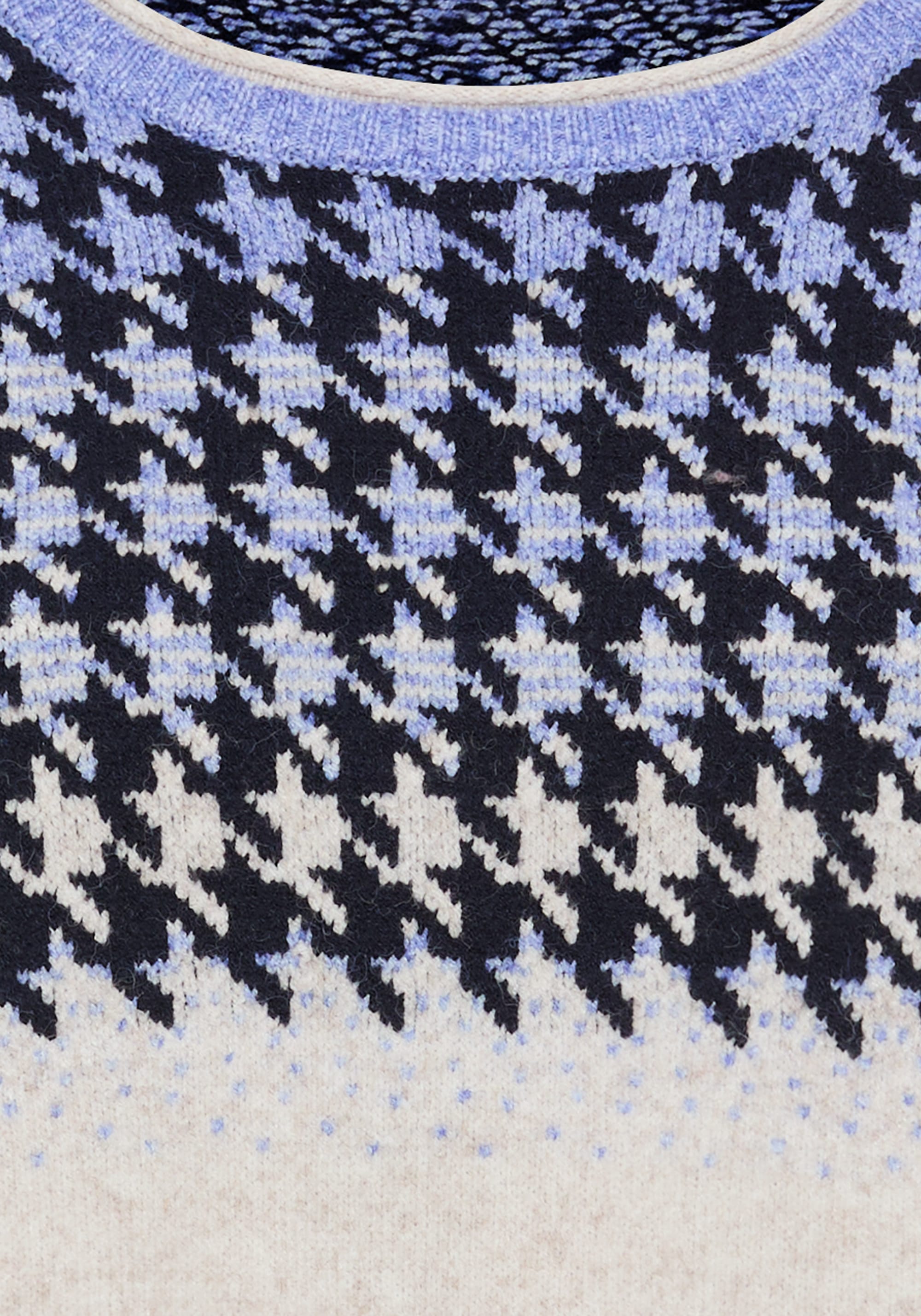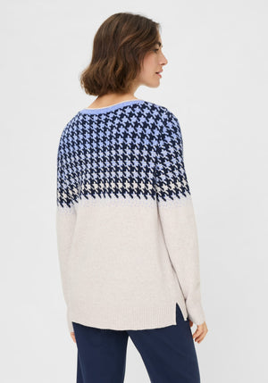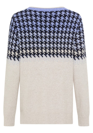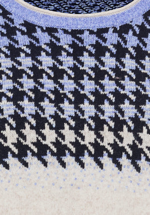 This cozy sweater features a classic houndstooth pattern in an unexpected colourway, placed at the top third for a modern, eye-catching twist.