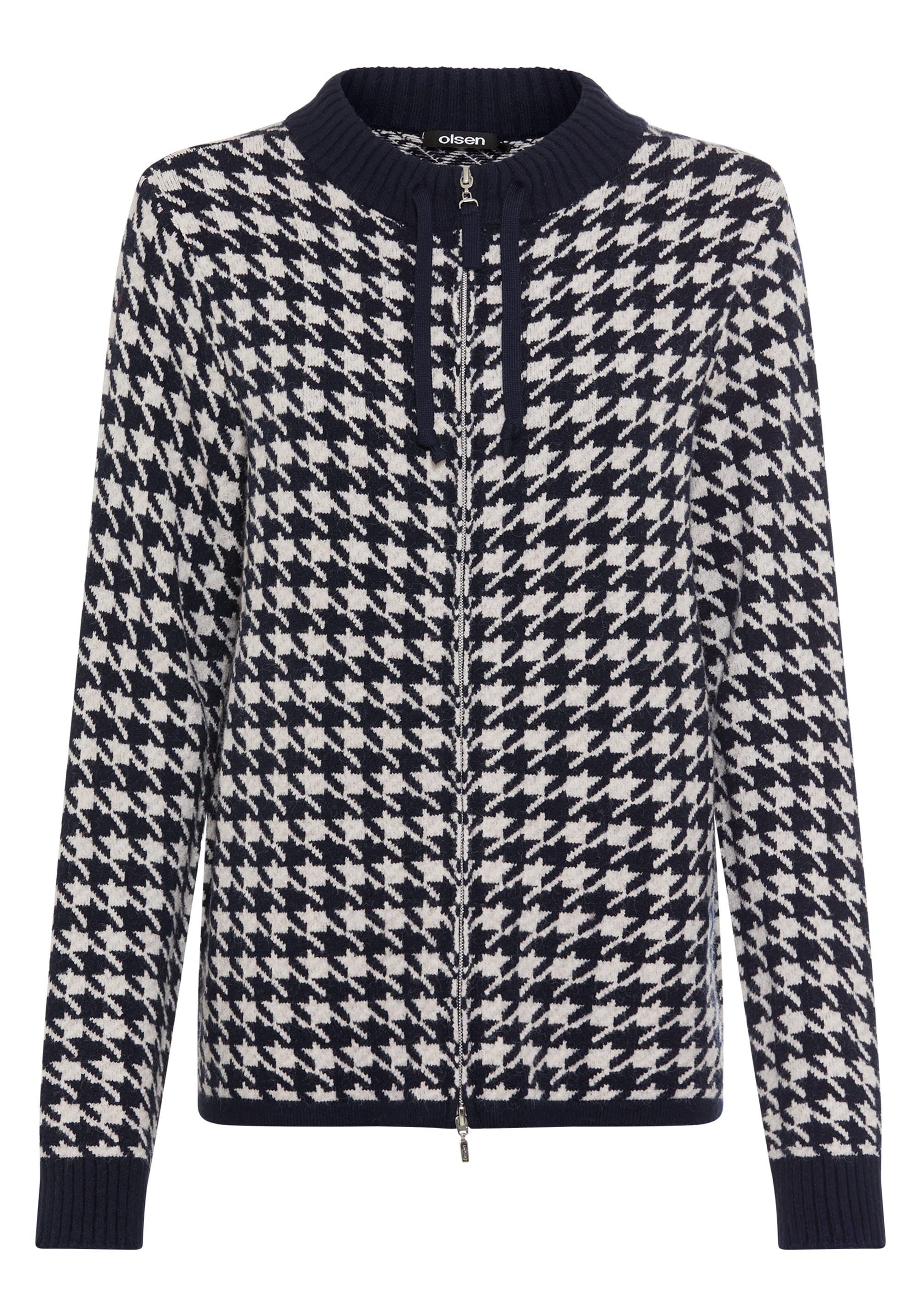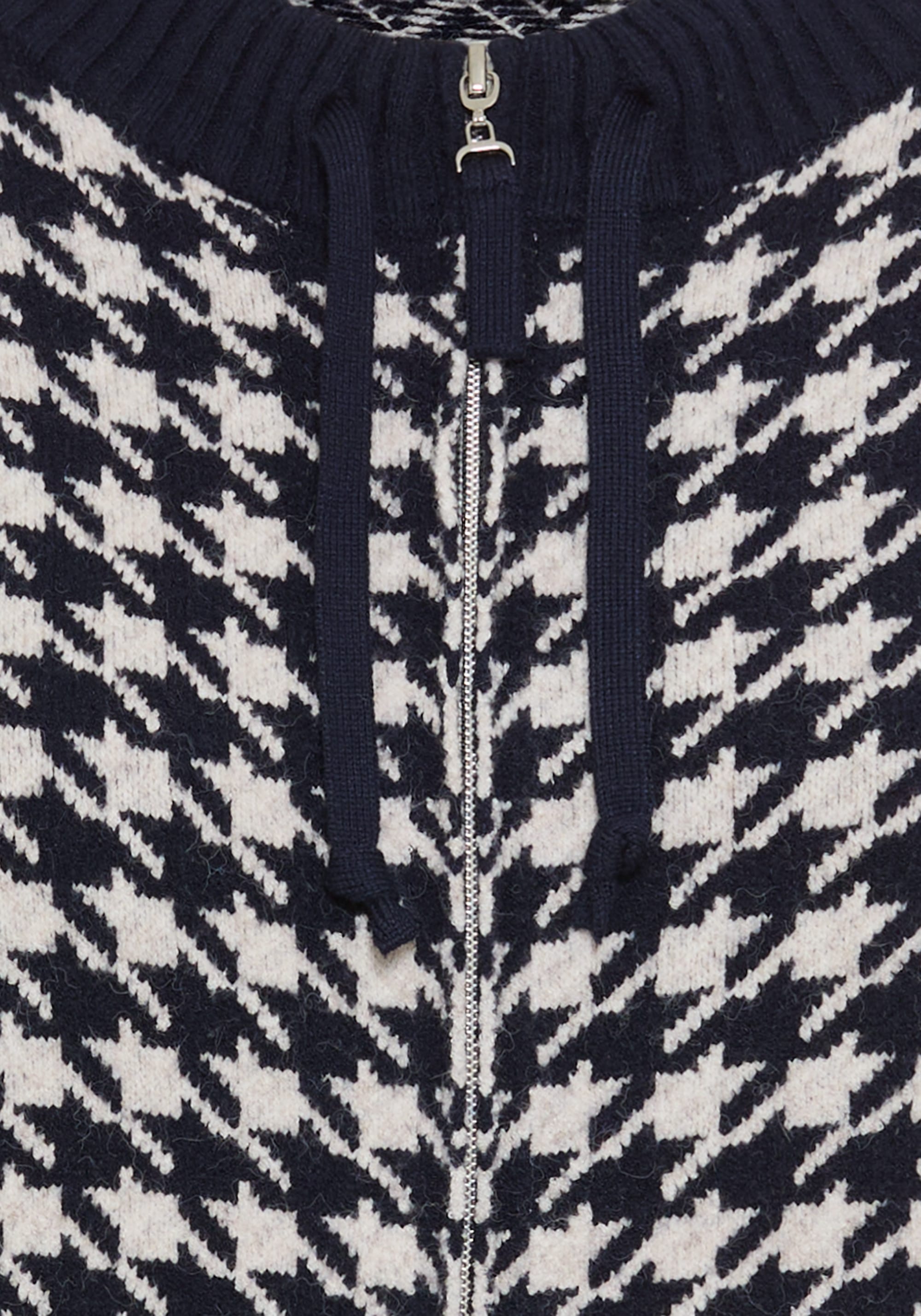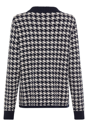 This super cozy knit cardigan showcases a classic houndstooth pattern in a timeless navy and stone colour combination for bold, elevated style.