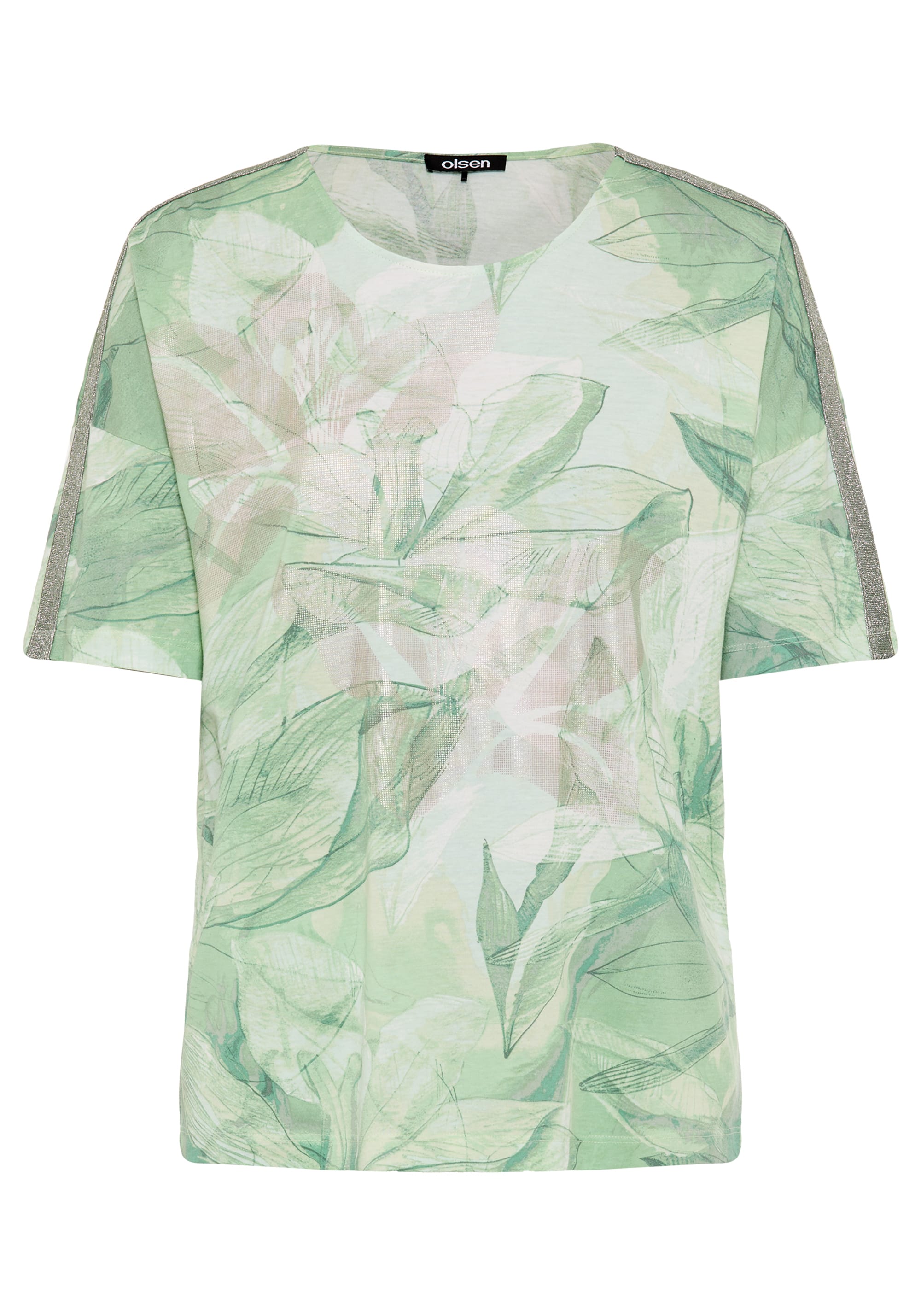 A feminine summer statement, this T-shirt showcases a softly toned artistic leaf print with shimmering pigment and metallic foil details, finished with subtle shimmery stripes along each sleeve for an elevated touch.