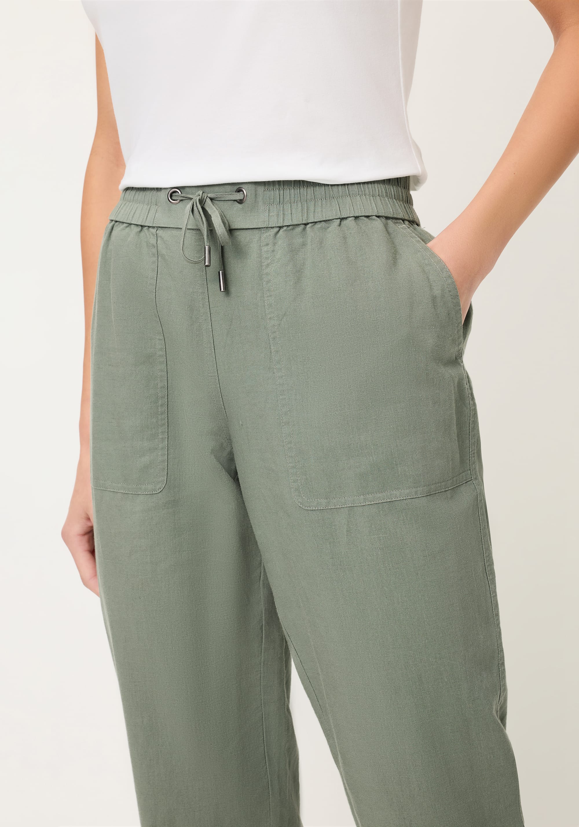 • Confectionné dans un mélange lin-coton respirant avec poches latérales et poches passepoilées au dos, idéal pour les journées chaudes. Entrejambe env. 71 cm.