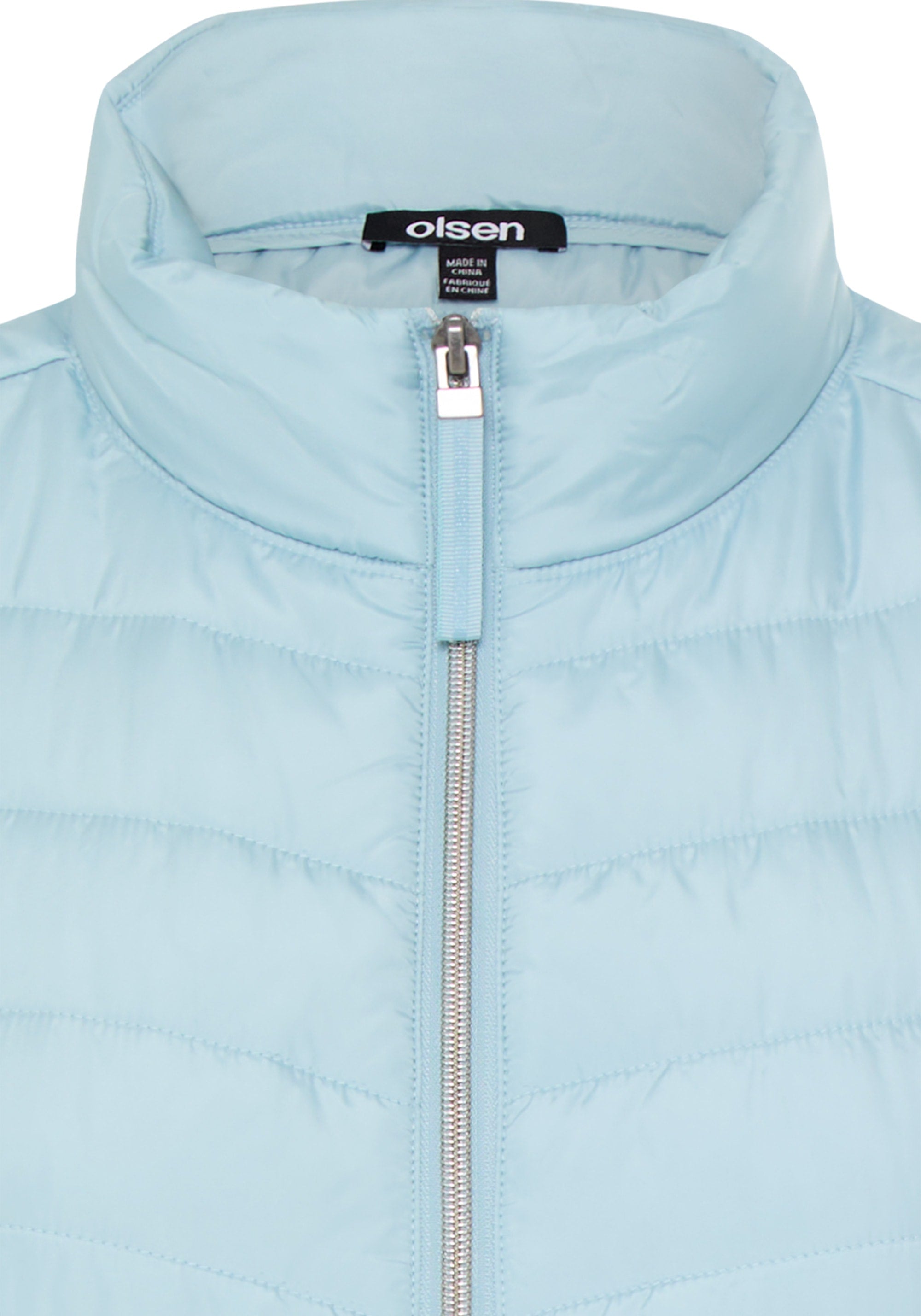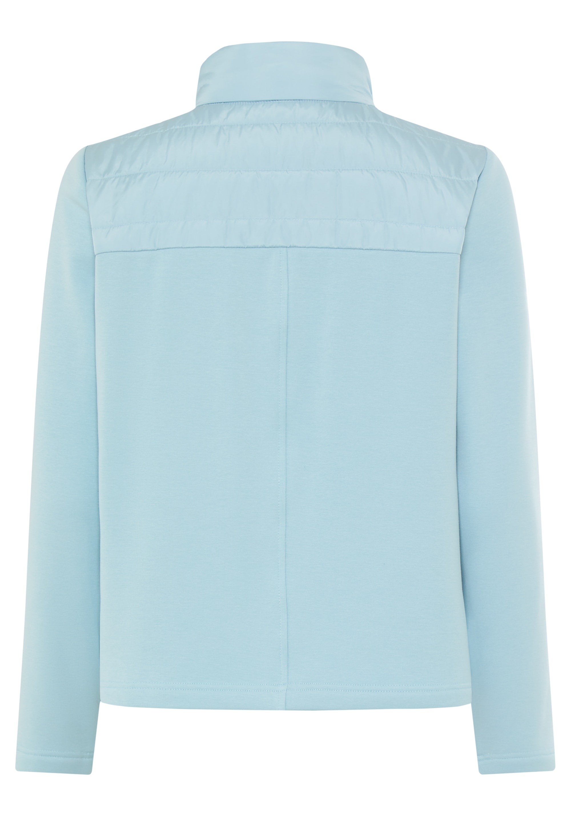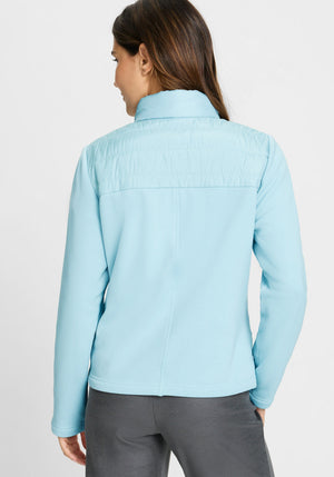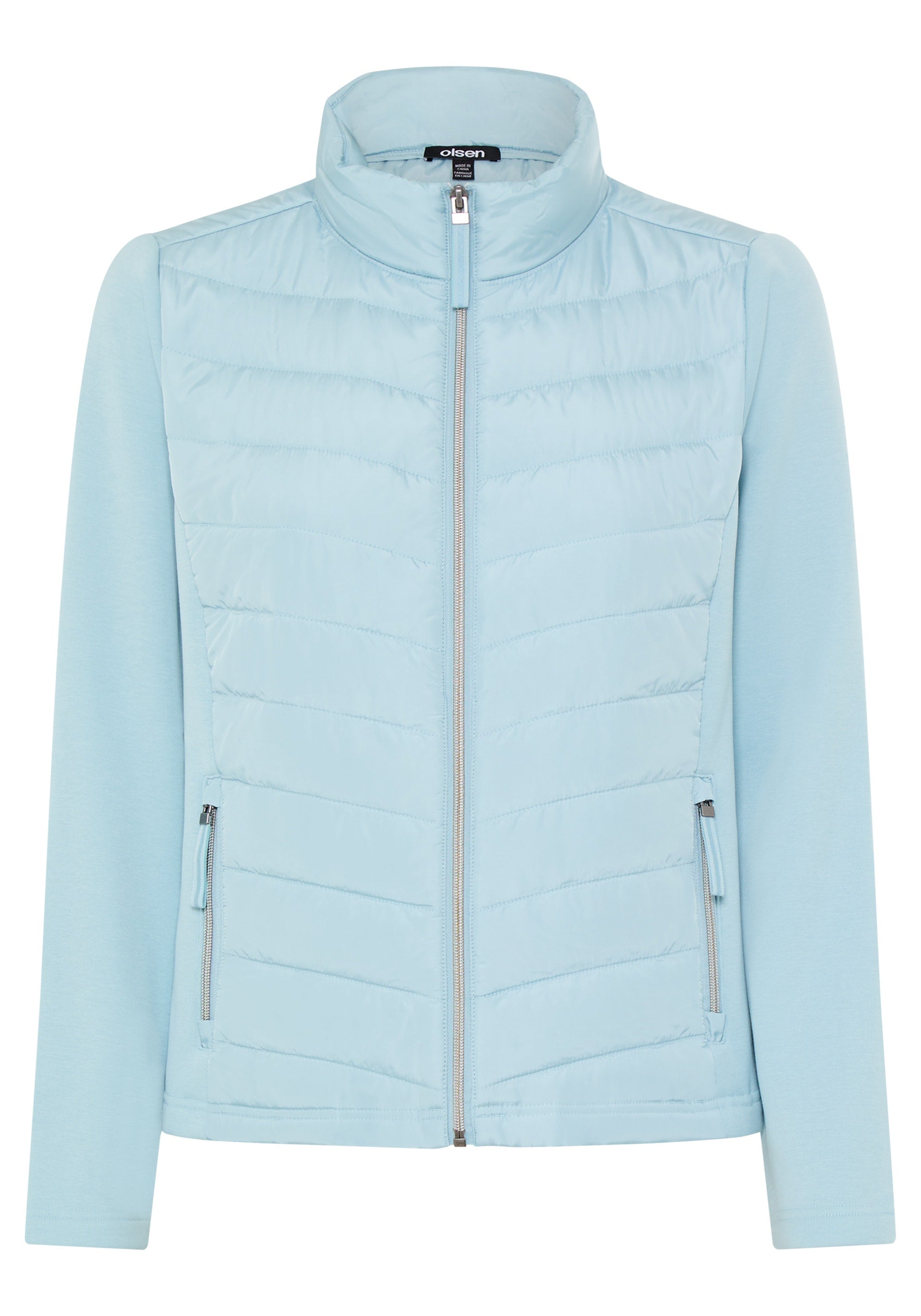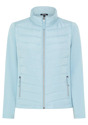 This mixed-media jacket combines soft jersey with sporty nylon quilting for a stylish and functional look.
