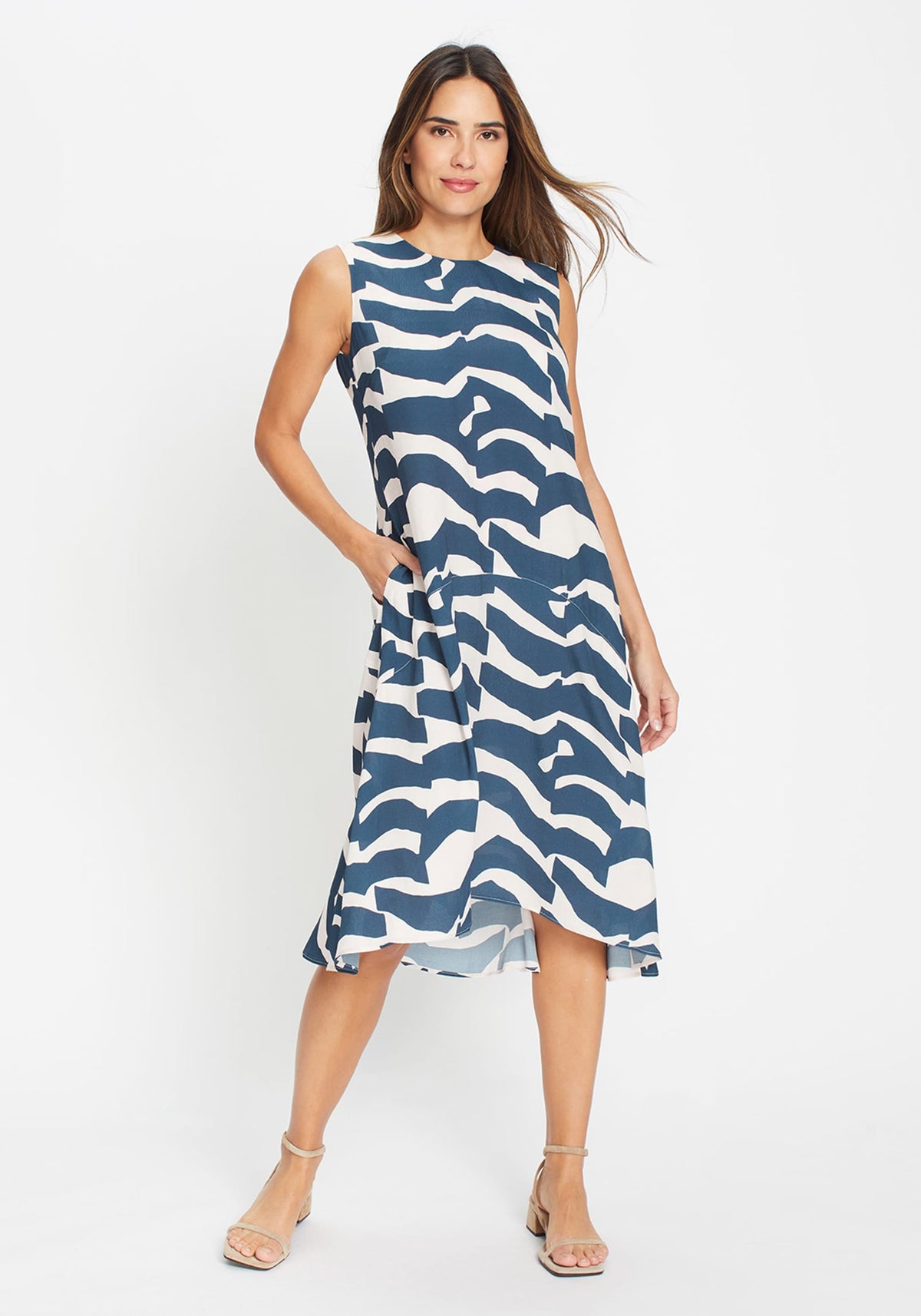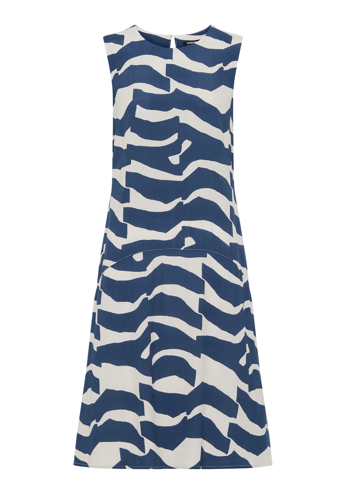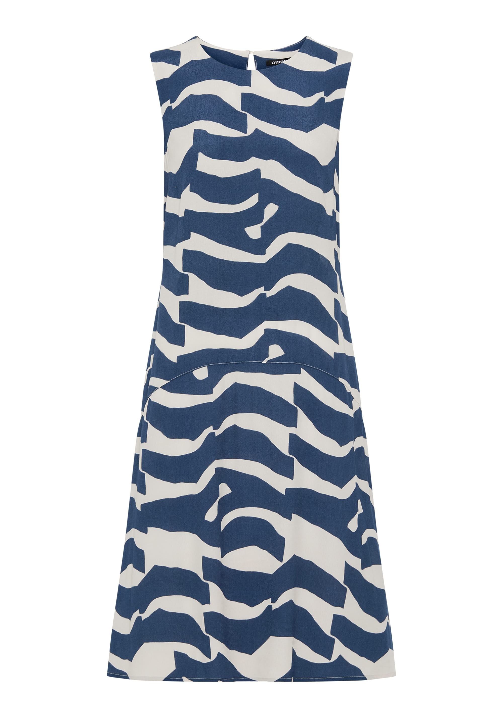 This on-trend, slightly oversized dress features a statement allover modern graphic print, creating a stunning yet relaxed look.