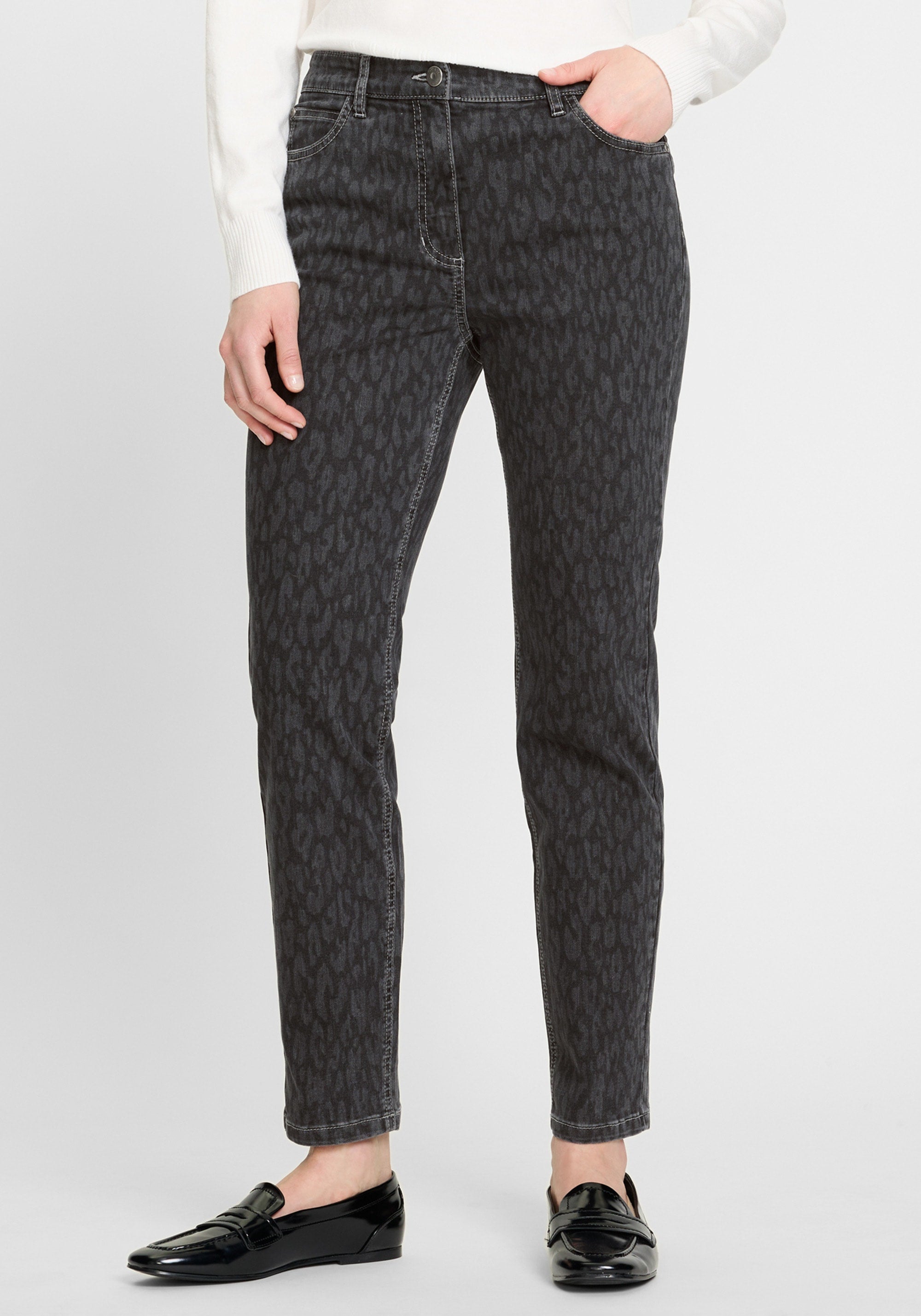 Our popular Mona fit jean is upgraded with a subtle washed allover leopard print for a stylish twist.
