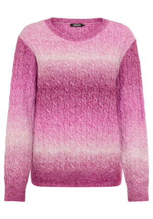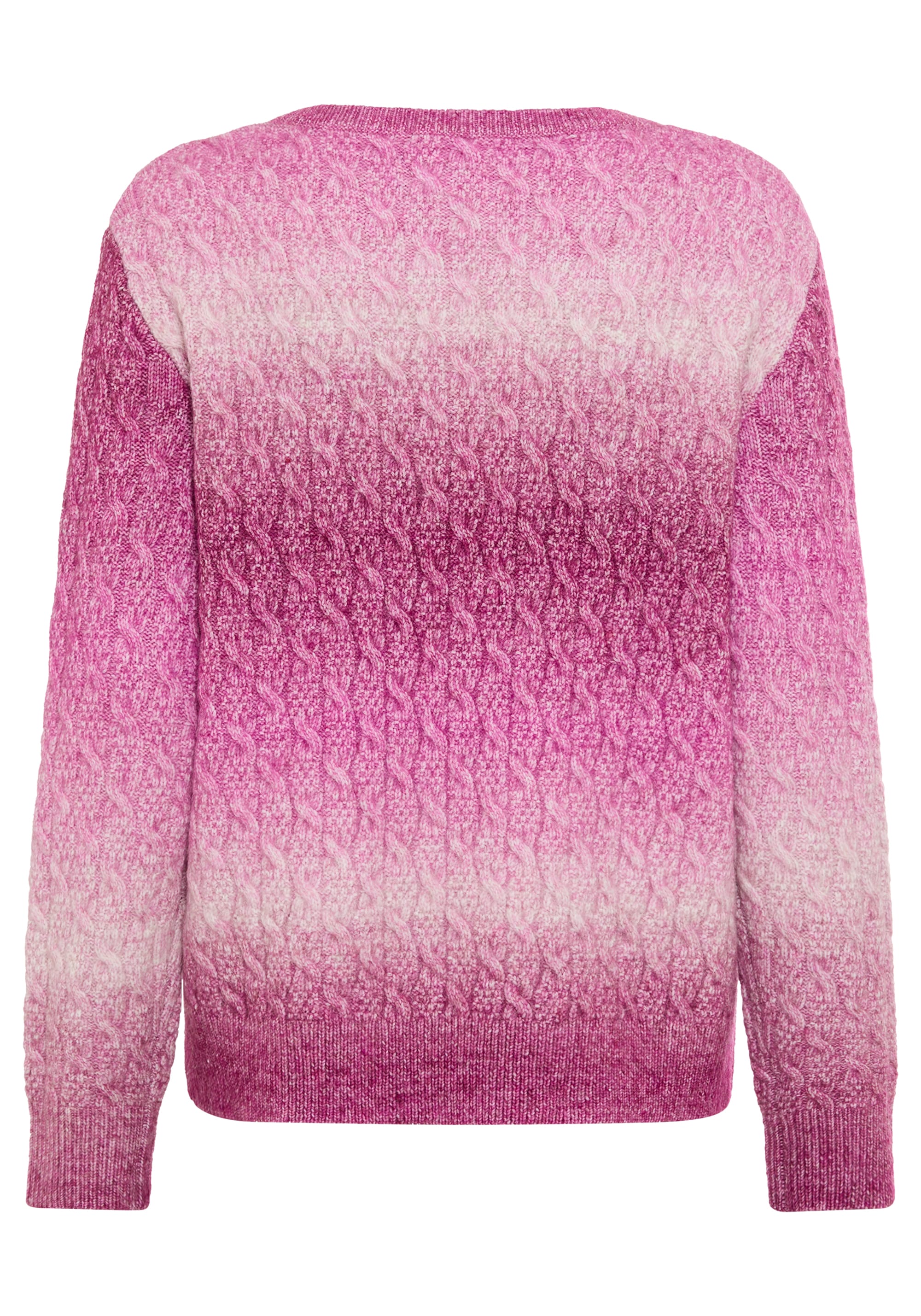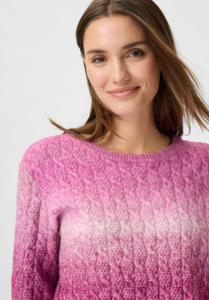 This sweater offers a charming twist on classic cable knit, beautifully showcased in soft, berry shades.