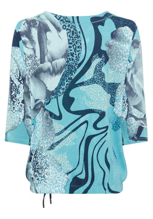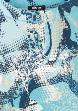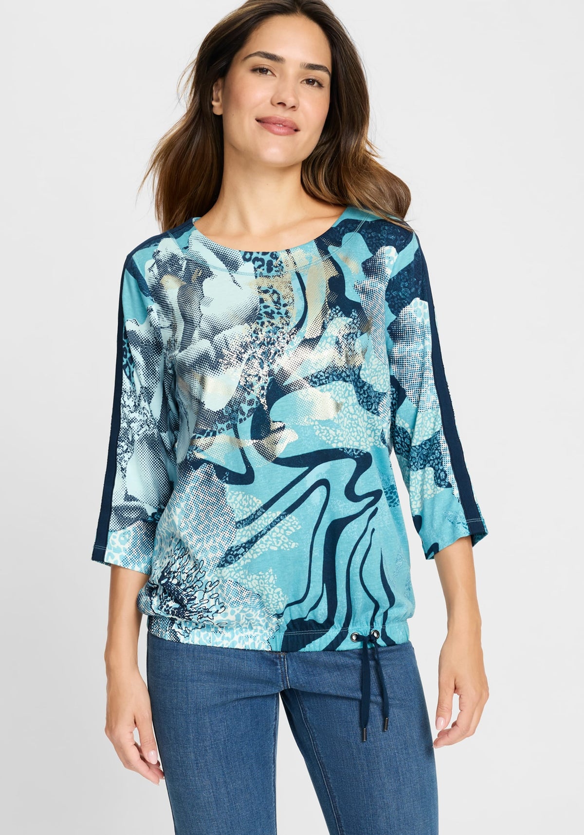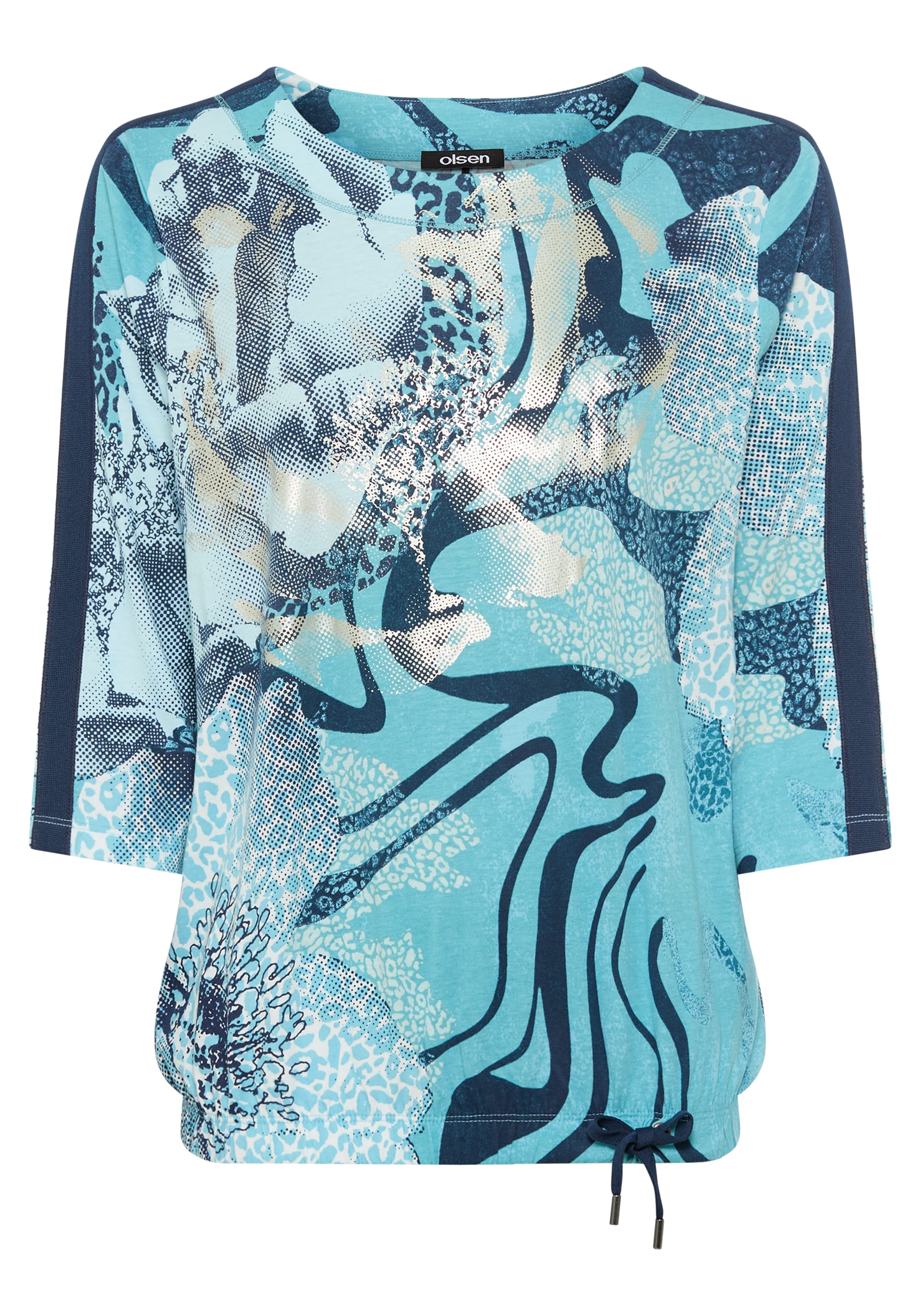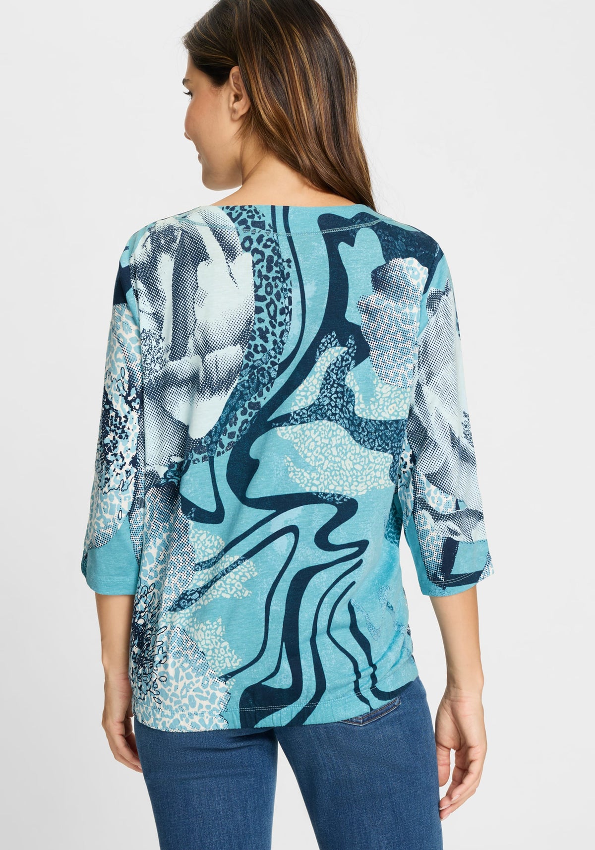 This cotton blend t-shirt is lightweight and airy, featuring a striking mixed motif design on the front that makes a bold statement.