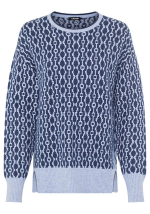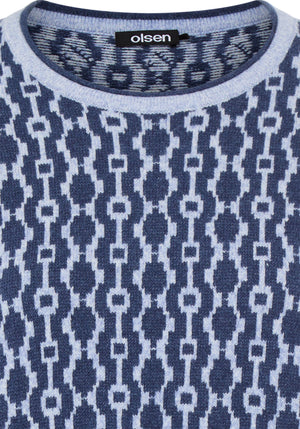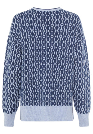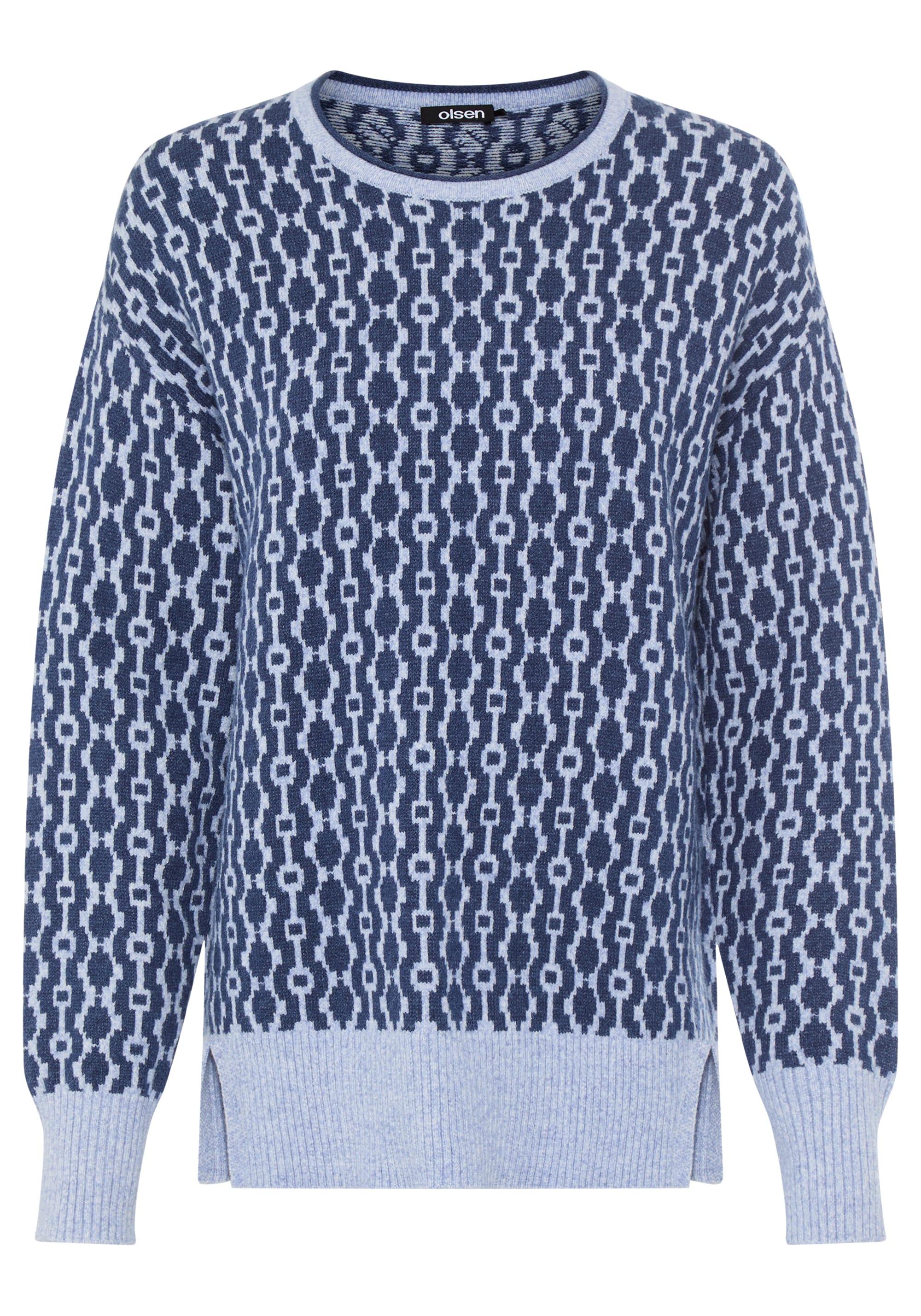 An allover retro ornamental pattern resembling keyholes makes a bold statement on this super-soft sweater in lovely shades of blue.