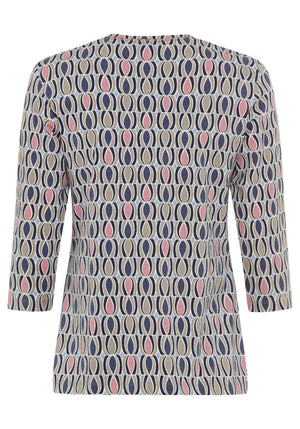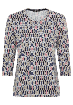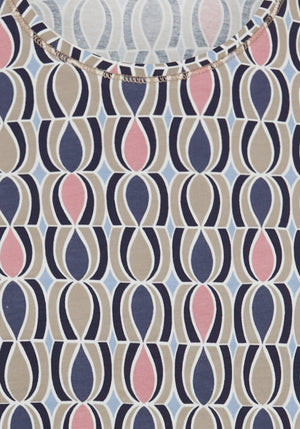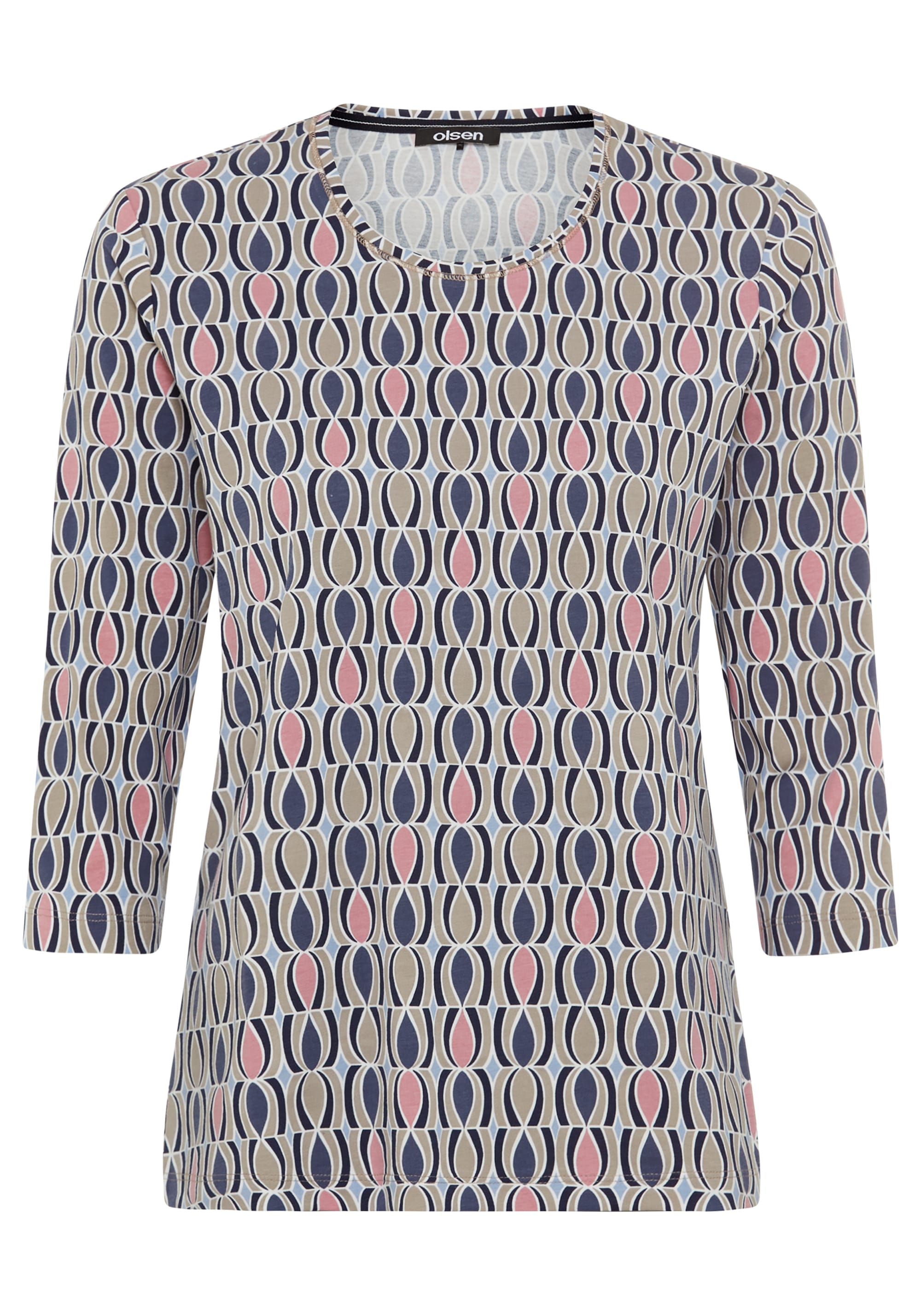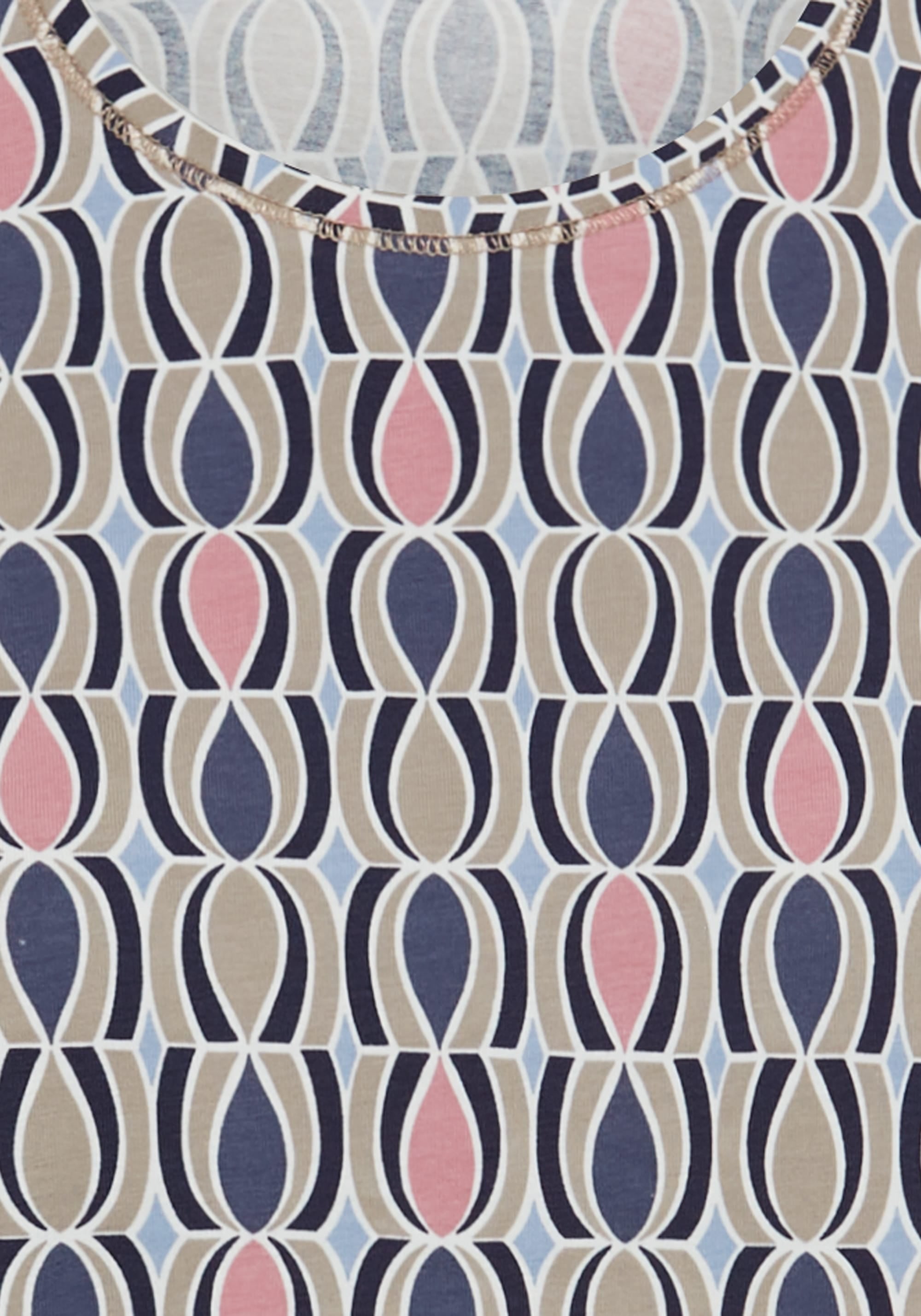 Evoking a vintage vibe, this 3/4 sleeve t-shirt features an allover retro ornamental print that makes a groovy statement.