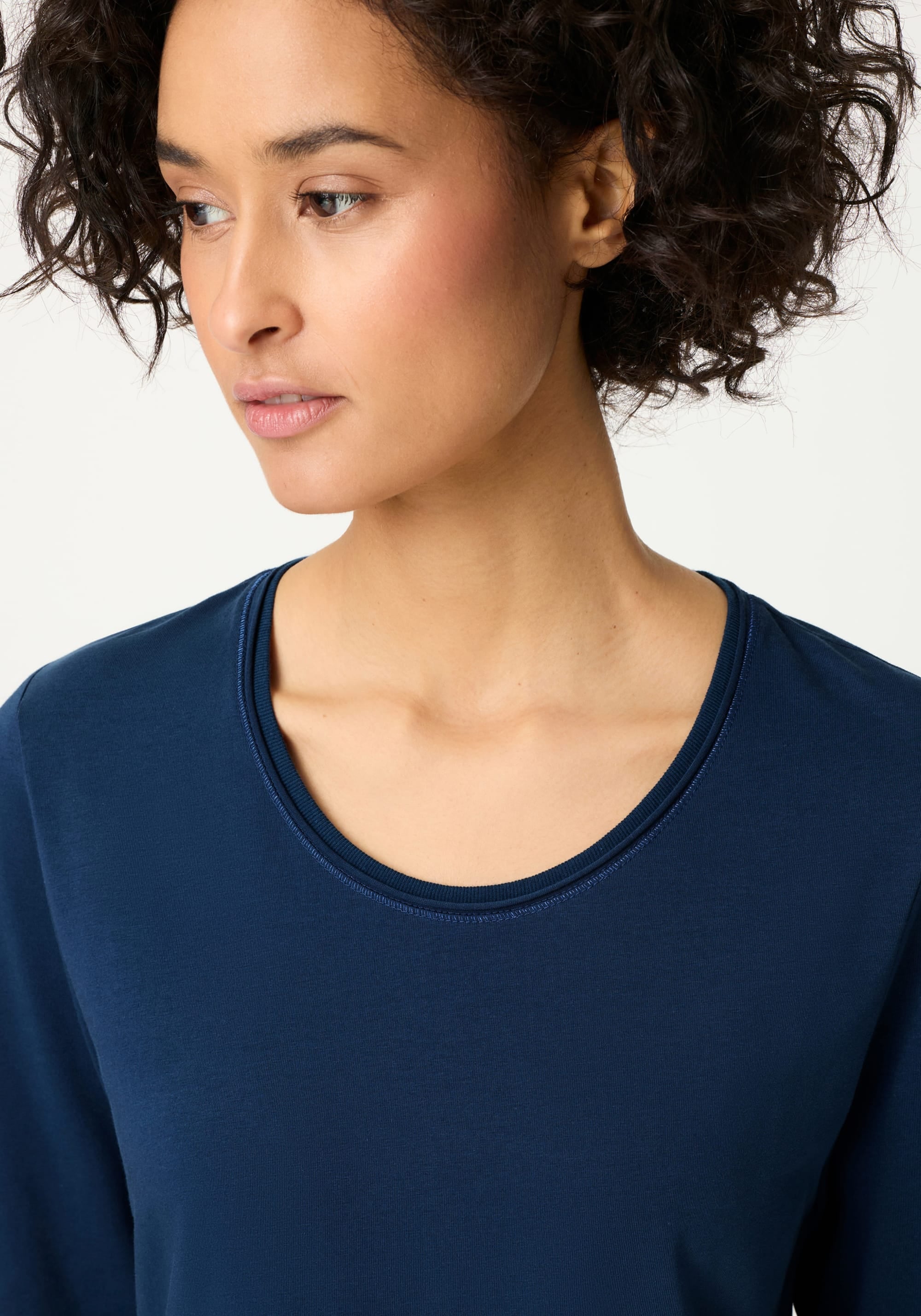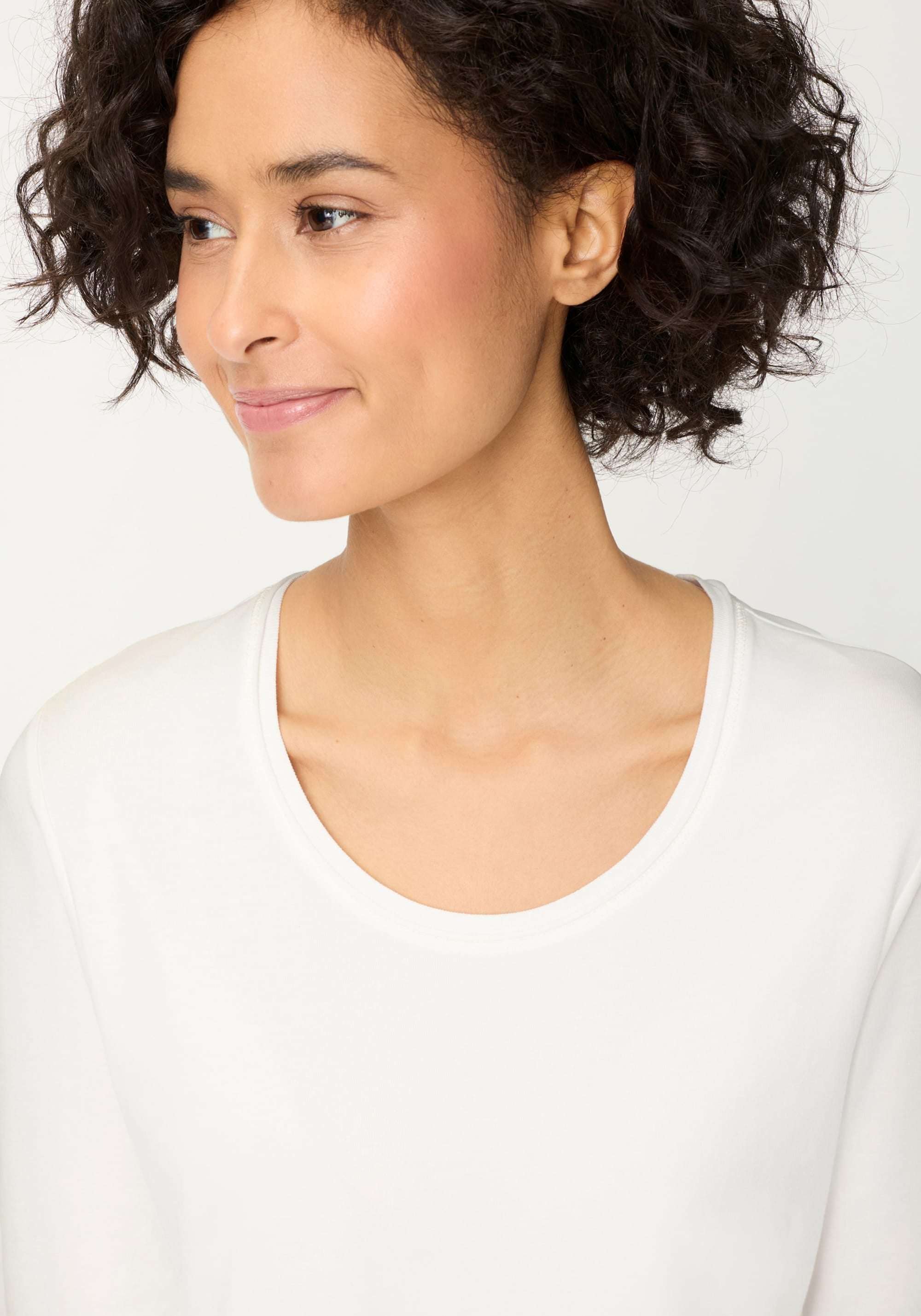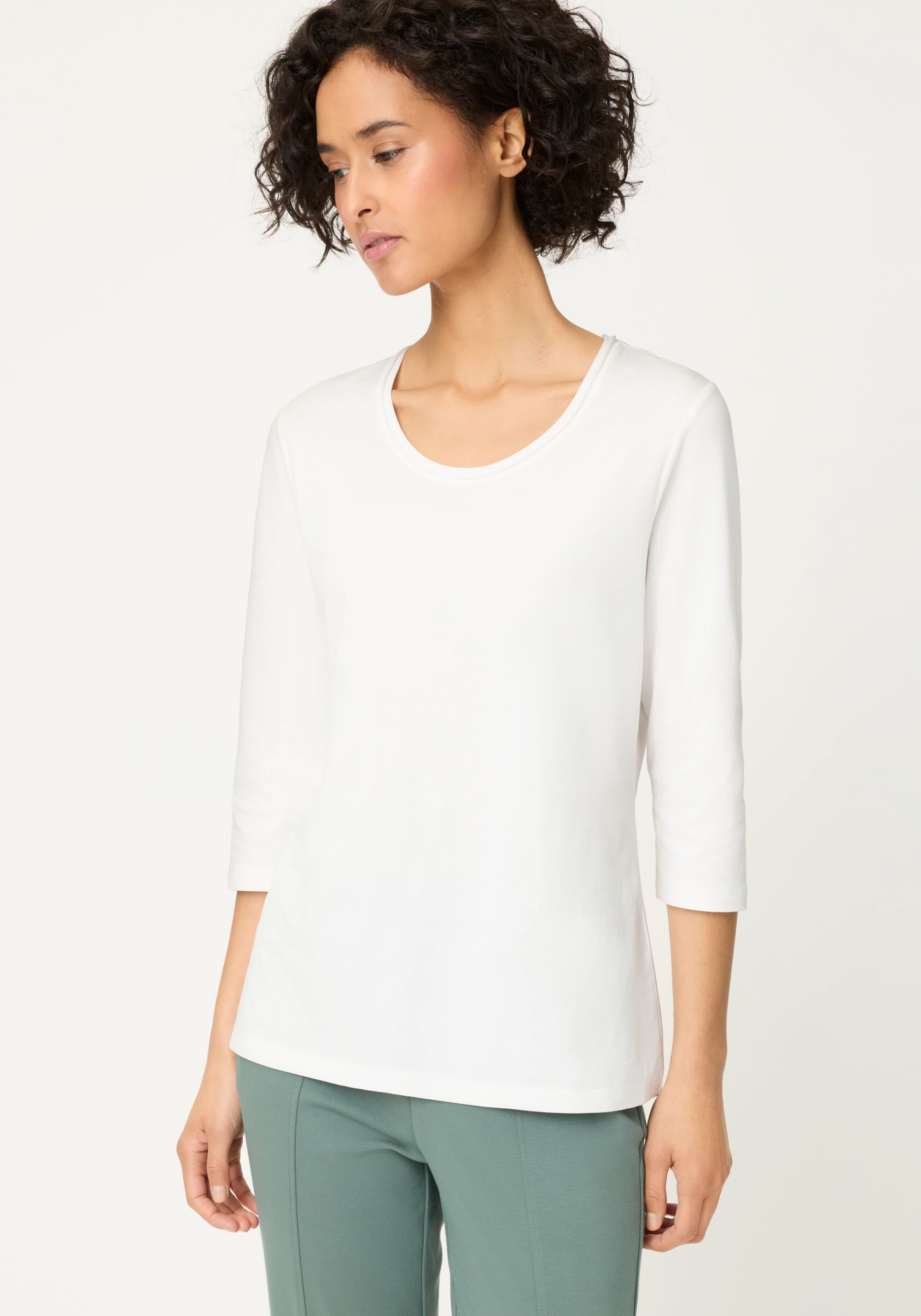A versatile everyday essential, this solid T-shirt stands out with its clean lines, feminine cut, and effortless simplicity – perfect worn on its own or layered under jackets and blazers.