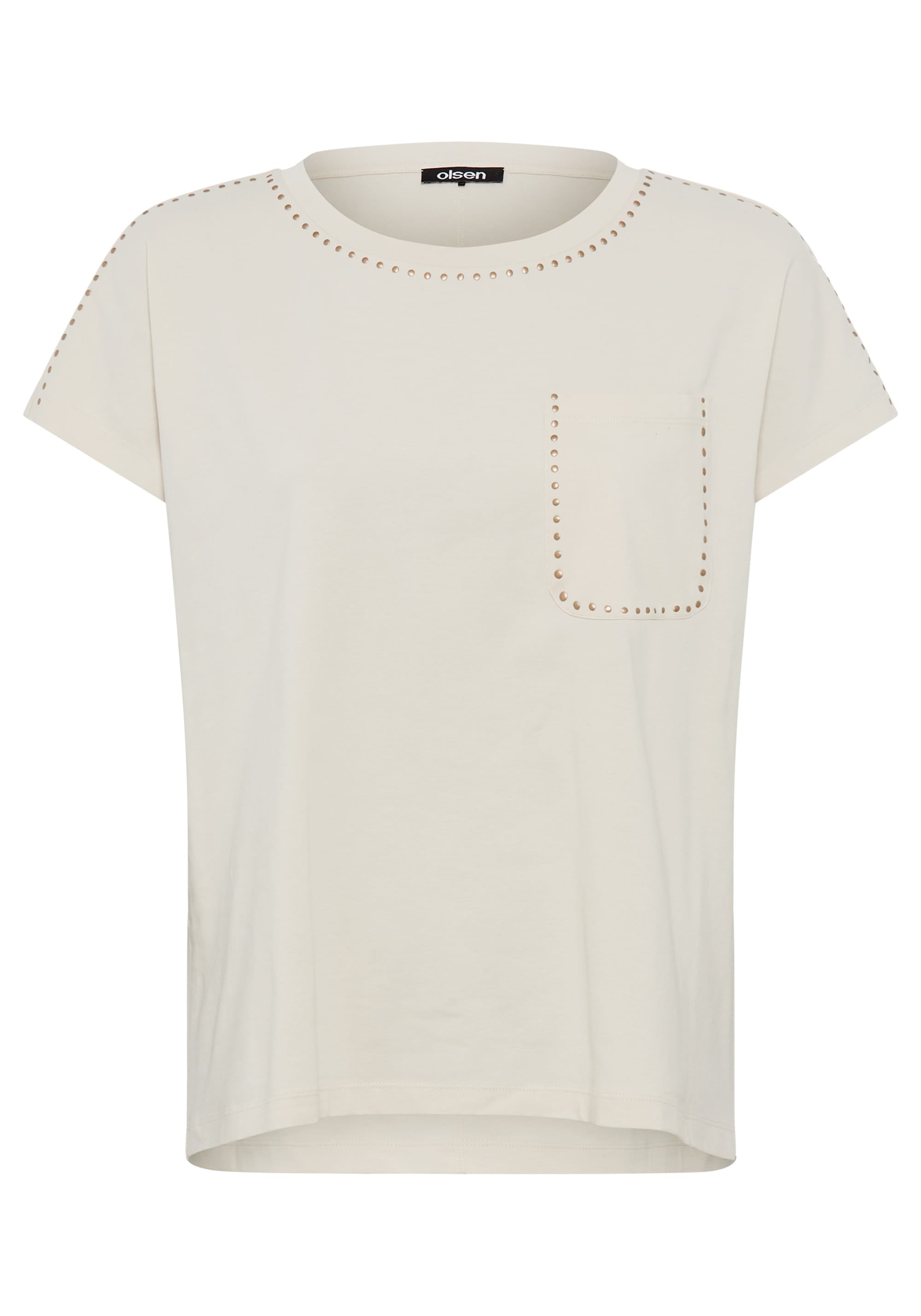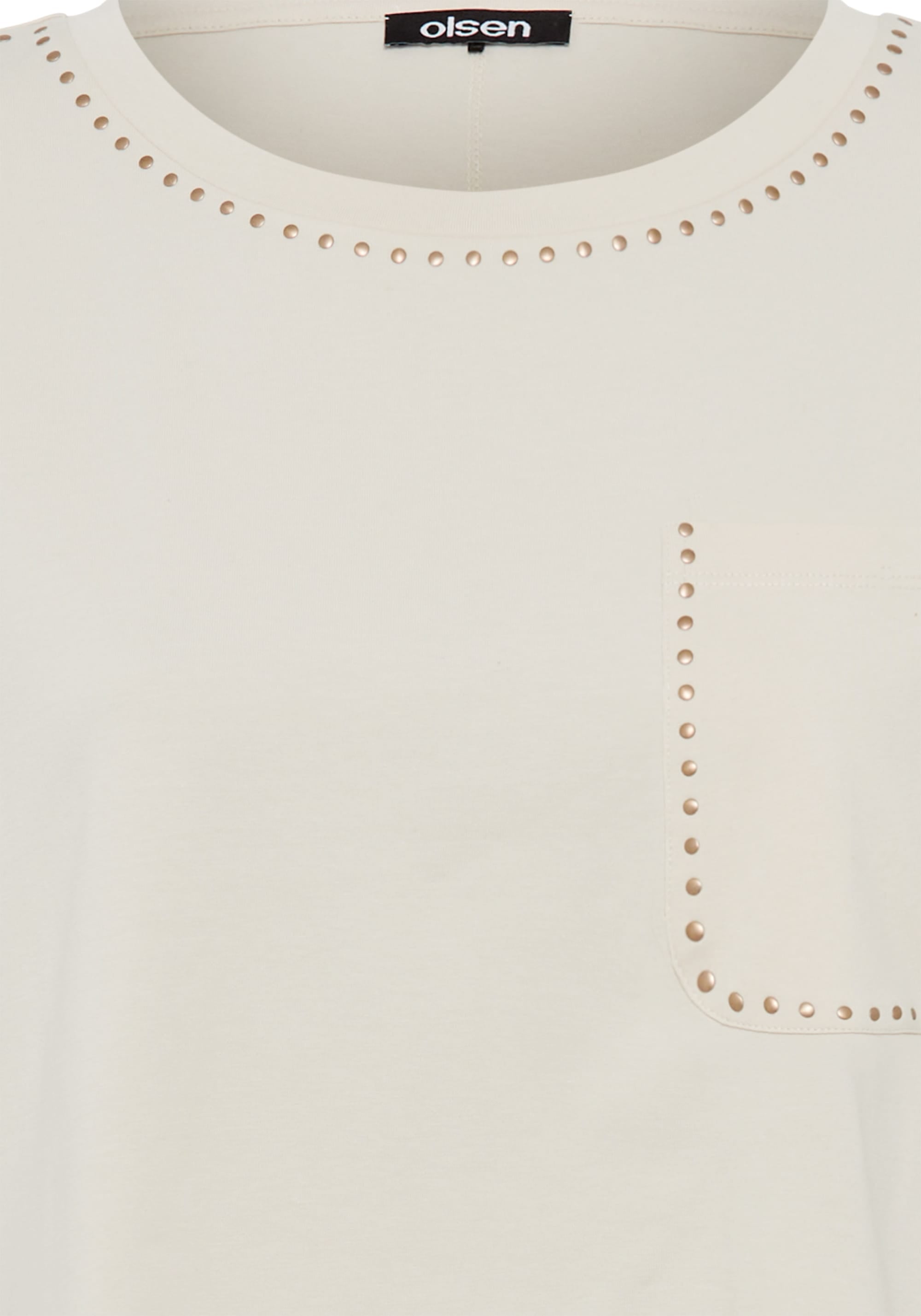 This t-shirt is an elevated basic, accented with bronze-tone metallic studs along the neckline, shoulder seams, and front patch pocket.
