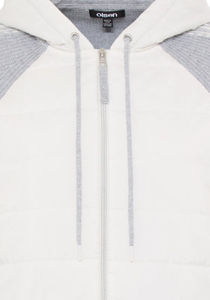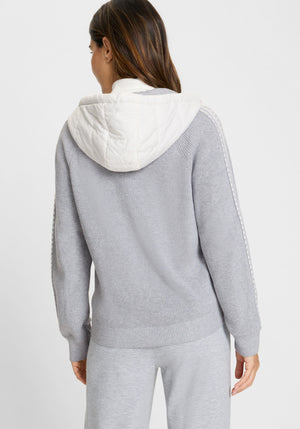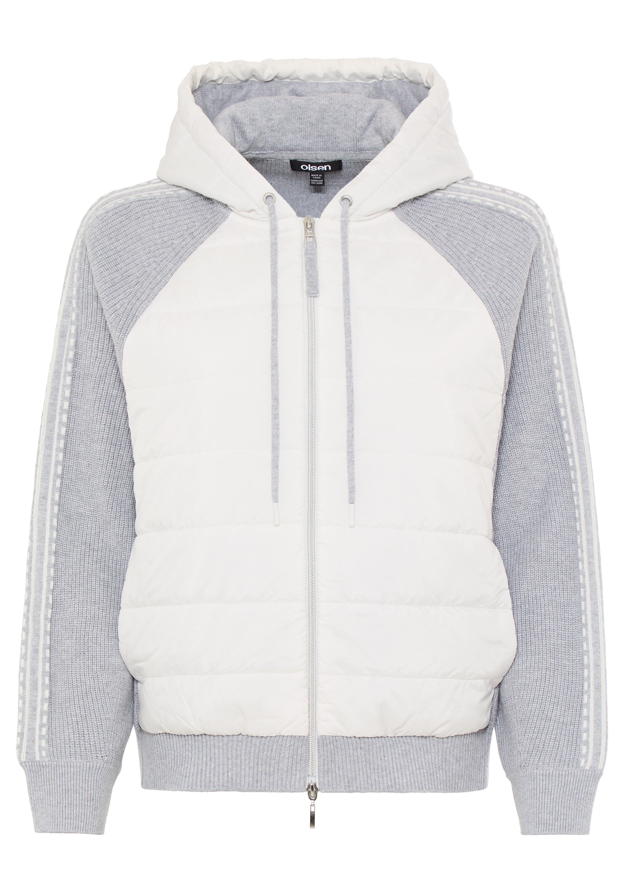This zip-front knit jacket combines quilted nylon on the front and hood with robust knit sleeves and back for a modern mixed-media look.